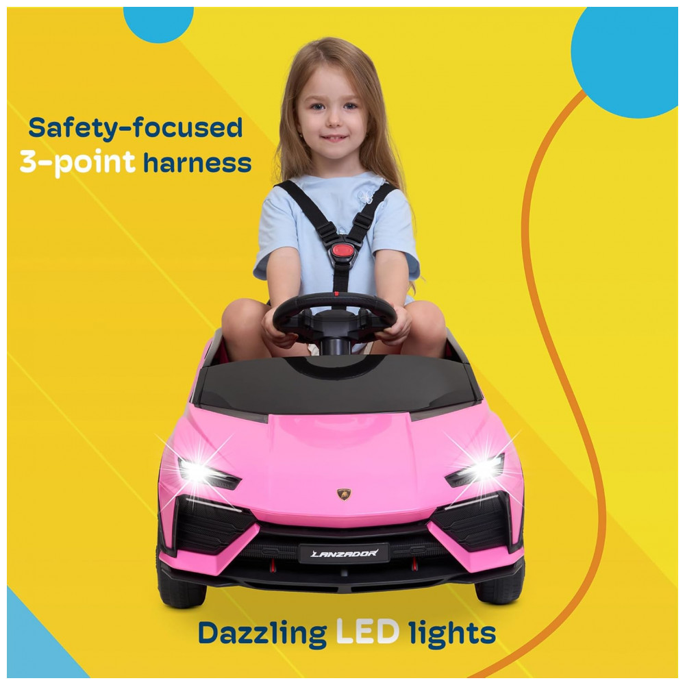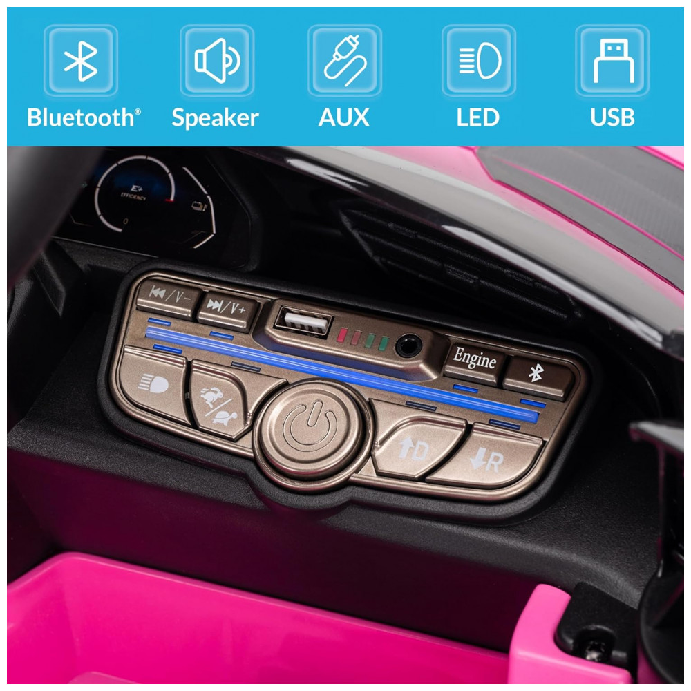 Vem com faróis LED, buzina, sons de motor e portas hidráulicas que balançam como um Lamborghini real. Além disso, há rádio integrado, cabo AUX, porta USB e Bluetooth que permite às crianças ouvir suas músicas favoritas enquanto jogam.