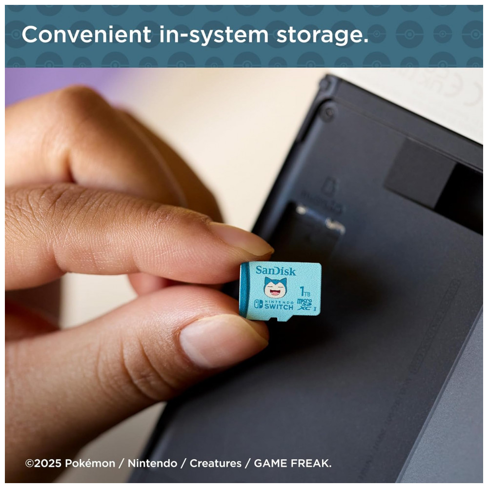 O cartão de memória SanDisk microSDXC 1TB Pokémon Snorlax foi desenvolvido para ampliar a capacidade de armazenamento do console Nintendo Switch, oferecendo espaço para instalação de uma grande quantidade de jogos, capturas de tela e vídeos em um único dispositivo. Trata-se de um modelo oficialmente licenciado para uso com Nintendo Switch, Nintendo Switch OLED e Nintendo Switch Lite, com validação de compatibilidade e testes específicos para esses sistemas.