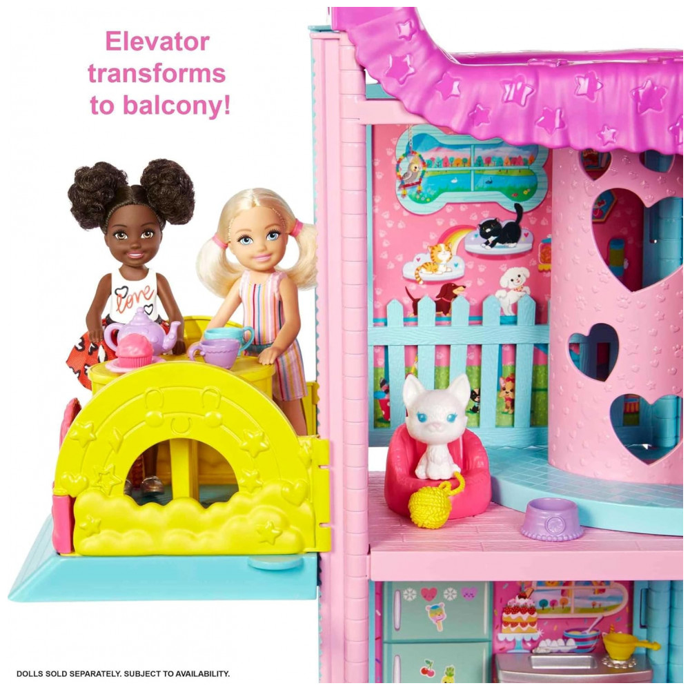 Dimensionada para bonecas Chelsea de 15 centímetros vendidas separadamente , esta casa de bonecas possui uma sala de estar e cozinha no primeiro andar, sala de animais e banheiro no segundo, e um quarto na cobertura no topo.