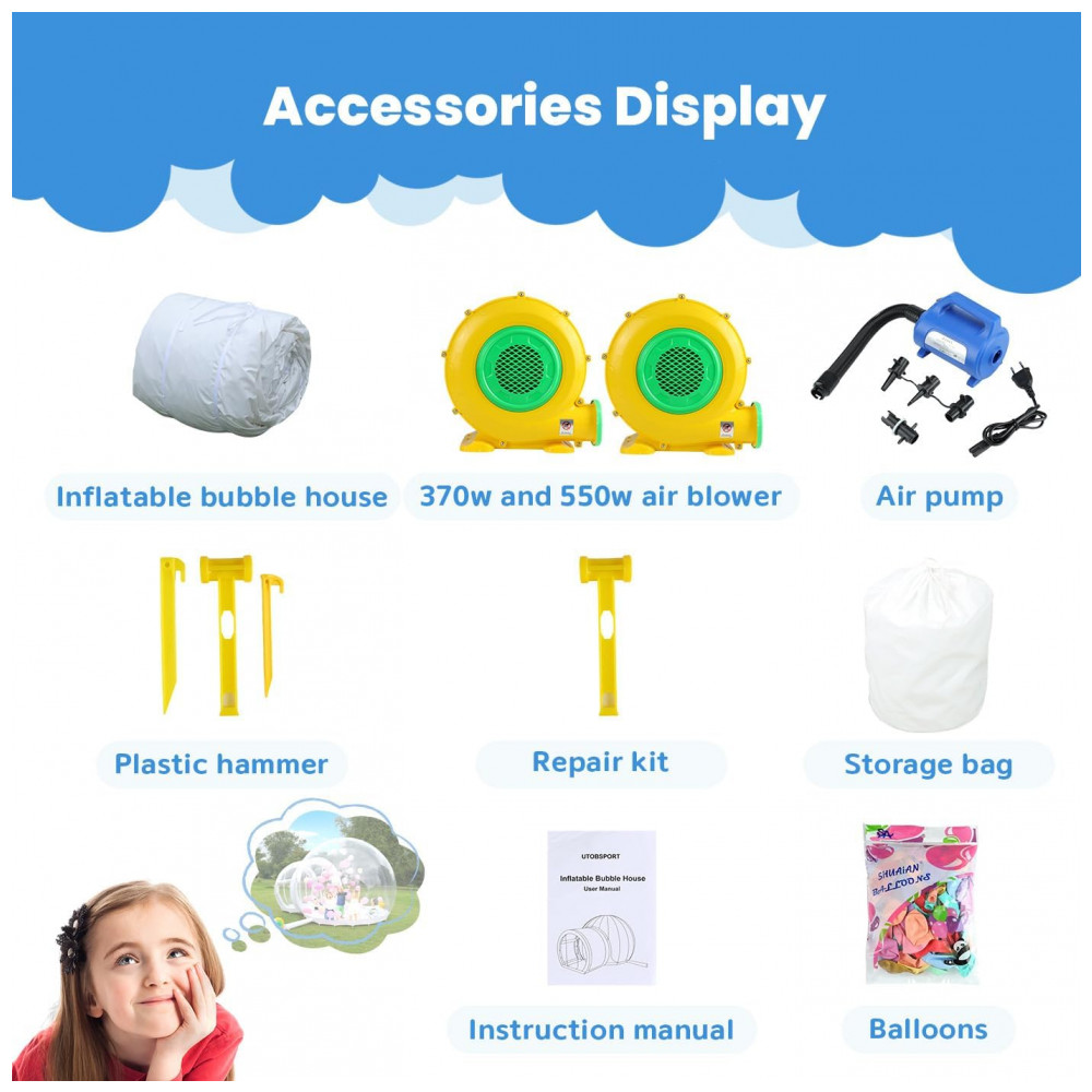 A Casa de Bolha Inflável é um amplo playground externo que pode acomodar várias crianças ou adultos, proporcionando um ambiente divertido e seguro para atividades ao ar livre. O material completamente transparente é ideal para uso externo, como playgrounds, quintais e gramados. Feita com material de alta qualidade, a tenda de bolha inflável é durável e resistente. Fácil de instalar, basta inflar com uma bomba de ar e soprador. A atmosfera mágica é garantida com 100 balões dentro da bolha, criando um cenário perfeito para casamentos, festas de aniversário e eventos. Tanto crianças quanto adultos podem se divertir!