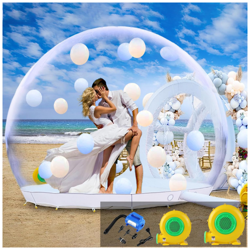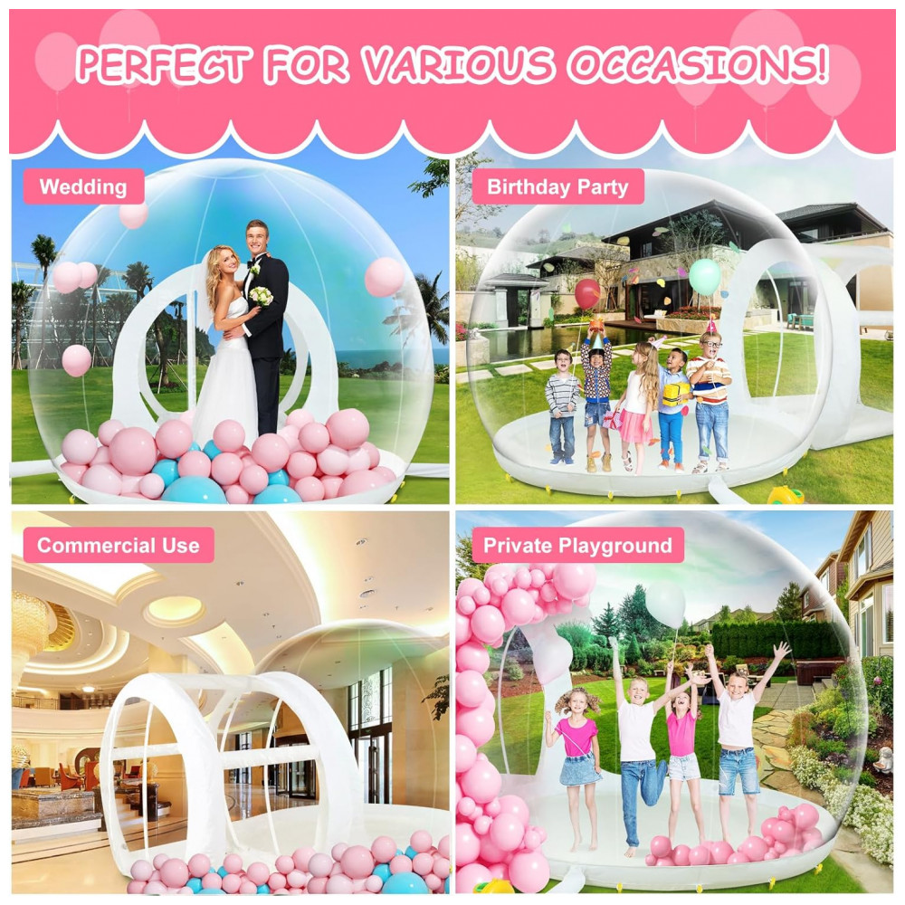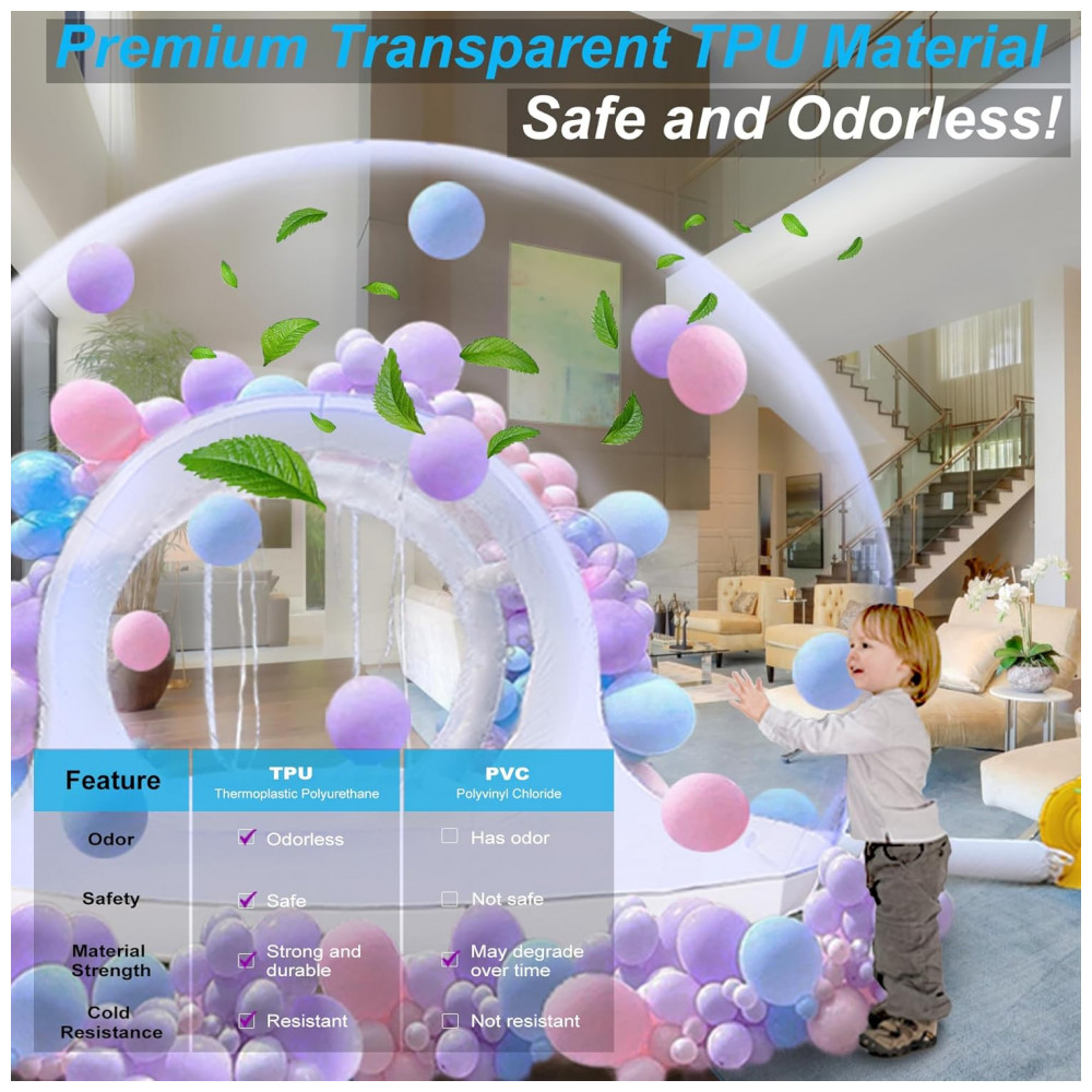 As casas de bolha infláveis UTOBSPORT TPU são feitas de material TPU transparente de alta qualidade, garantindo segurança, sem odor, elasticidade e durabilidade superiores em comparação com o PVC. Menos propenso a rasgar ou deformar no inverno. O design de duplo duto de ar, com um inflador de 370W e outro de 550W, garante inflação rápida e manutenção da forma. Fácil de instalar em apenas quatro passos simples. Versátil, ideal para entretenimento em casa, festas de aniversário, eventos ao ar livre, exposições comerciais, e muito mais. Também serve como decoração para atividades internas ou externas, parte de kits de pula-pula e playgrounds, criando uma atmosfera alegre. Adequado para crianças, adolescentes e adultos.