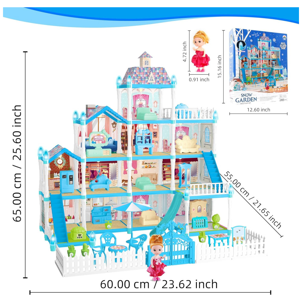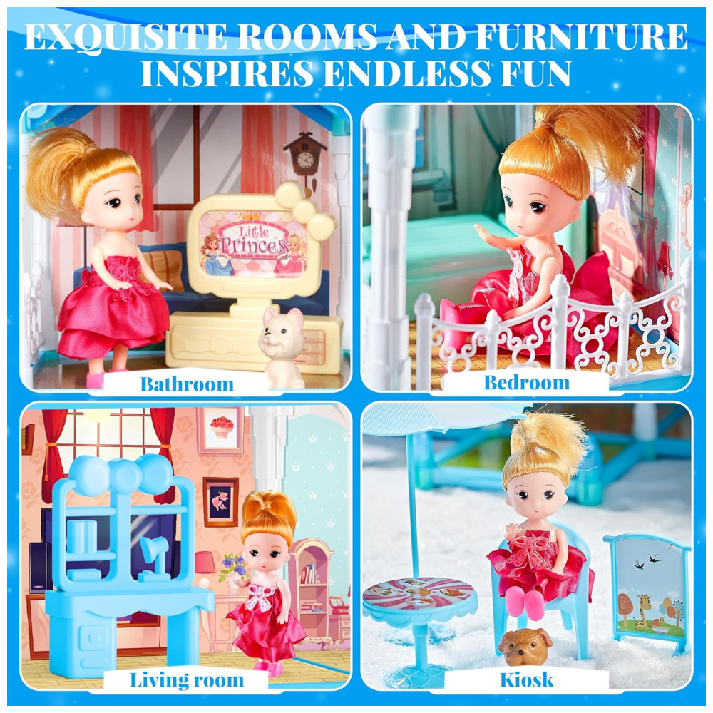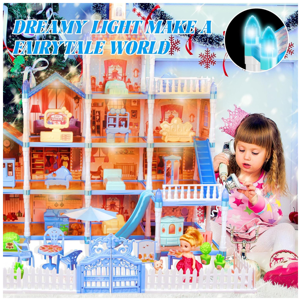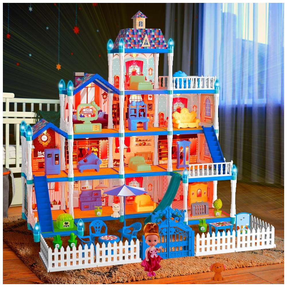 Casa de Bonecas com 11 Quartos Figuras de Boneca Cachorrinhos Móveis Acessórios e Luz LED para Crianças de 3 a 10 Anos OCTERIC Azul