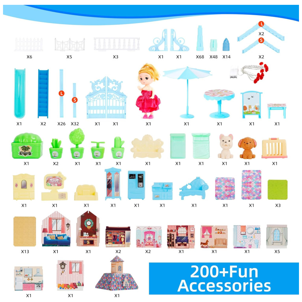 Além disso, ela vem com uma ampla gama de acessórios, incluindo móveis exclusivos, eletrodomésticos, escorregadores e outros acessórios para fácil movimentação e organização. As crianças podem misturar e combinar os acessórios de acordo com suas preferências, acrescentando um novo enredo às suas histórias. A Dream Princess Dollhouse é perfeita tanto para brincar sozinho quanto com amigos, permitindo que as crianças desenvolvam habilidades valiosas enquanto se divertem.