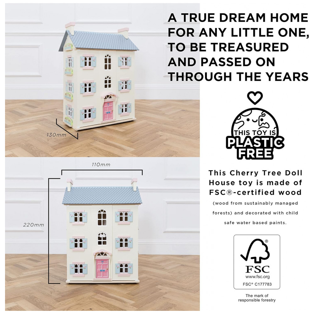 AMIGO DO AMBIENTE, QUALIDADE PREMIUM E Decorado com tintas não tóxicas e testado de acordo com os mais altos padrões de segurança. Inclui chaminés removíveis exclusivas e flores icônicas distintas nas floreiras das janelas. Esta linda casa de brinquedo de madeira foi premiada com ouro no Made For Mums Toy Awards. Deixe seu filho dar a sua boneca de brinquedo uma casa de bonecas dos sonhos