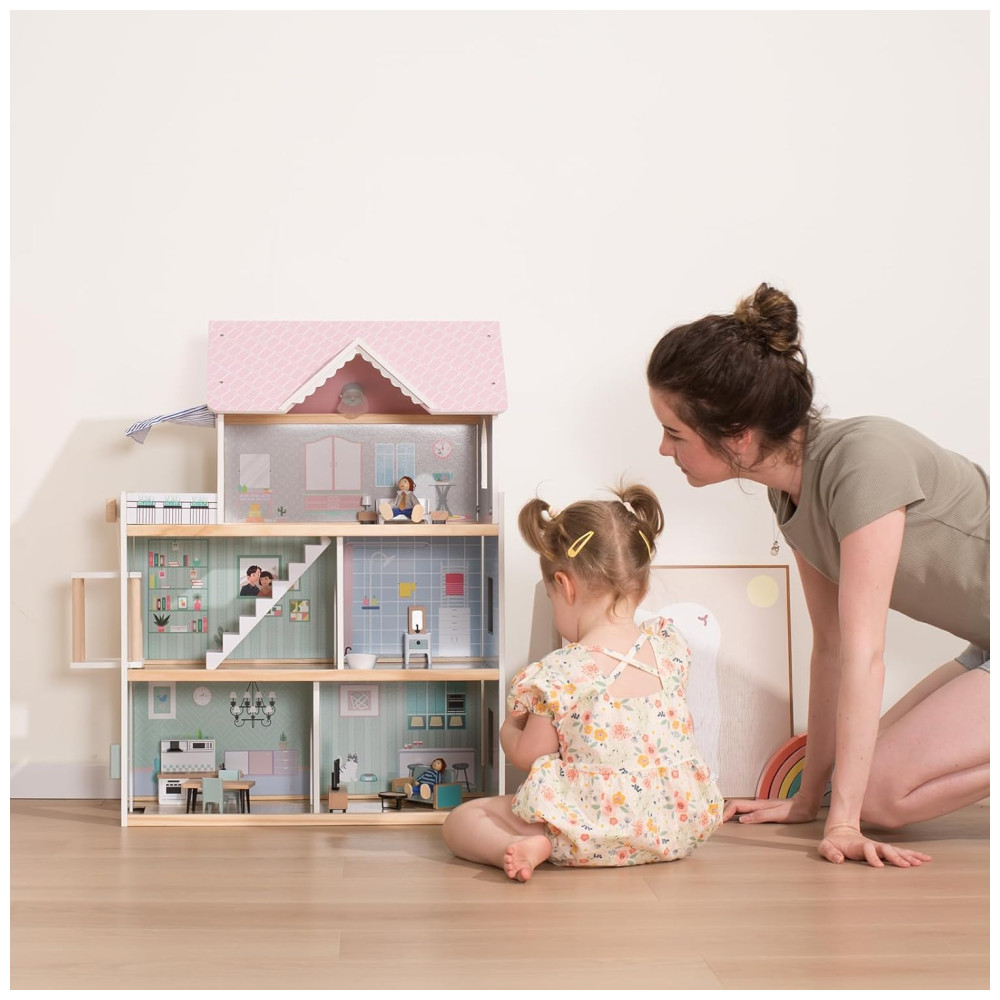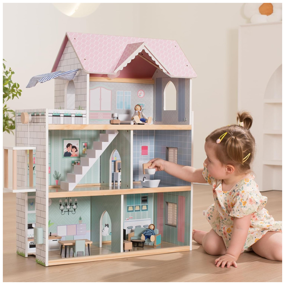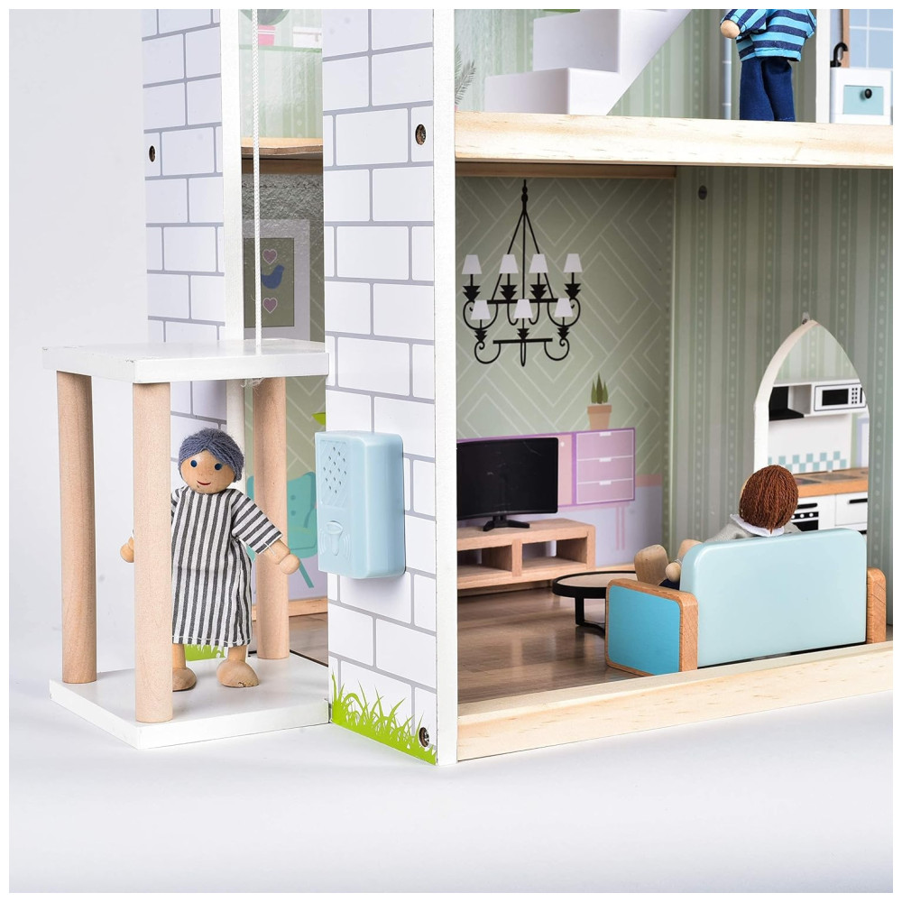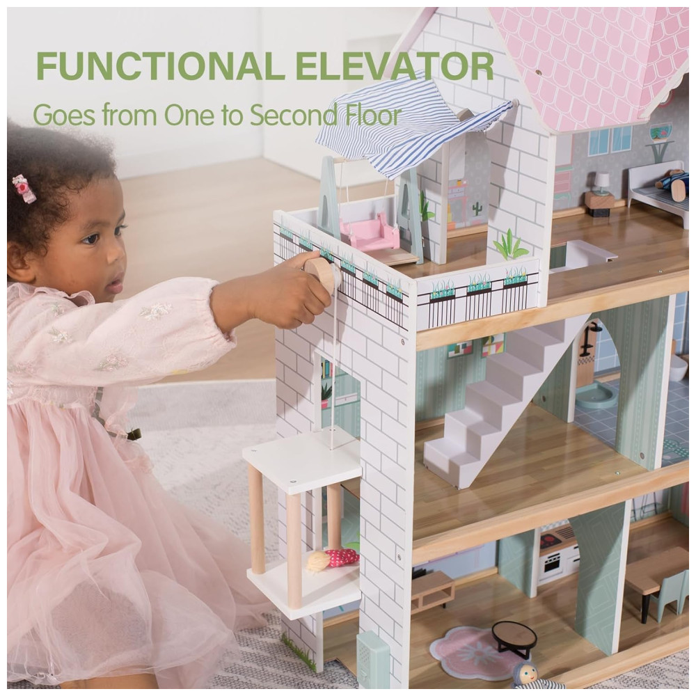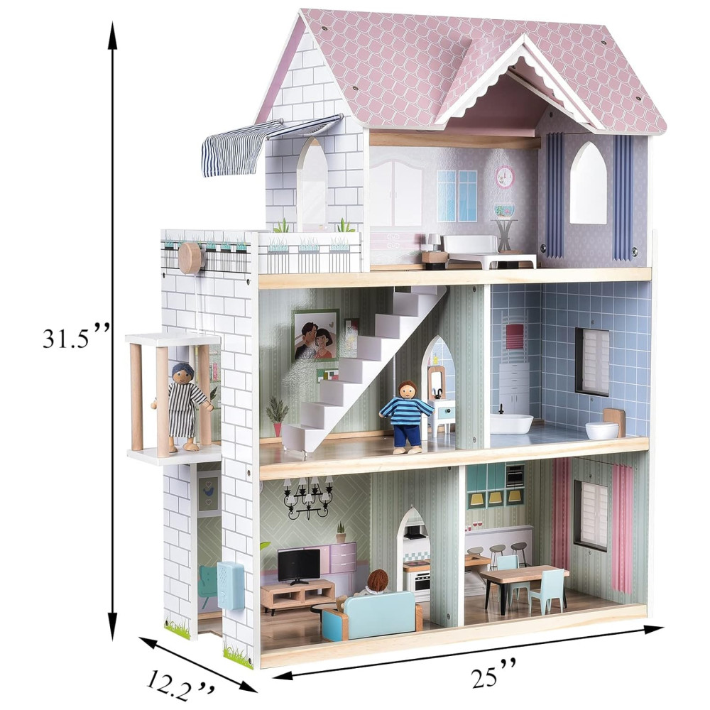 Esta casa de boneca é um conjunto de casa multistória de madeira, mobiliado e com um elevador funcional. Com 5 quartos, varanda e medindo 0,79 metros de altura por 0,61 metros de largura, esta casa é perfeita para bonecas de família com cerca de 12 centímetros de altura. Além disso, a casa pode acomodar móveis com cerca de 18 centímetros de altura da Barbie, HAPE, Calico Critters e Gabby.