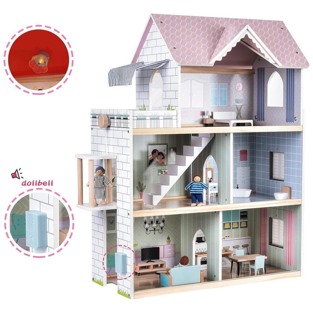 Casa de Bonecas de Madeira com Elevador 15 Peças de Móveis Campainha e Luz para Crianças de 3 a 12 Anos Golitoys Rosa e Roxo