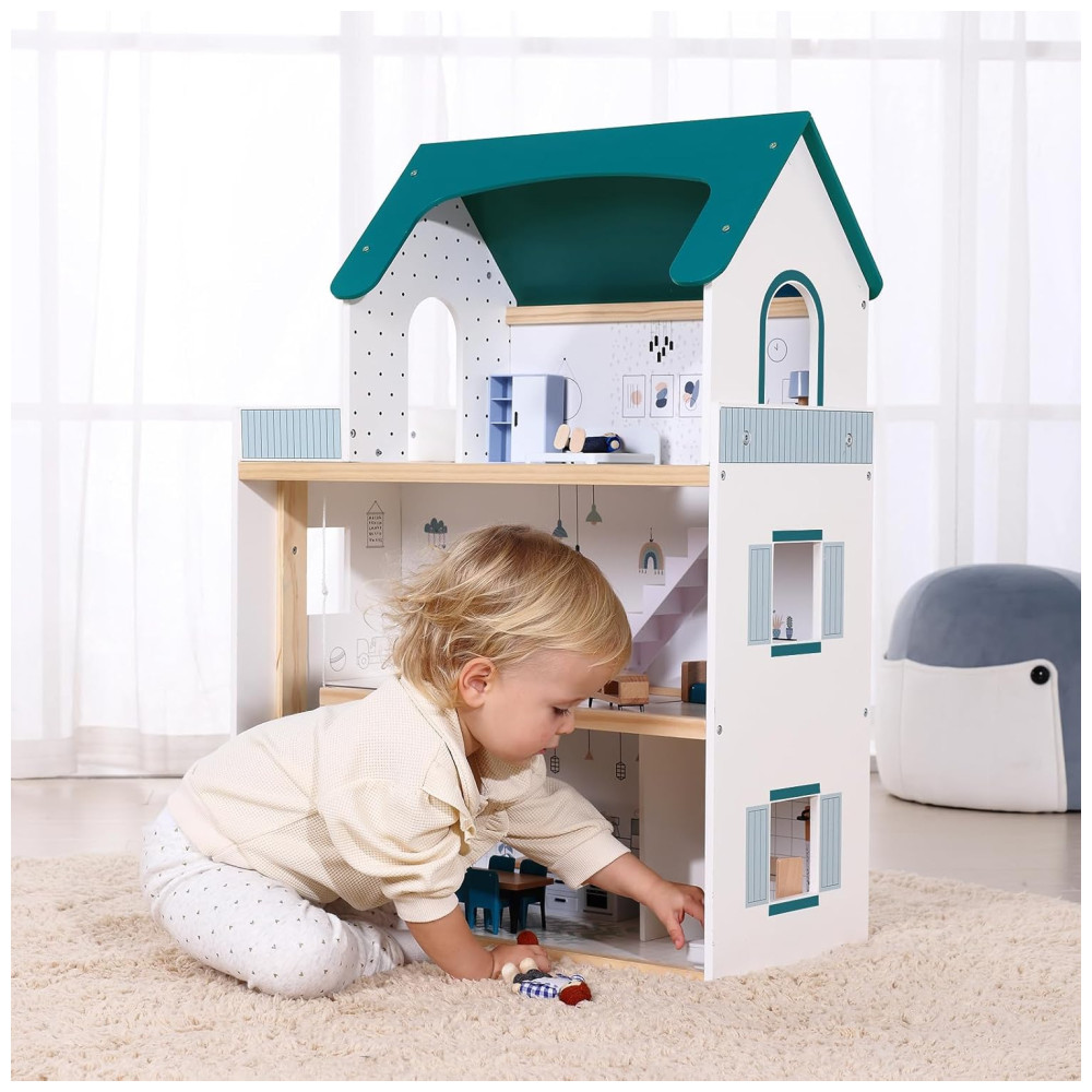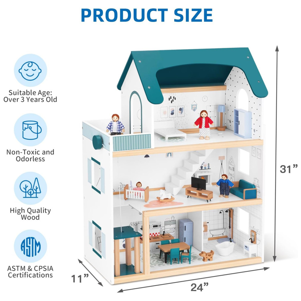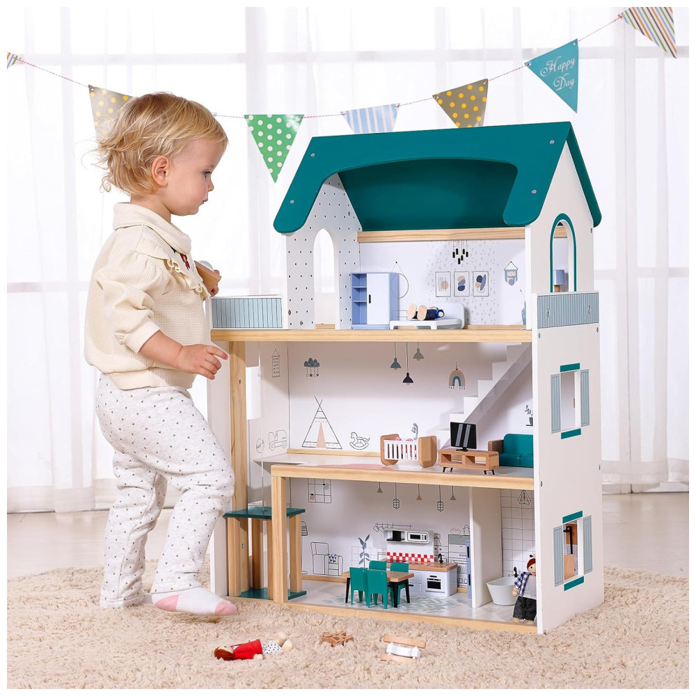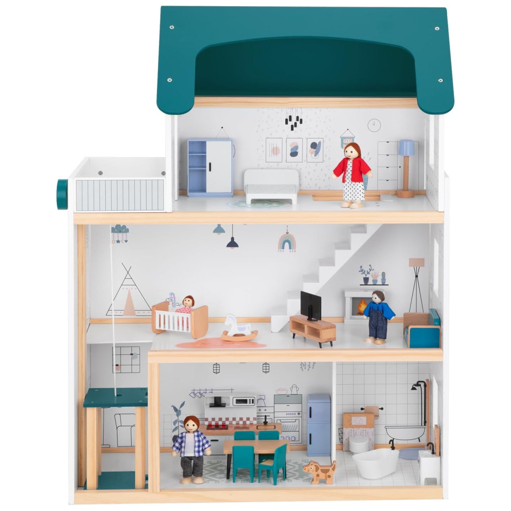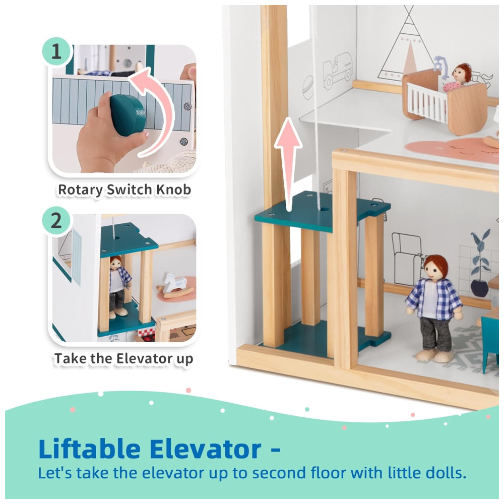 Casa de Bonecas de Madeira com Elevador 21 Peças de Móveis 4 Bonecas e 1 Animal de Estimação para Crianças de 3 a 12 Anos TookyToy Verde e Branco