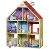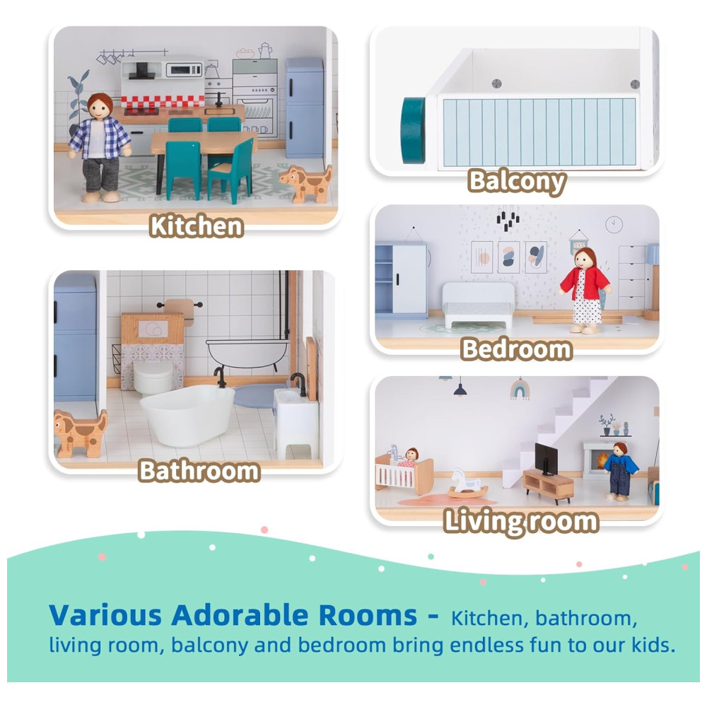 CASA DE BONECAS DE MADEIRA Com 3 andares e 5 quartos, esta casa de bonecas de madeira é perfeita para acomodar bonecos de até 46 polegadas. Cada quarto vem equipado com um conjunto de móveis realistas e o papel de parede listrado e esquema de cores brilhantes dão à casa um estilo moderno. Através do cosplay de casa de bonecas, as crianças podem desenvolver um senso de família.