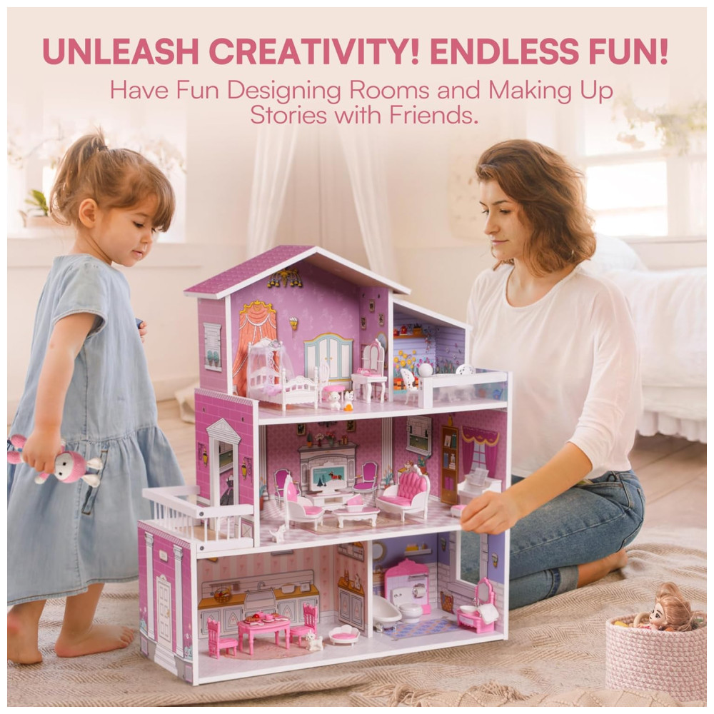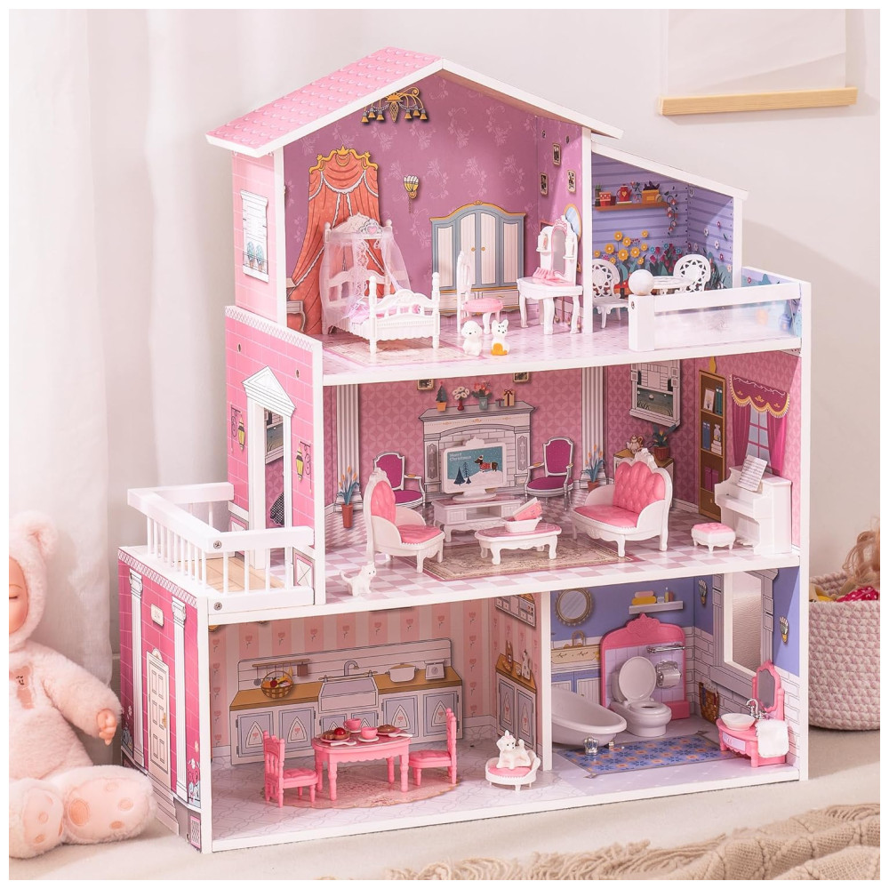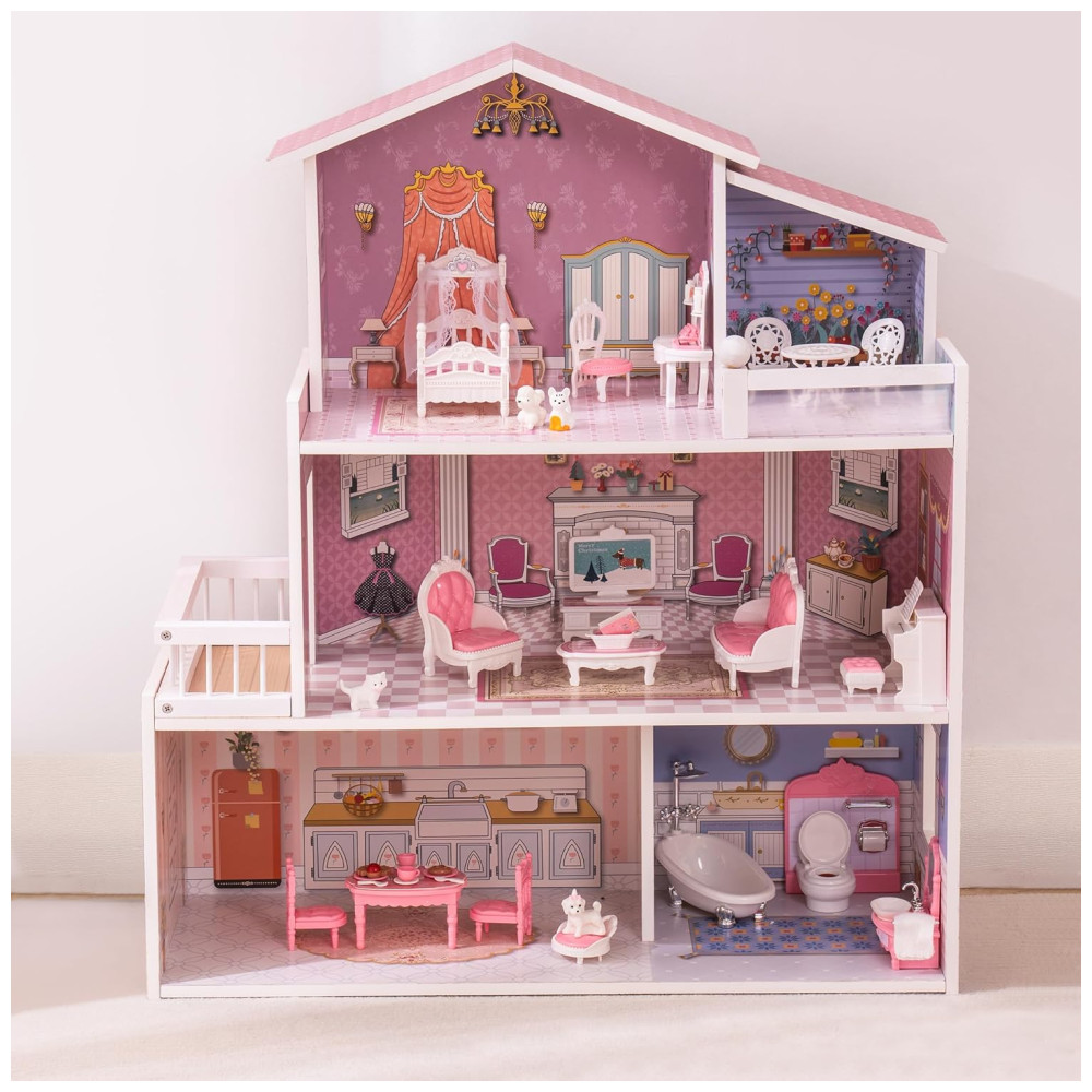 Casa de Bonecas de Madeira ROBUD 3 Andares 5 Quartos 24 Peças de Mobília Brinquedo de Faz de Conta Presente para Crianças