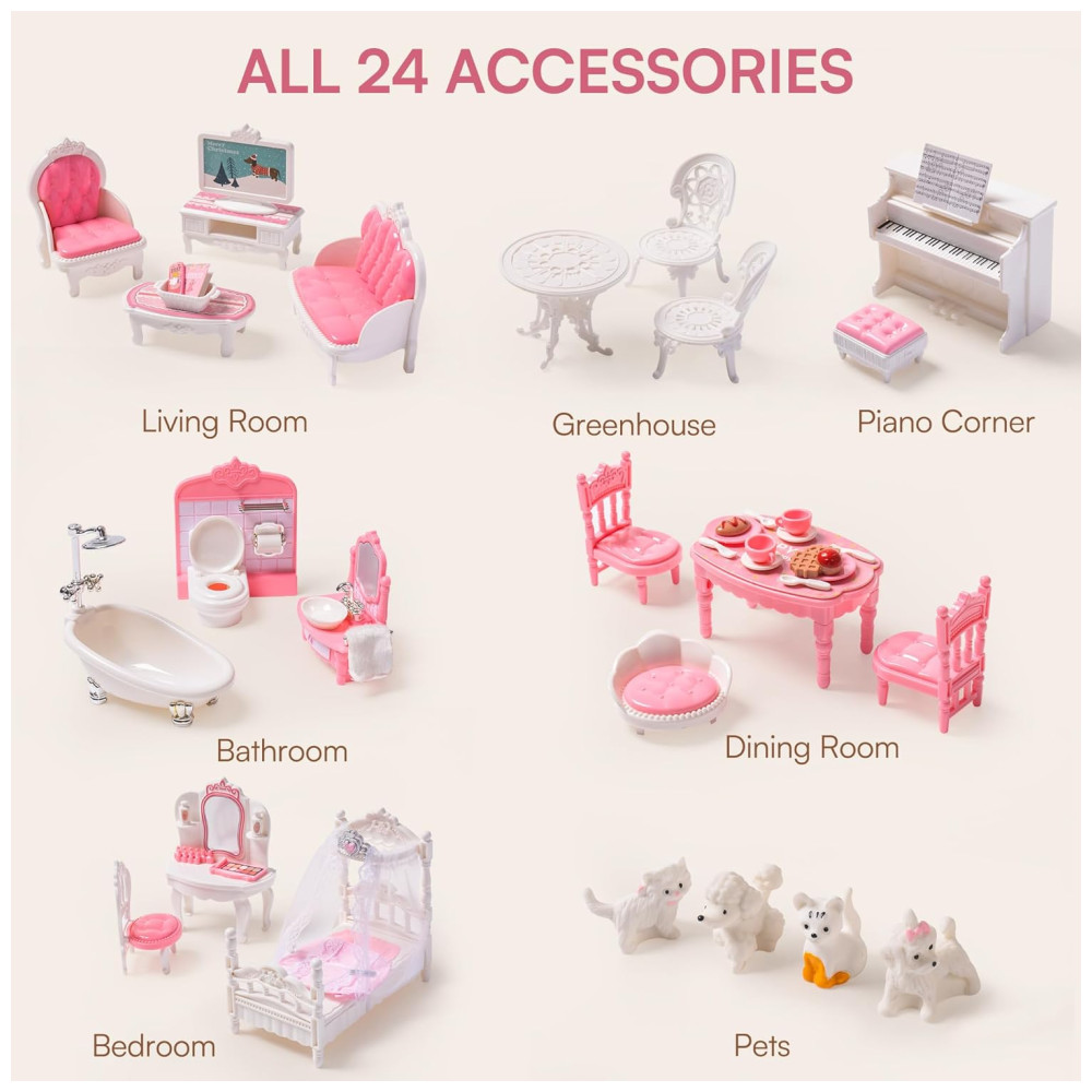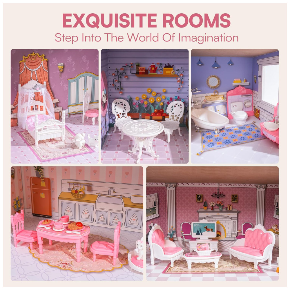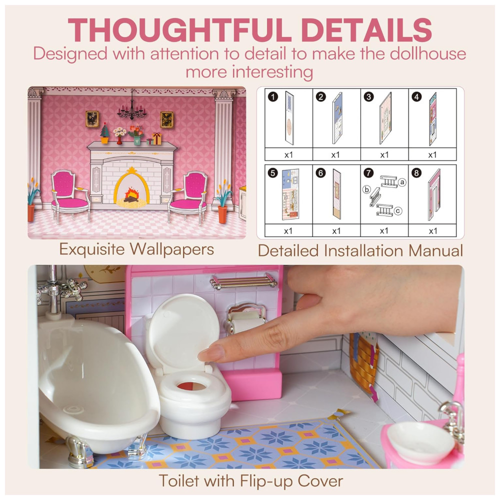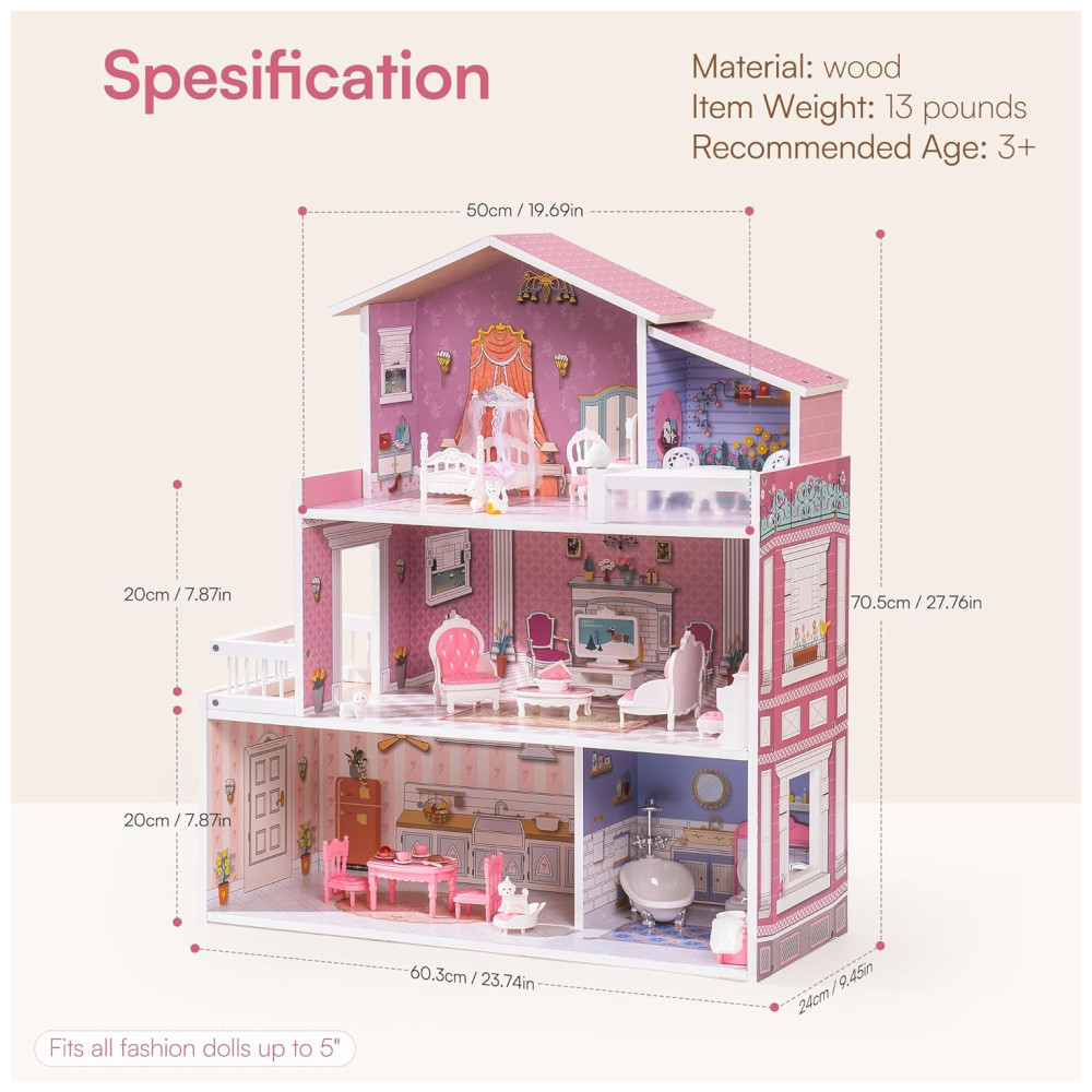 Casa de Bonecas de Madeira ROBUD 3 Andares 5 Quartos 24 Peças de Mobília Brinquedo de Faz de Conta Presente para Crianças