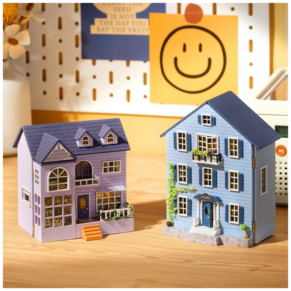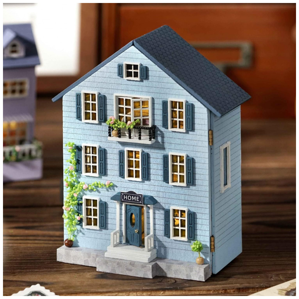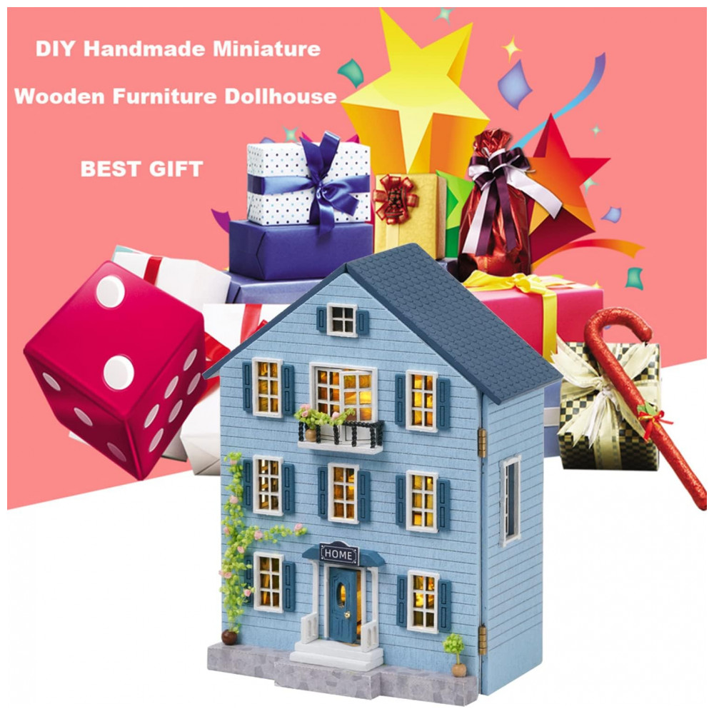 Casa de Bonecas em Miniatura feita em Madeira com Detalhes 3D e LEDS Roroom Azul