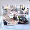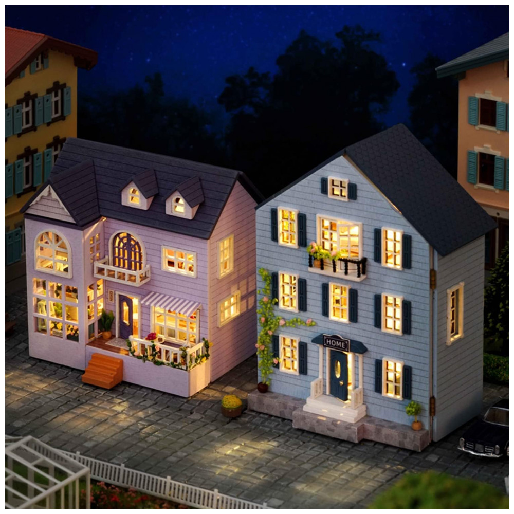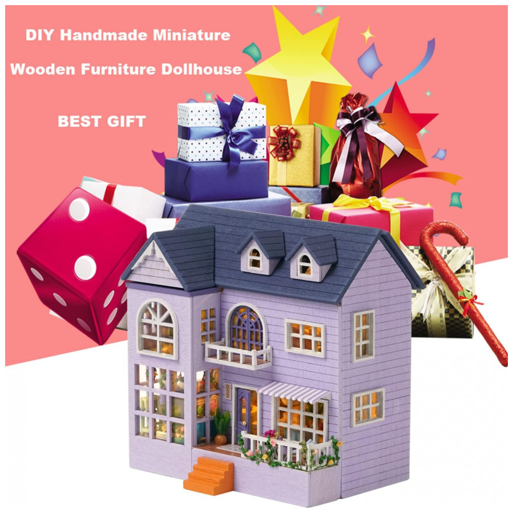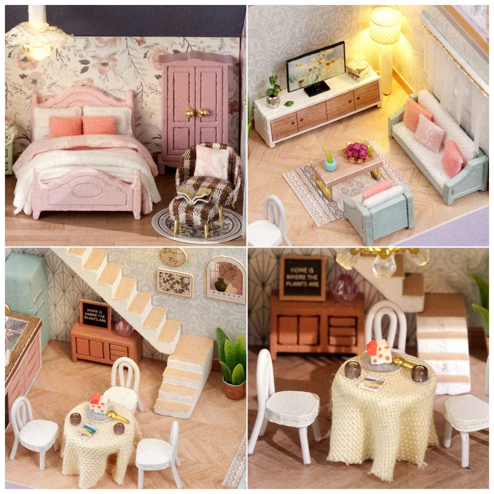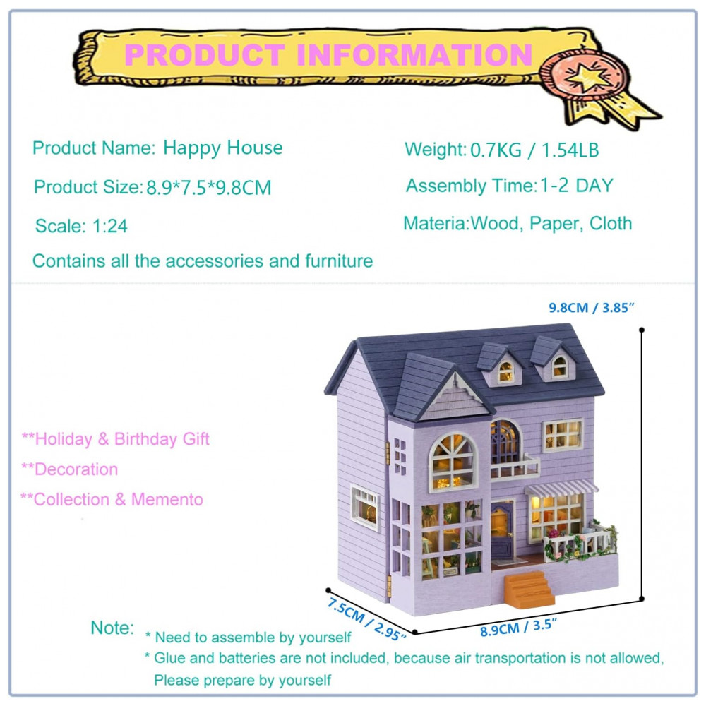 PACOTE INCLUÍDO O kit de casa de boneca em miniatura DIY como exibição de imagem e instrução em inglês, enviamos LED extra. O LED torna a casa de boneca mais romântica, finalmente, temos uma caixa de embalagem colorida que faz com que pareça um presente perfeito.