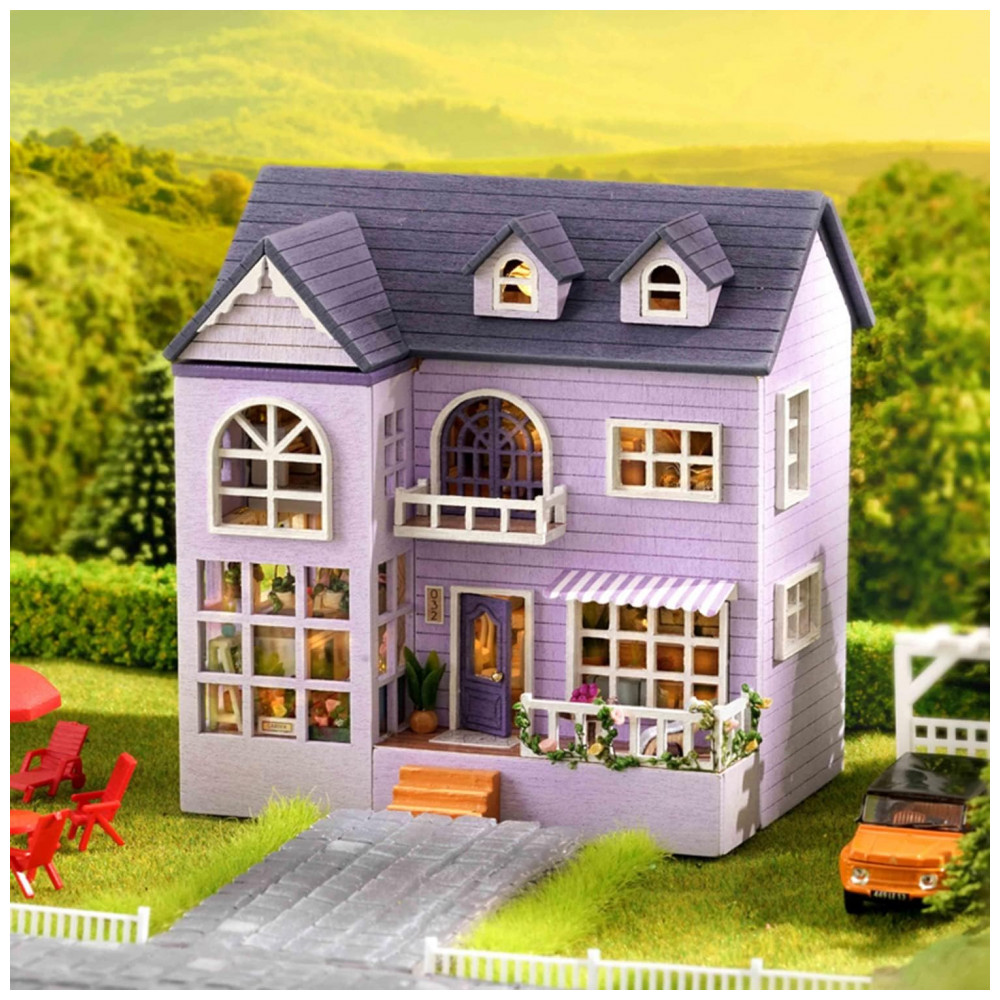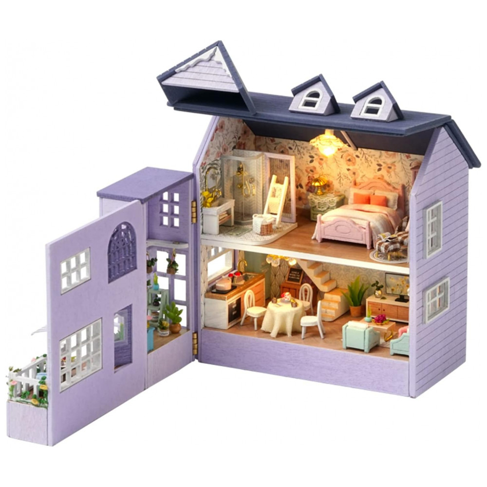 Casa de Bonecas em Miniatura feita em Madeira com Detalhes 3D e LEDS Roroom Roxa