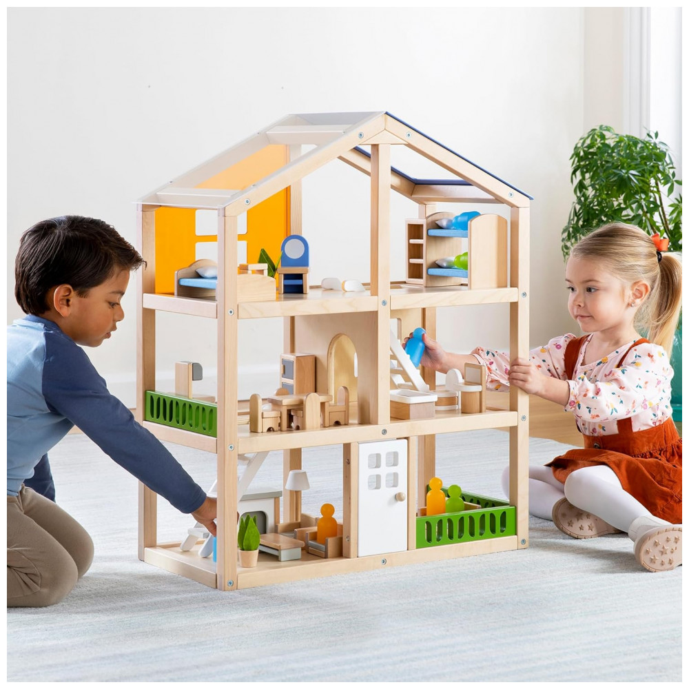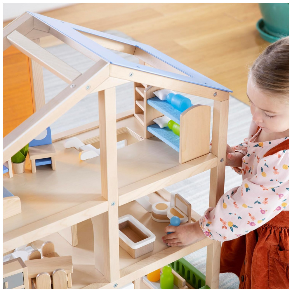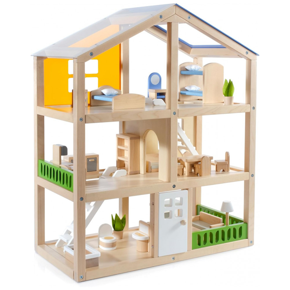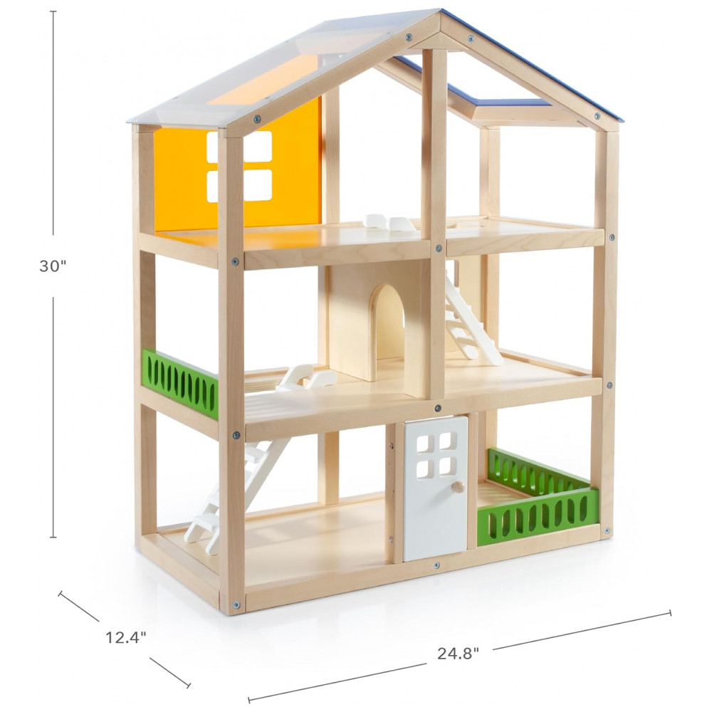Casa de Bonecas Guia Guidecraft Madeira Natural 3 Andares Detalhes em Acrílico Para Crianças 3+ Modelo Modern Home