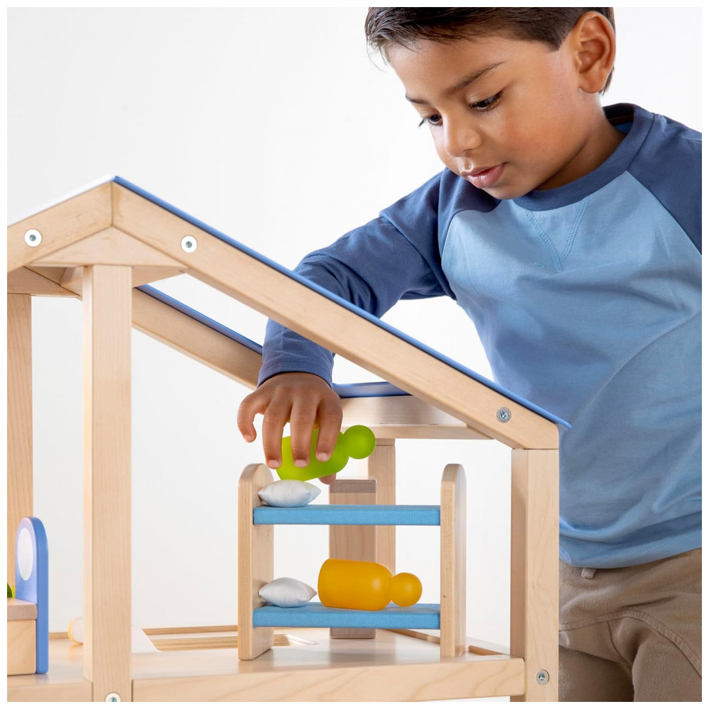 Projetada para crianças a partir de 3 anos, a casa possui três andares que permitem múltiplas áreas para brincadeiras simultâneas, estimulando jogos de faz de conta. Inclui portas, janelas e uma escada removível que ampliam as possibilidades de interação e dramatização.