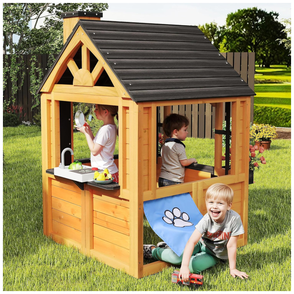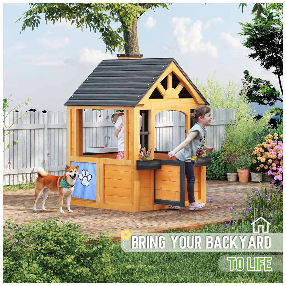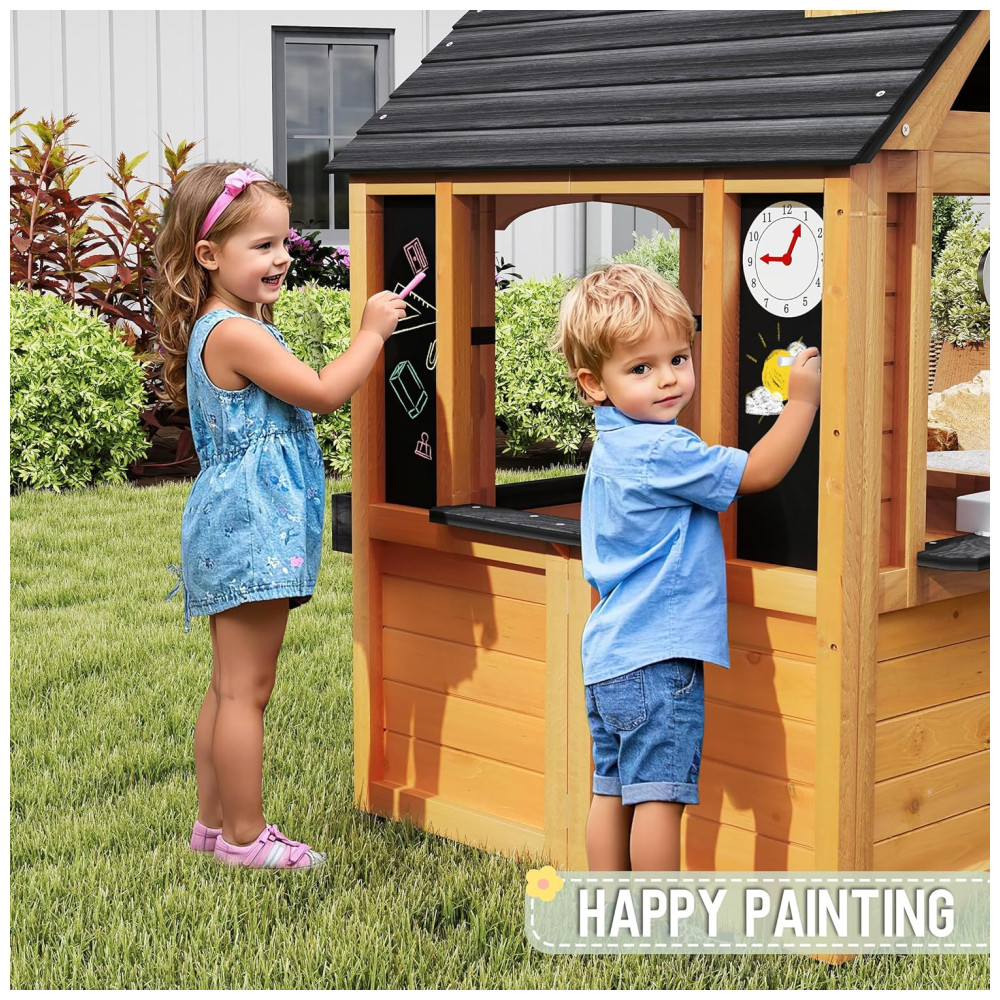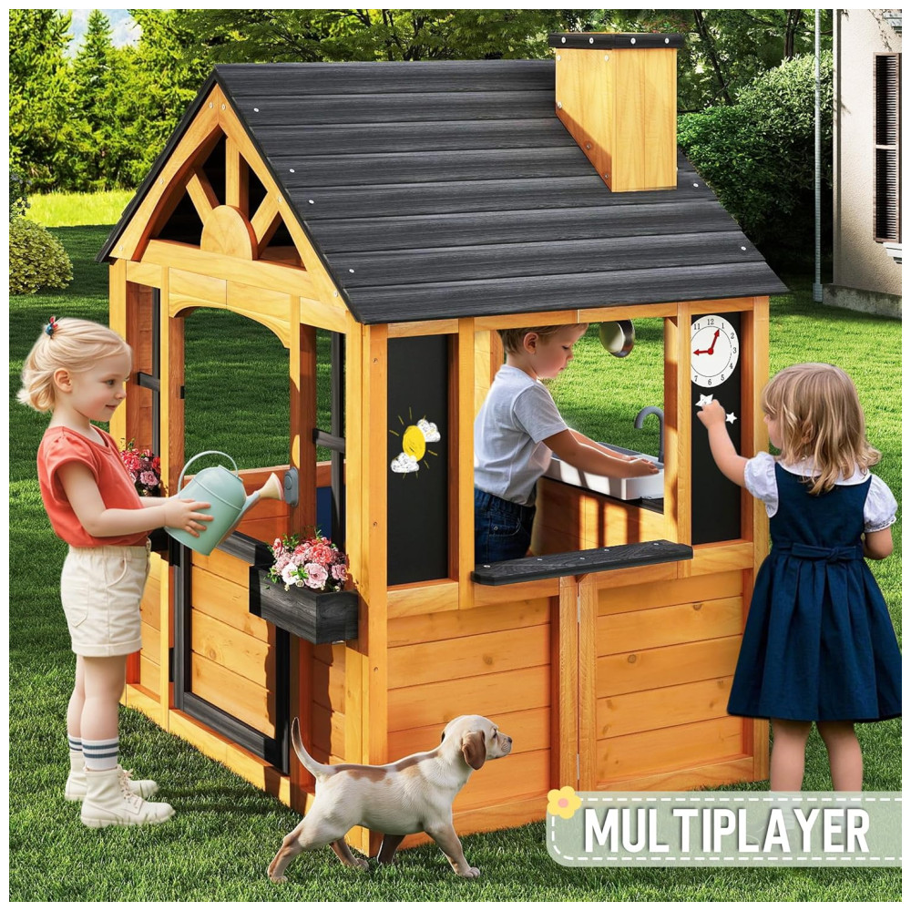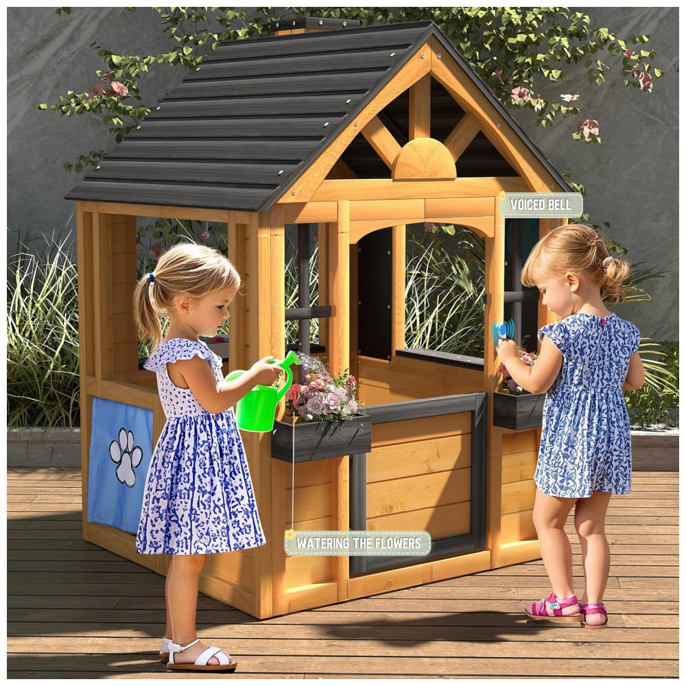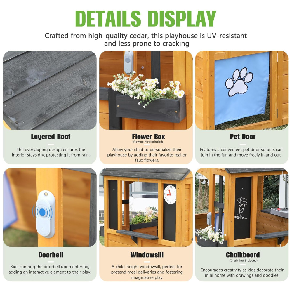 Repleta de diversão e prática, esta casa de brincar é feita de madeira de cedro premium e tingida com produtos à base de água, oferecendo um visual natural e acolhedor para valorizar seu quintal. A resistência natural do cedro às condições climáticas adversas garante um ambiente de brincadeiras seguro e duradouro ao longo dos anos. Com um design multifuncional que inclui uma pia, fogão, utensílios, lousa, campainha e relógio, esta casa de brincar ao ar livre Jocoevol foi projetada para inspirar a criatividade das crianças. Elas podem cozinhar, criar arte ou jardinar, explorando a imaginação e desfrutando de horas de diversão criativa. Além disso, com áreas como campainha, porta para animais de estimação, suportes para vasos e chaminé, a casa promove o faz de conta, ajudando as crianças a desenvolver amizades e habilidades sociais essenciais.