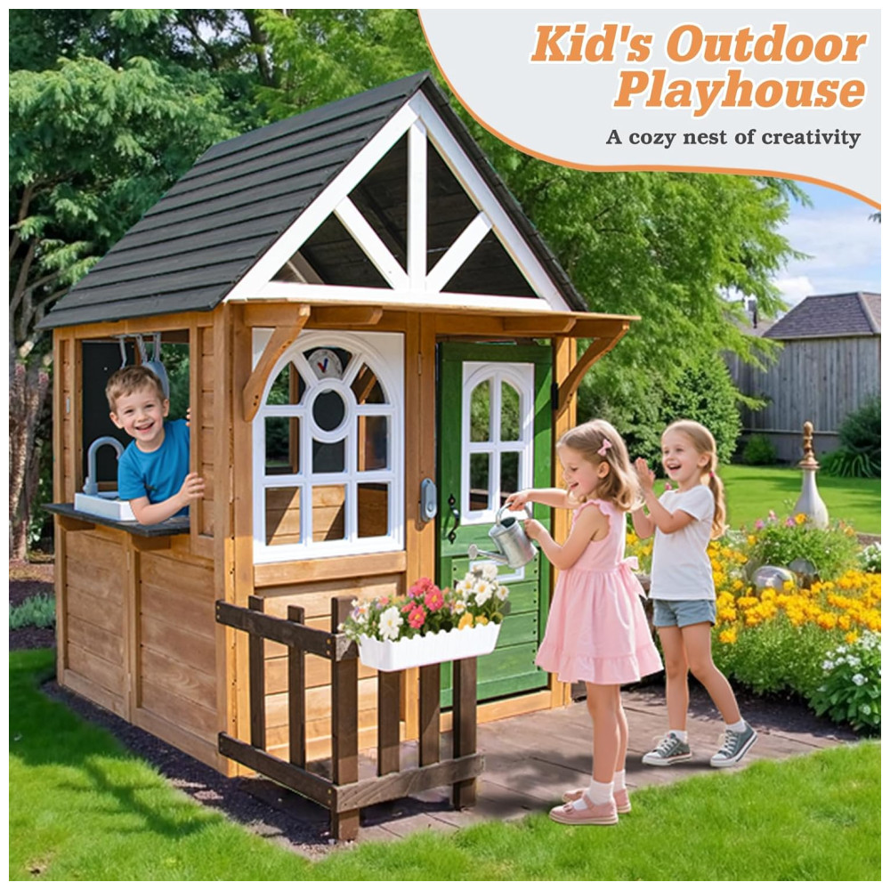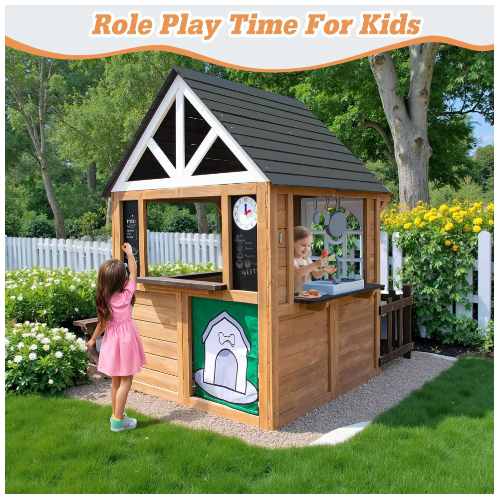Casa de Madeira de Cedro para Crianças com Balcão de Cozinha e Campainha Ideal para Brincadeiras ao Ar Livre a partir de 3 anos.BTMWAY