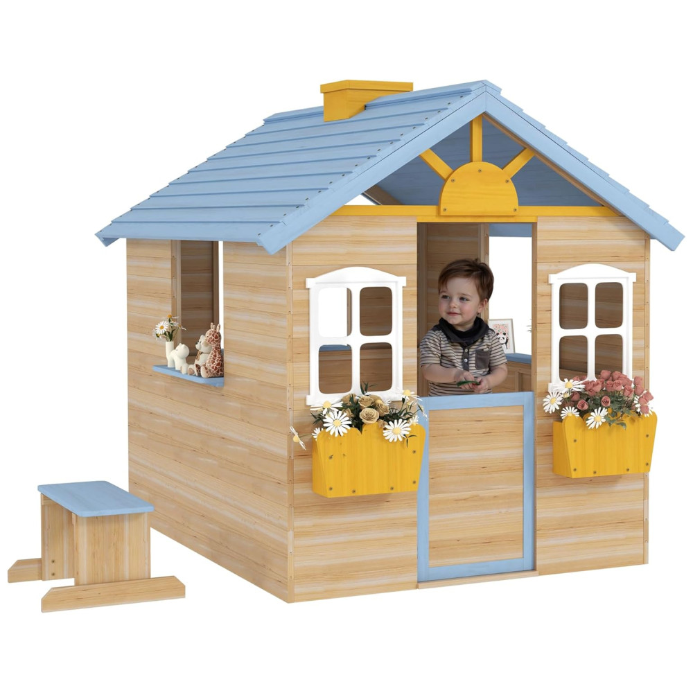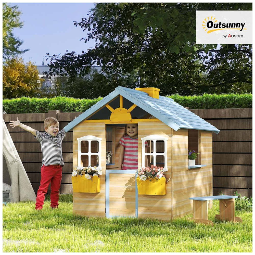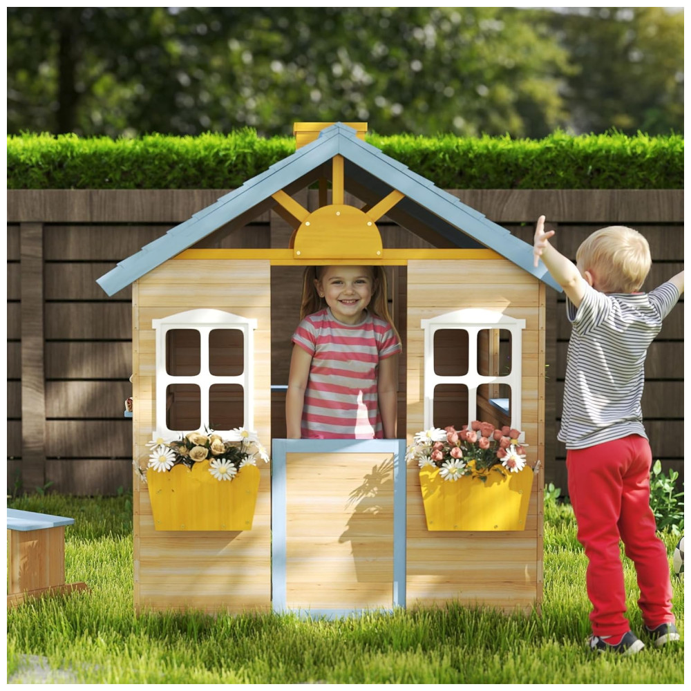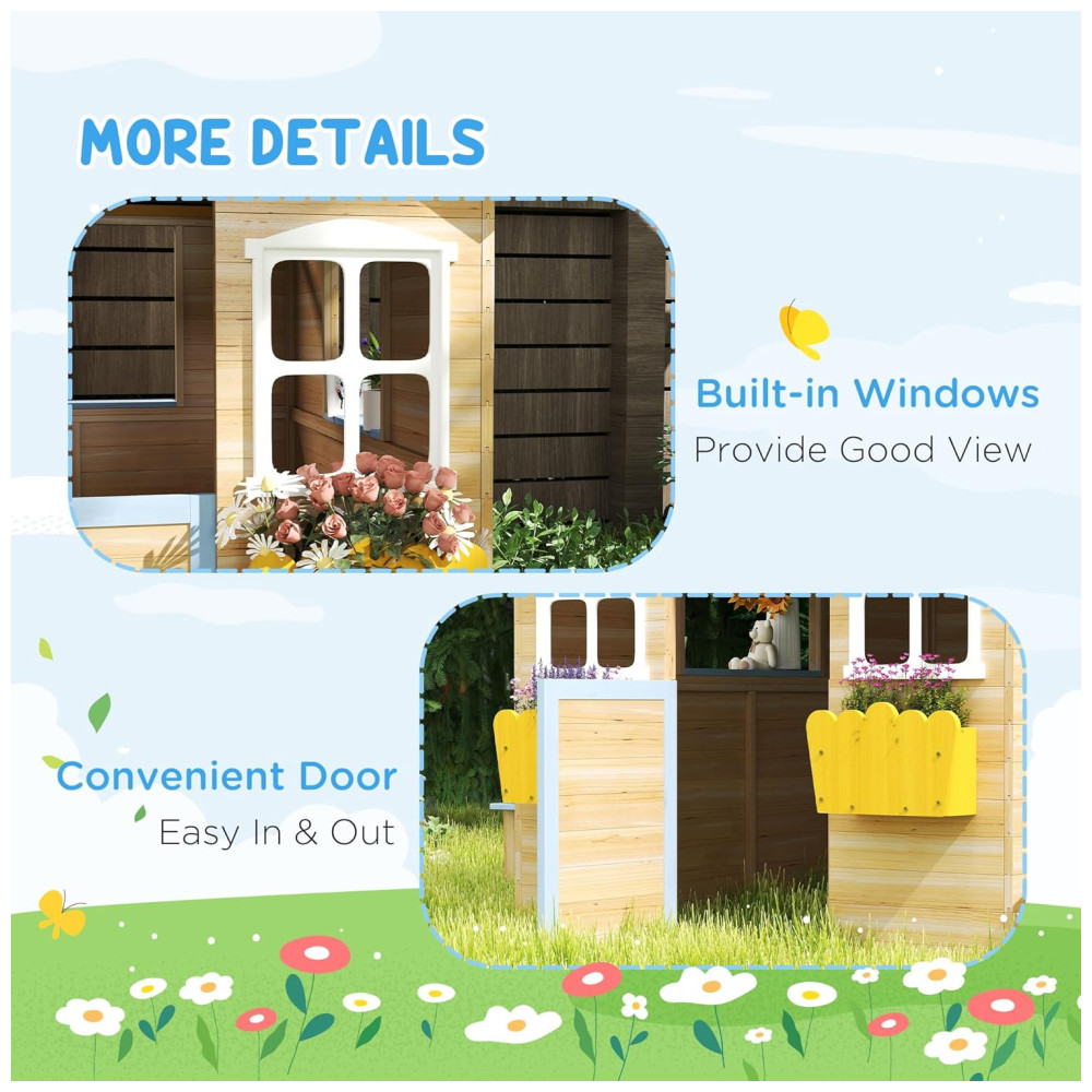 Casa de Madeira para Crianças Outsunny Ideal para Brincadeiras ao Ar Livre com Porta Janelas Banco e Estação de Serviço