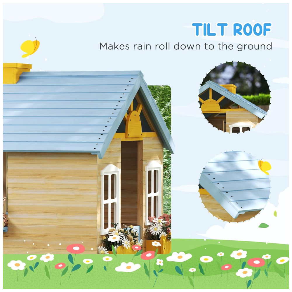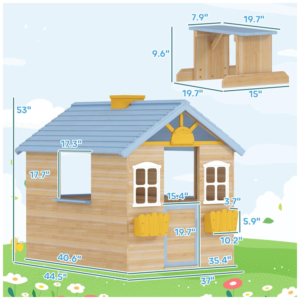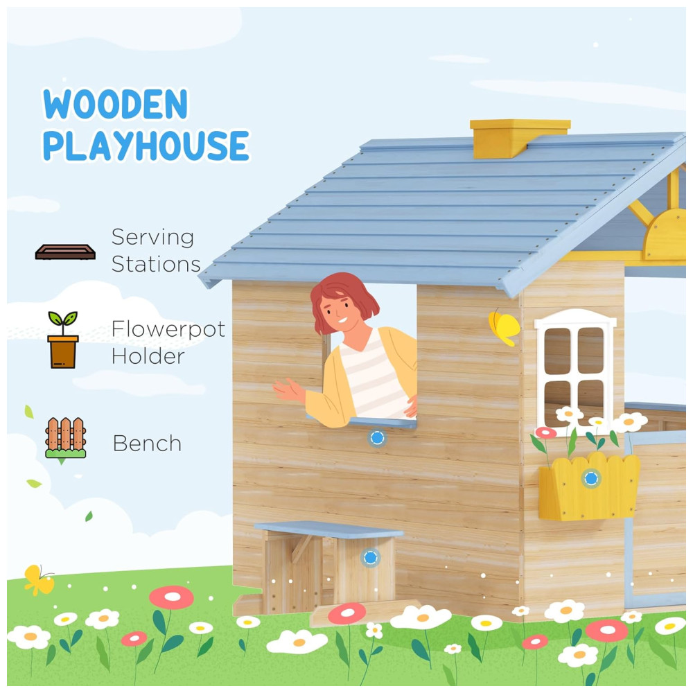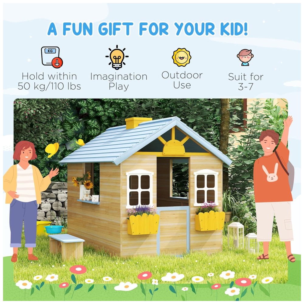 Casa de Madeira para Crianças Outsunny Ideal para Brincadeiras ao Ar Livre com Porta Janelas Banco e Estação de Serviço