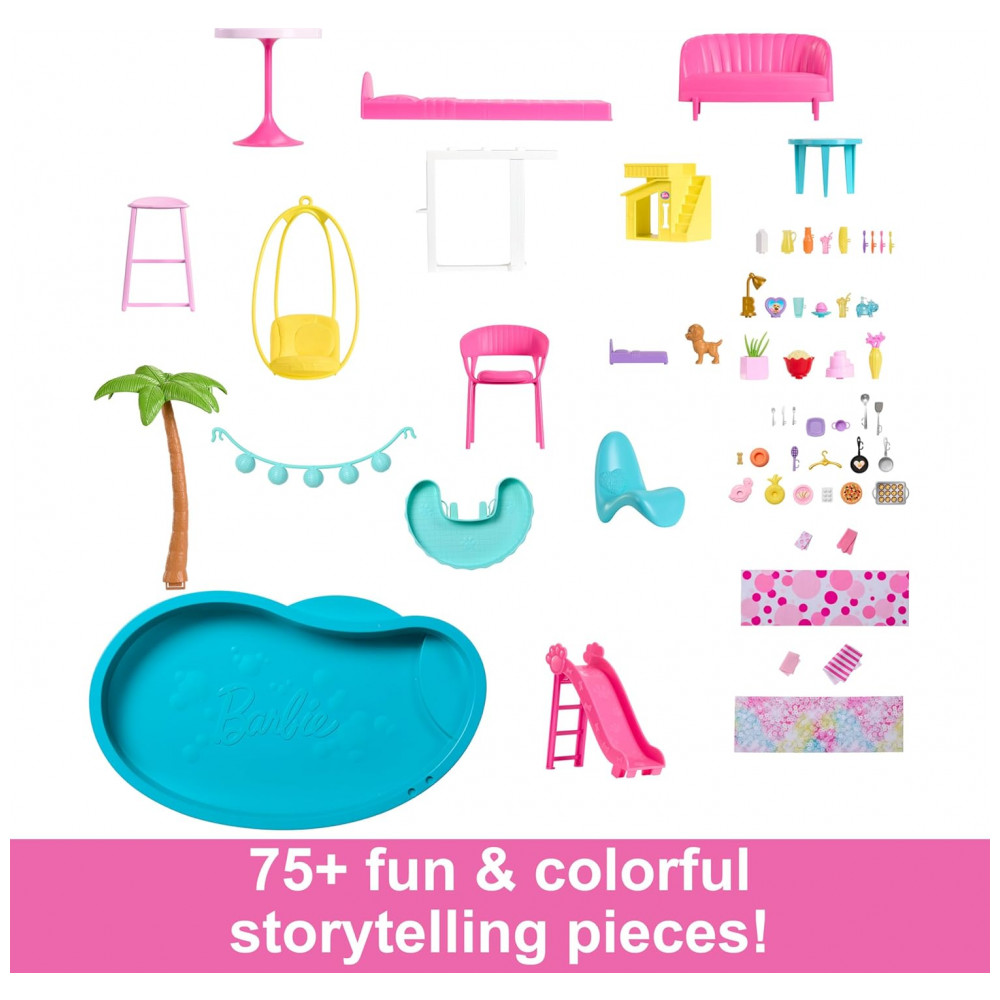 Barbie pode organizar a festa da piscina de seus sonhos com o espetacular slide em espiral de três andares de sua casa. Veja como a boneca Barbie e suas amigas deslizam para dentro da piscina Bonecas não incluídas.