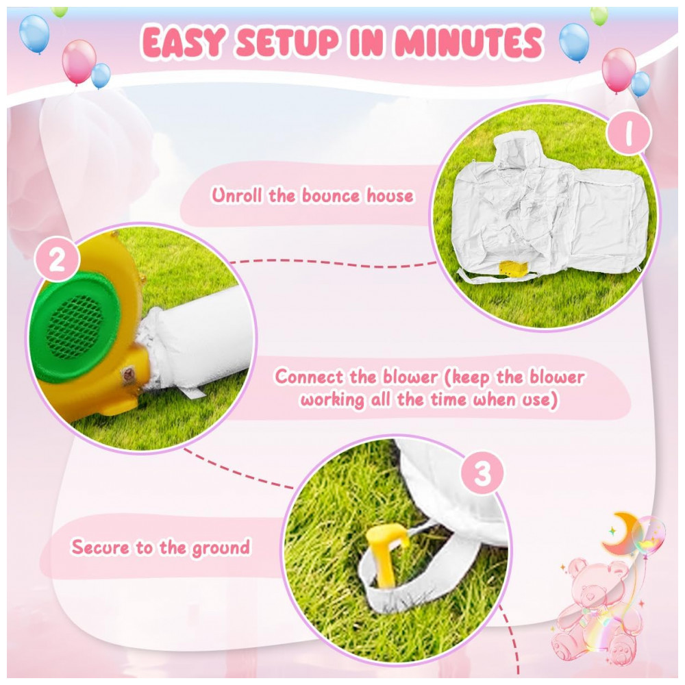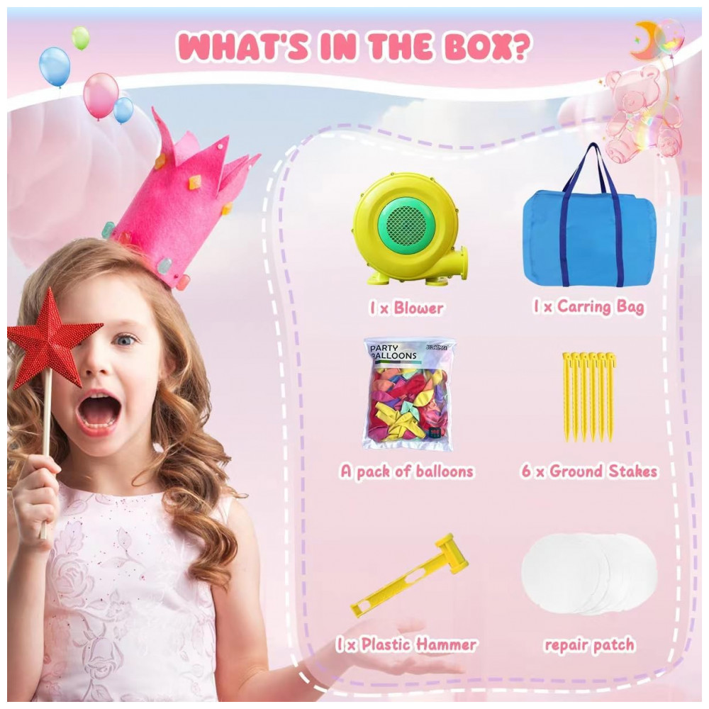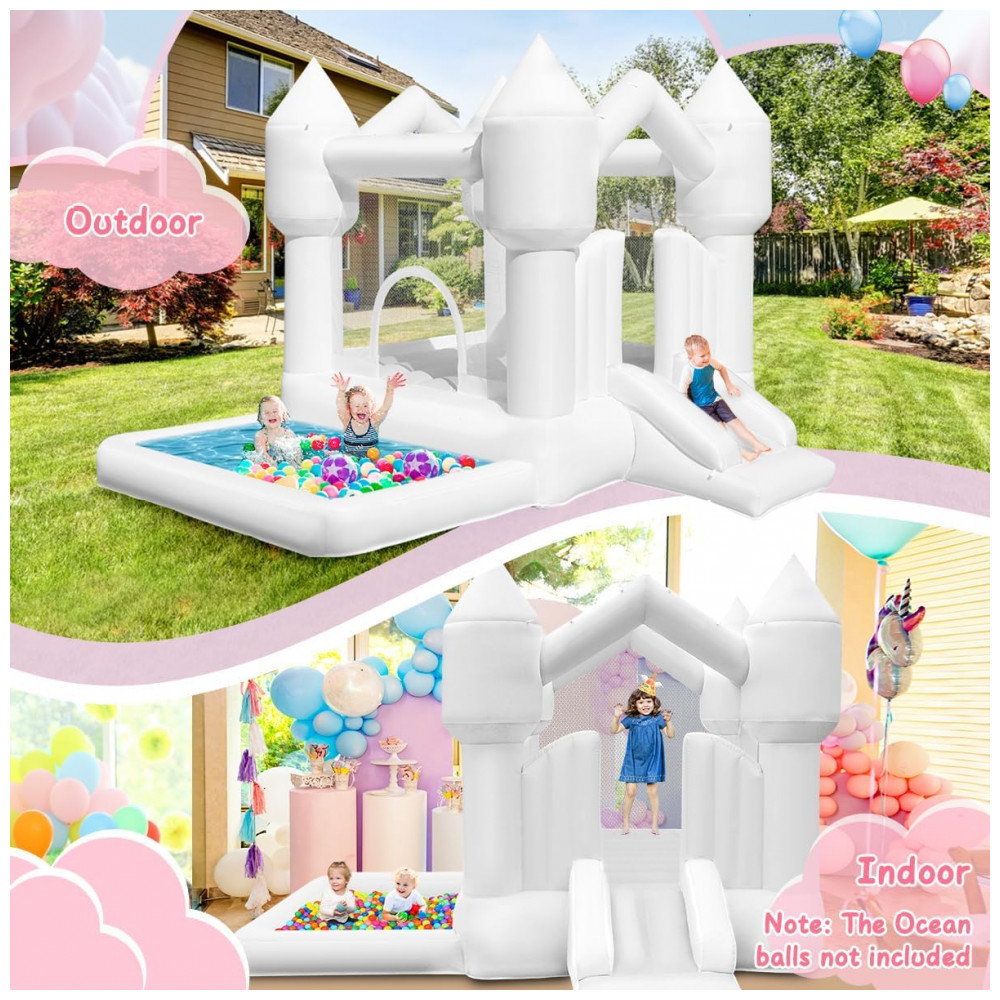 DIVIRTA-SE NA CASA BRANCA! Nossa casa inflável oferece uma área de pulo, escorregador e até uma piscina de bolinhas ao lado. Além disso, incluímos 100 balões para decoração ou diversão das crianças. Aproveite mais tempo de qualidade com seus filhos de forma segura. Feita de tecido Oxford resistente e à prova d’água, com área de pulo cercada por parede de tela para maior segurança. Infla rapidamente com o soprador incluso. Versátil para uso em ambientes internos e externos, sendo perfeita para festas de aniversário, casamentos e reuniões familiares.