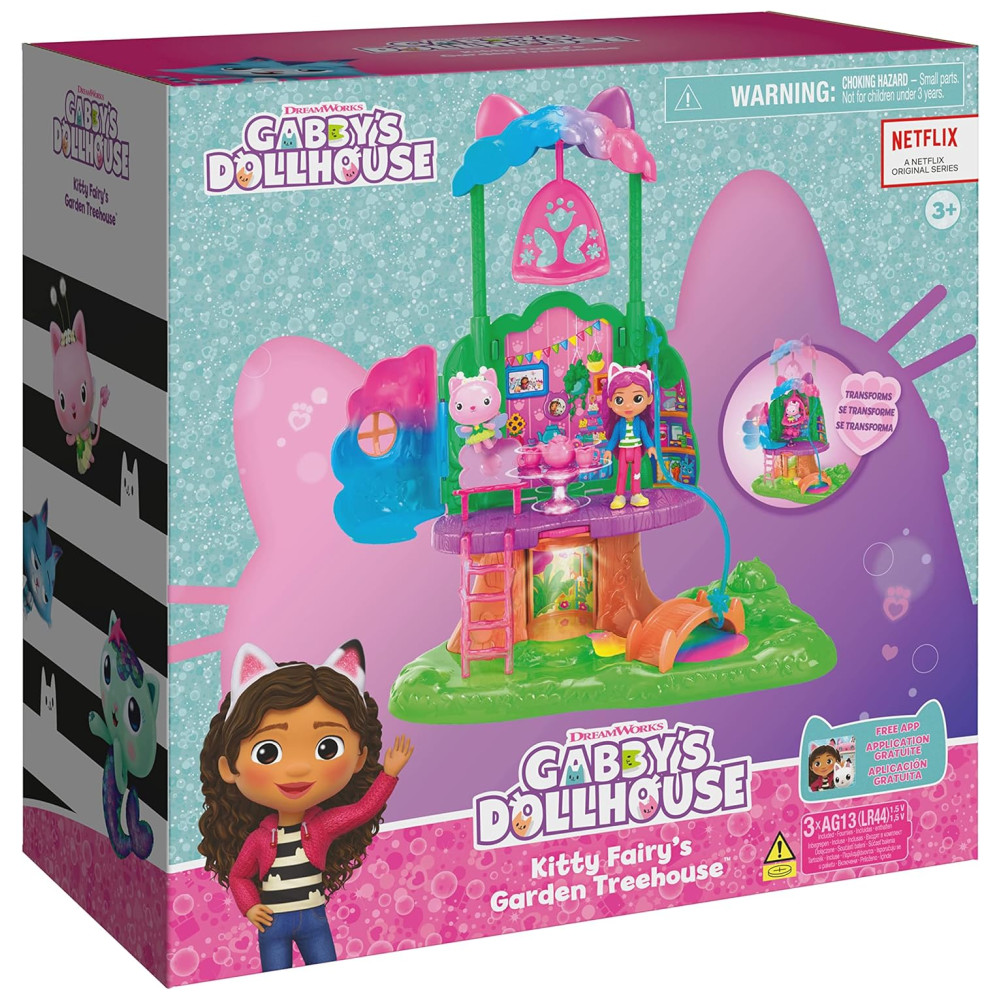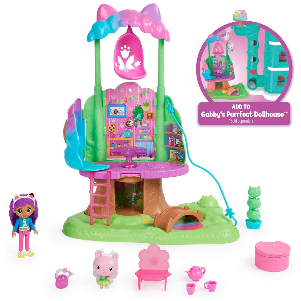 Inclui 1 Kitty Fairys Garden Treehouse Playset, 2 Figuras, 3 Móveis, 1 Dollhouse Delivery, 5 Acessórios, 1 Folha de Instruções