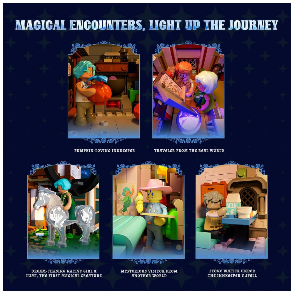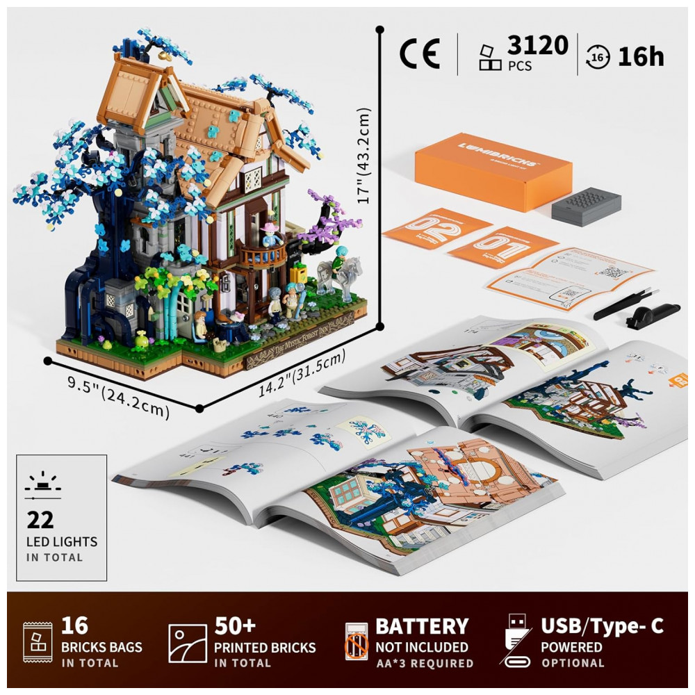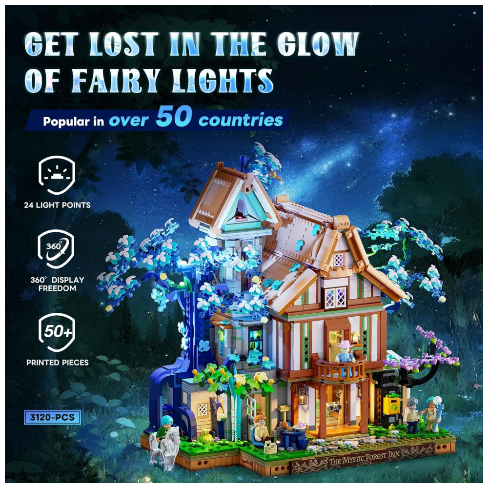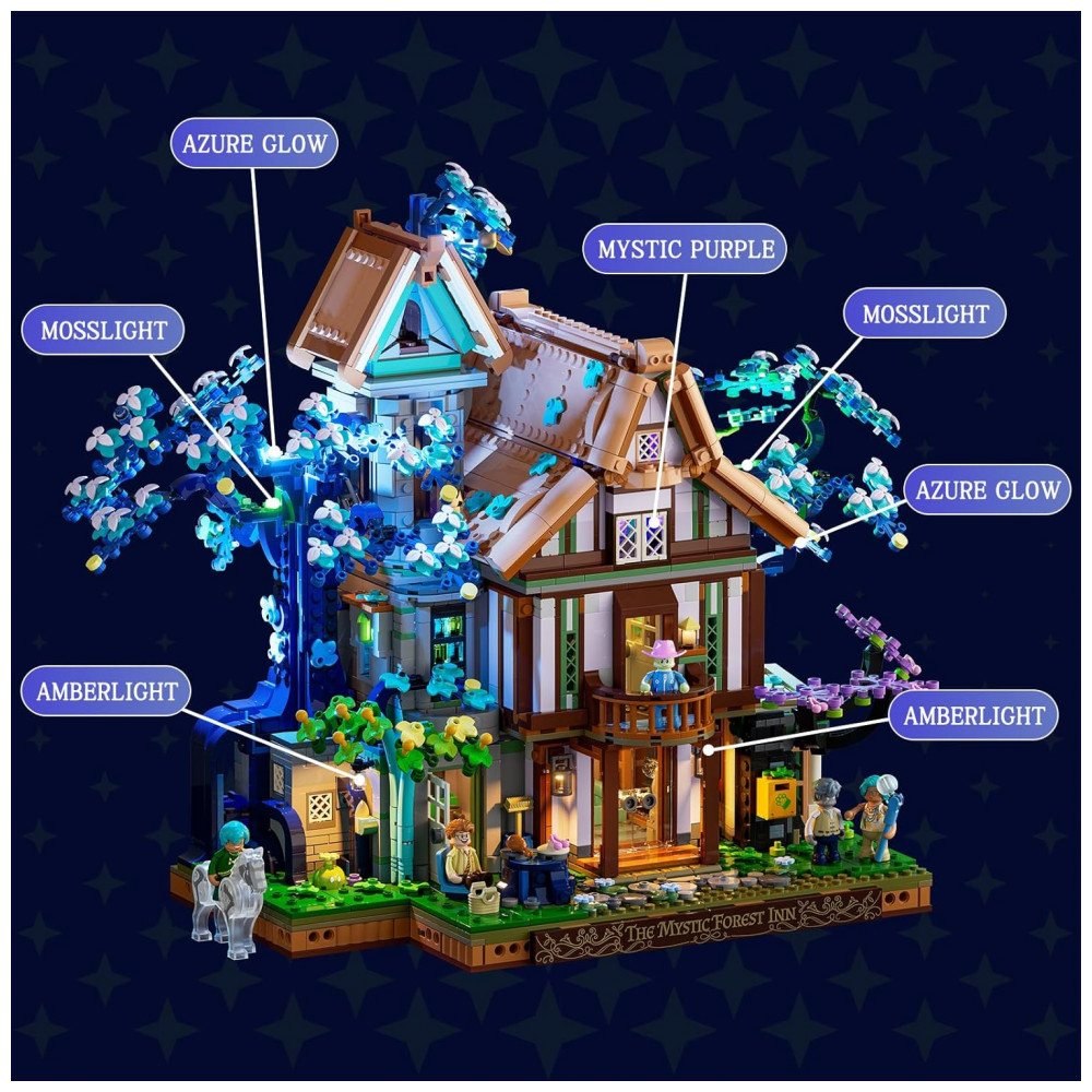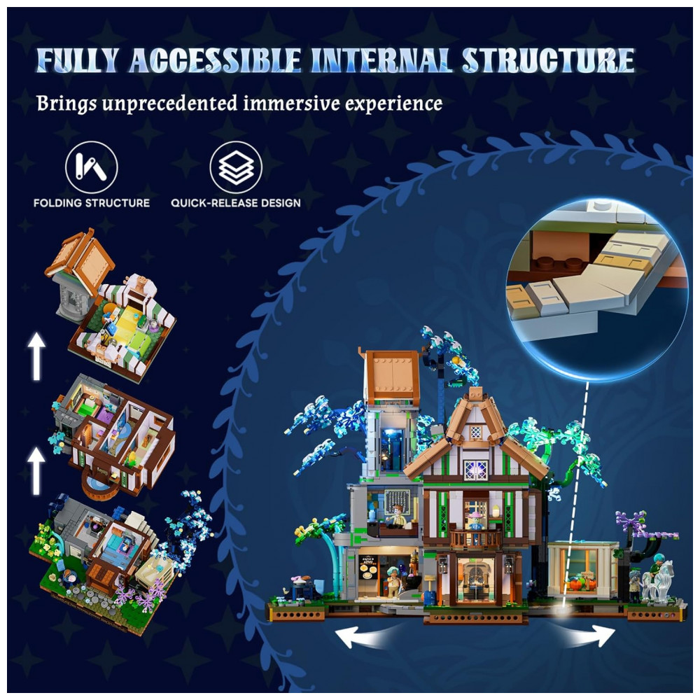 O kit Lumibricks Sylvan-Inn Treehouse contém 3120 peças plásticas ABS que integram pousada élfica a uma árvore ancestral, com madeiras azul-escuras, cabana marrom quente e telhado céu estrelado, criando atmosfera fantástica através de fusão orgânica estrutura-vegetação. O design permite dois modos transformáveis: “Pousada Totalmente Aberta” e “Esconderijo Floresta” via ação de desdobrar/dobradiça rápida.