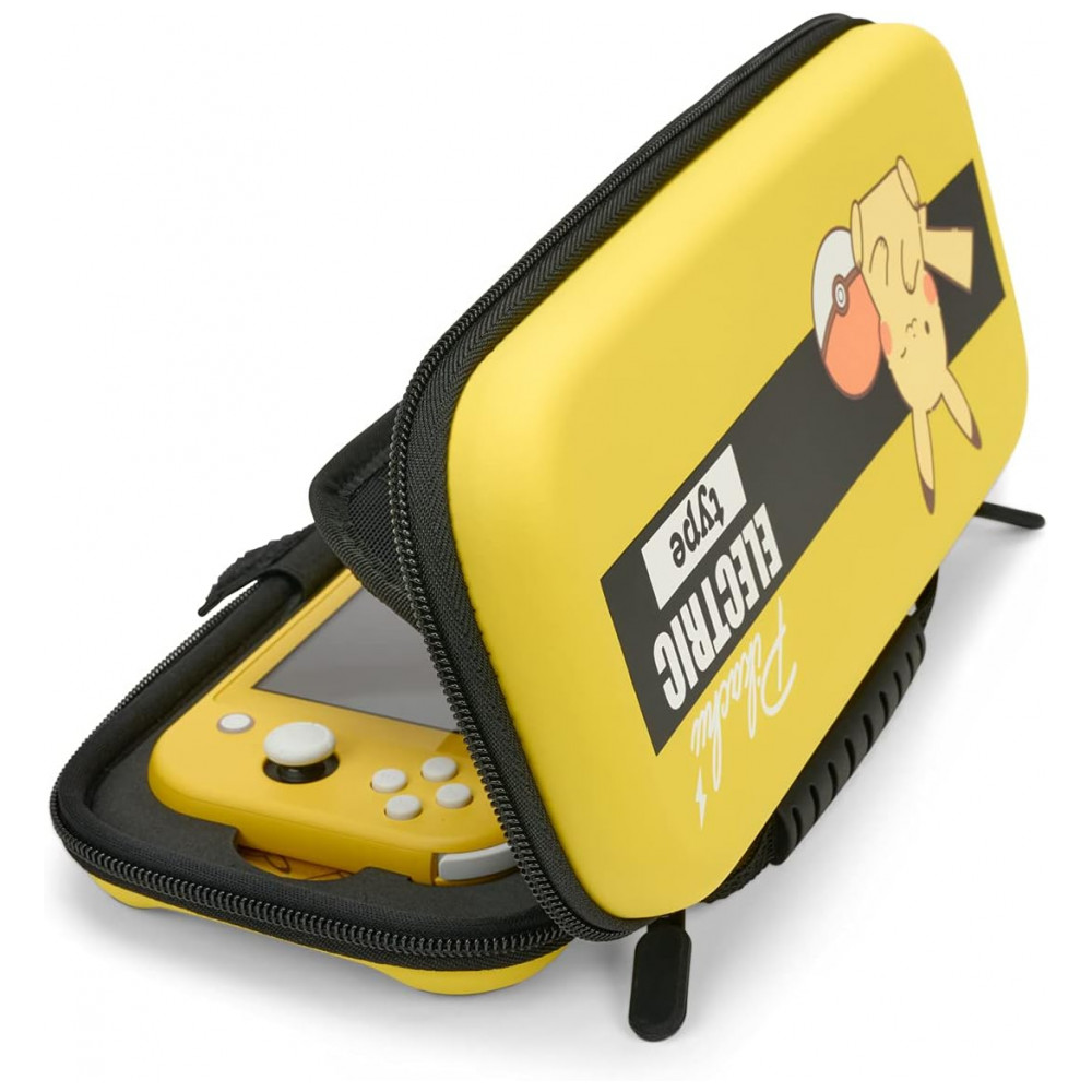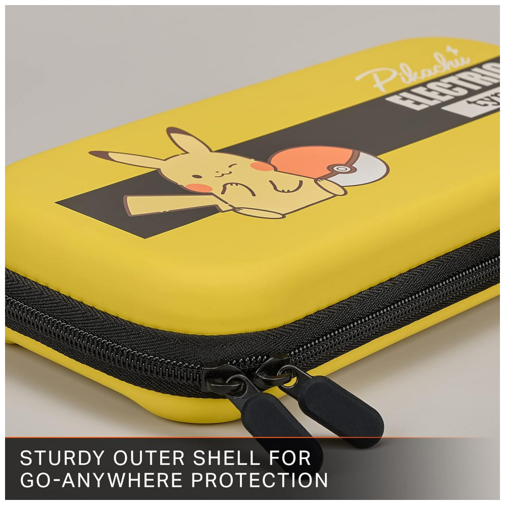 A PowerA Protection Case Pikachu Electric Type é uma case rígida compacta para transporte do Nintendo Switch em modo portátil, projetada para proteger o console contra riscos e pequenos impactos no dia a dia e em viagens. Ela é oficialmente licenciada e compatível com Nintendo Switch, Nintendo Switch – OLED Model e Nintendo Switch Lite, acomodando o console com Joy‑Con acoplados.