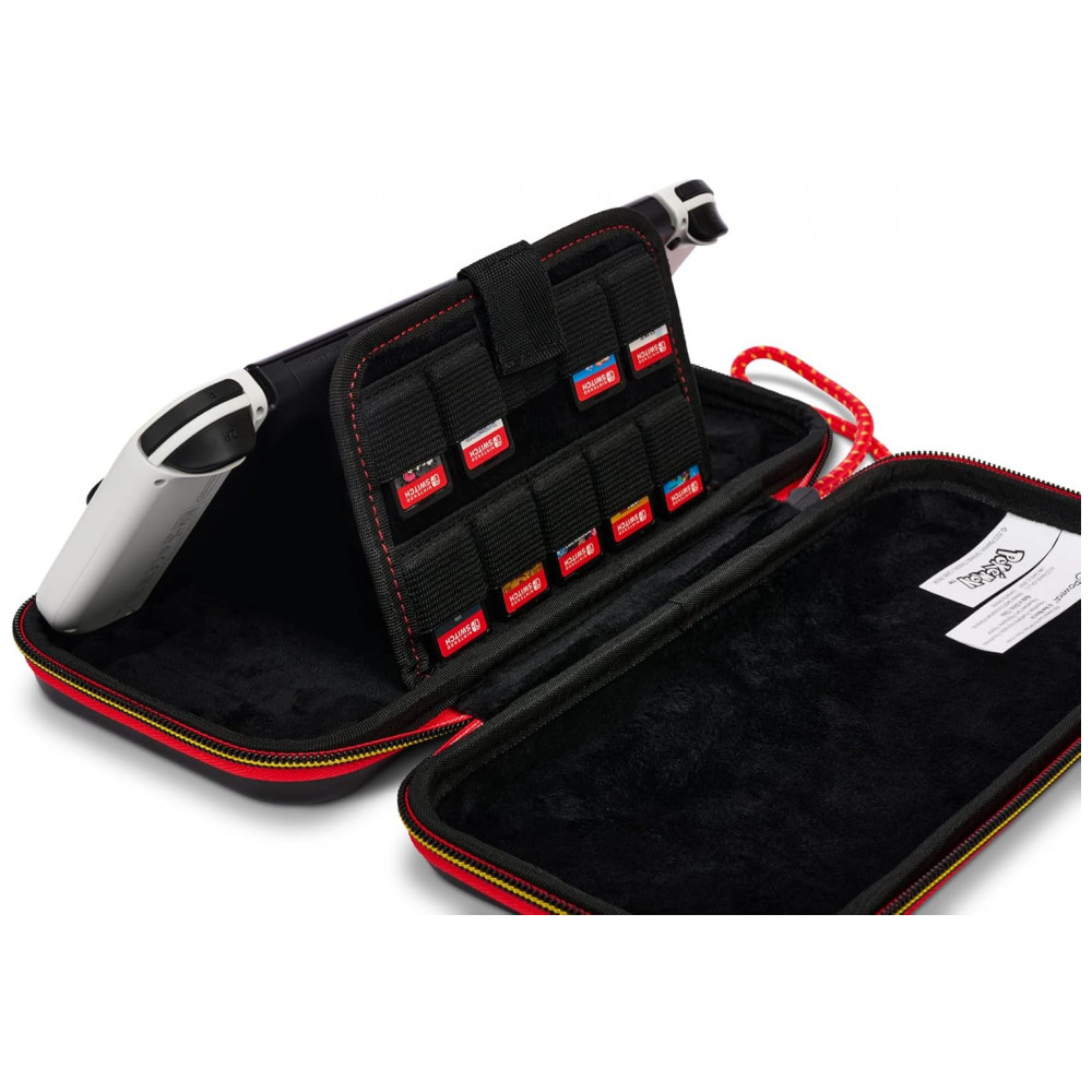 O interior é moldado para acomodar o console em modo portátil, com revestimento em feltro que evita riscos na carcaça e na tela. O case conta com um suporte integrado para modo mesa (tabletop), permitindo apoiar o console para jogar com controles separados, além de uma aba acolchoada que funciona como protetor de tela e traz compartimentos para armazenar até nove cartuchos de jogo.