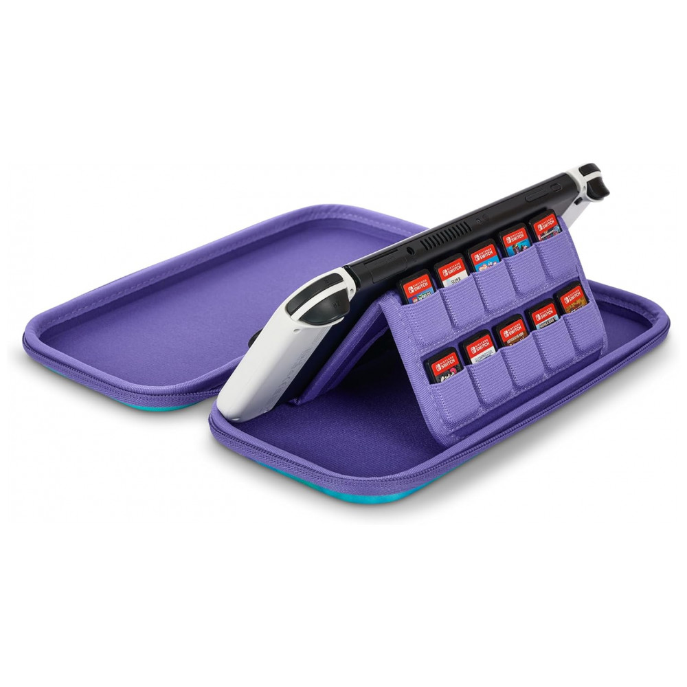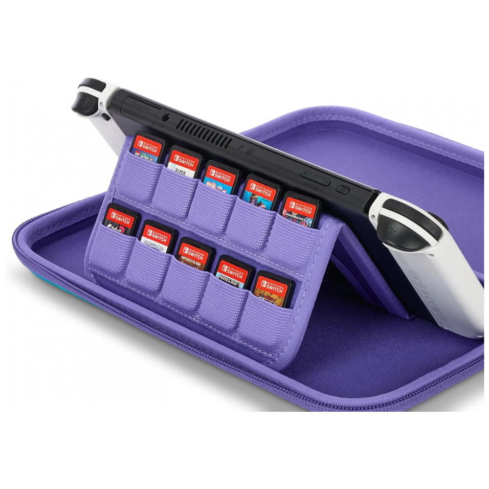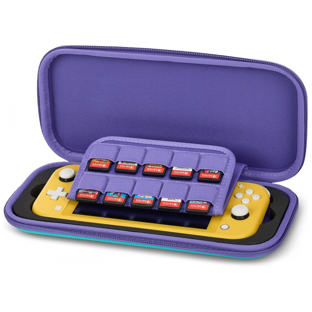 Uma aba acolchoada interna atua como protetor de tela e traz slots para armazenamento de até dez cartuchos de jogo, mantendo os cards organizados e protegidos durante o transporte. O case é oficialmente licenciado pela Nintendo, com construção pensada para durabilidade e uso diário, indicado para uso com Nintendo Switch e, conforme compatibilidade indicada, também com Switch Lite ou modelos equivalentes.