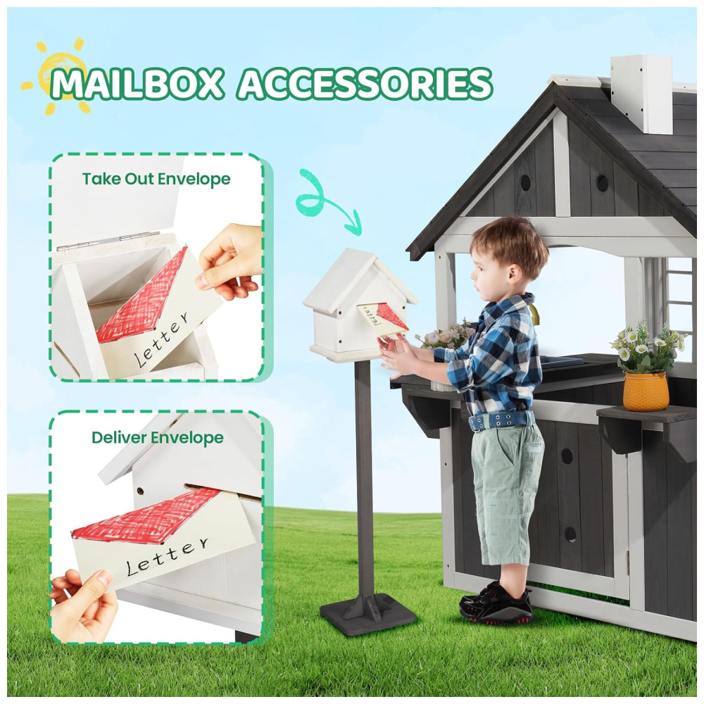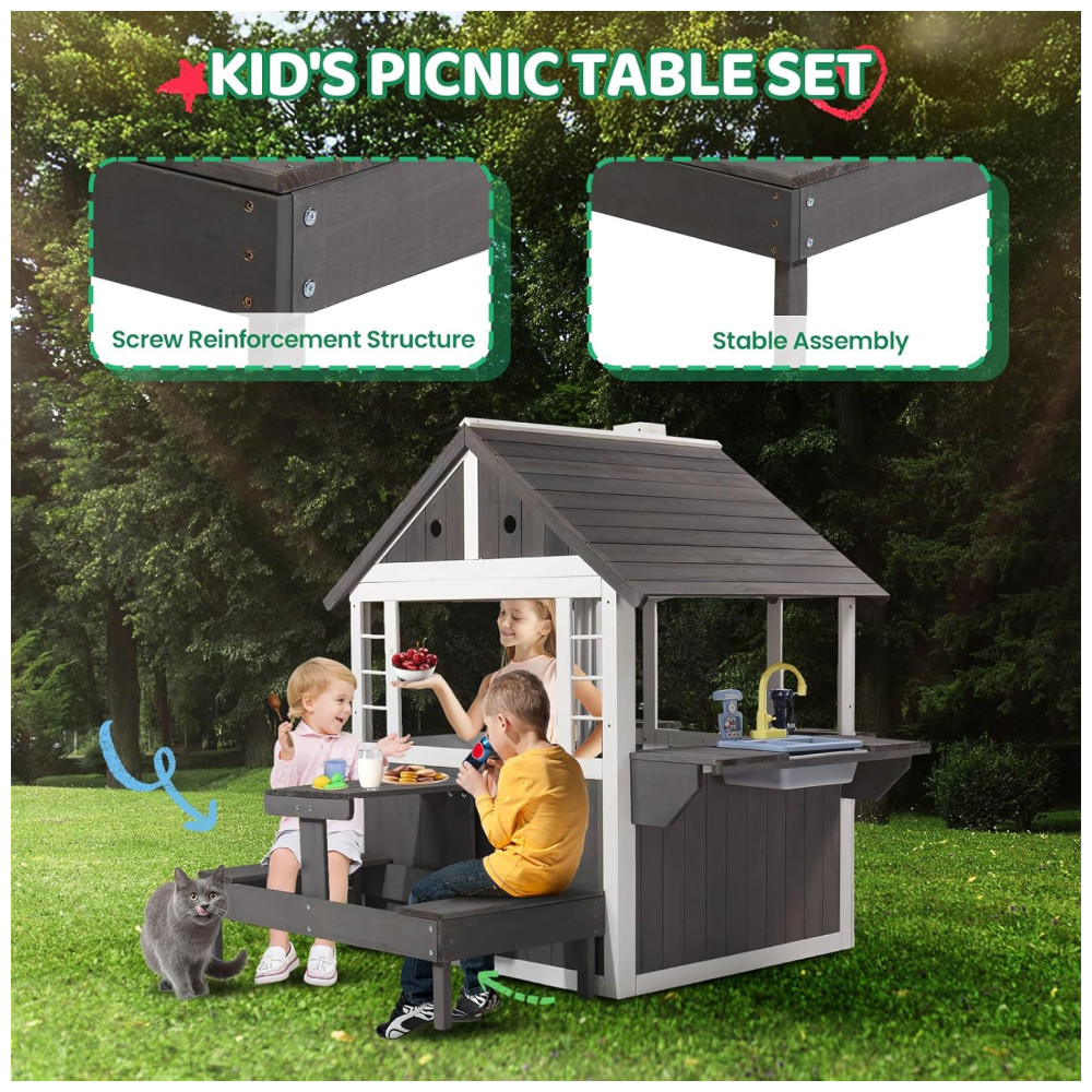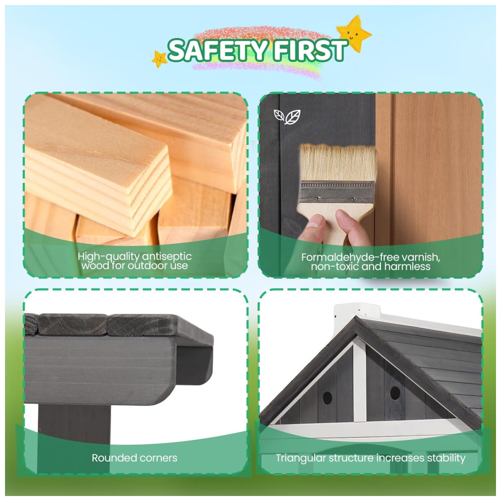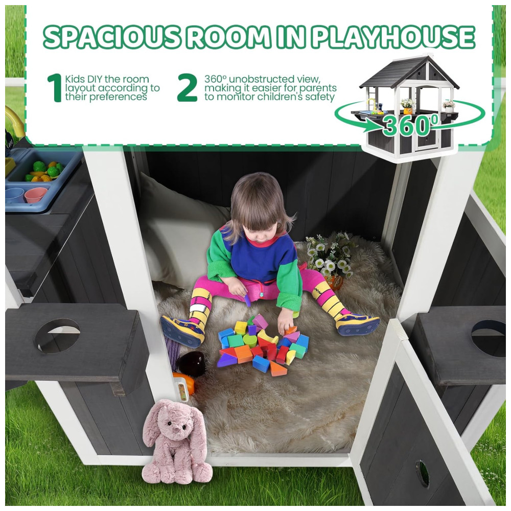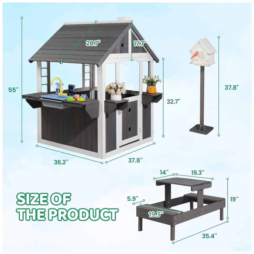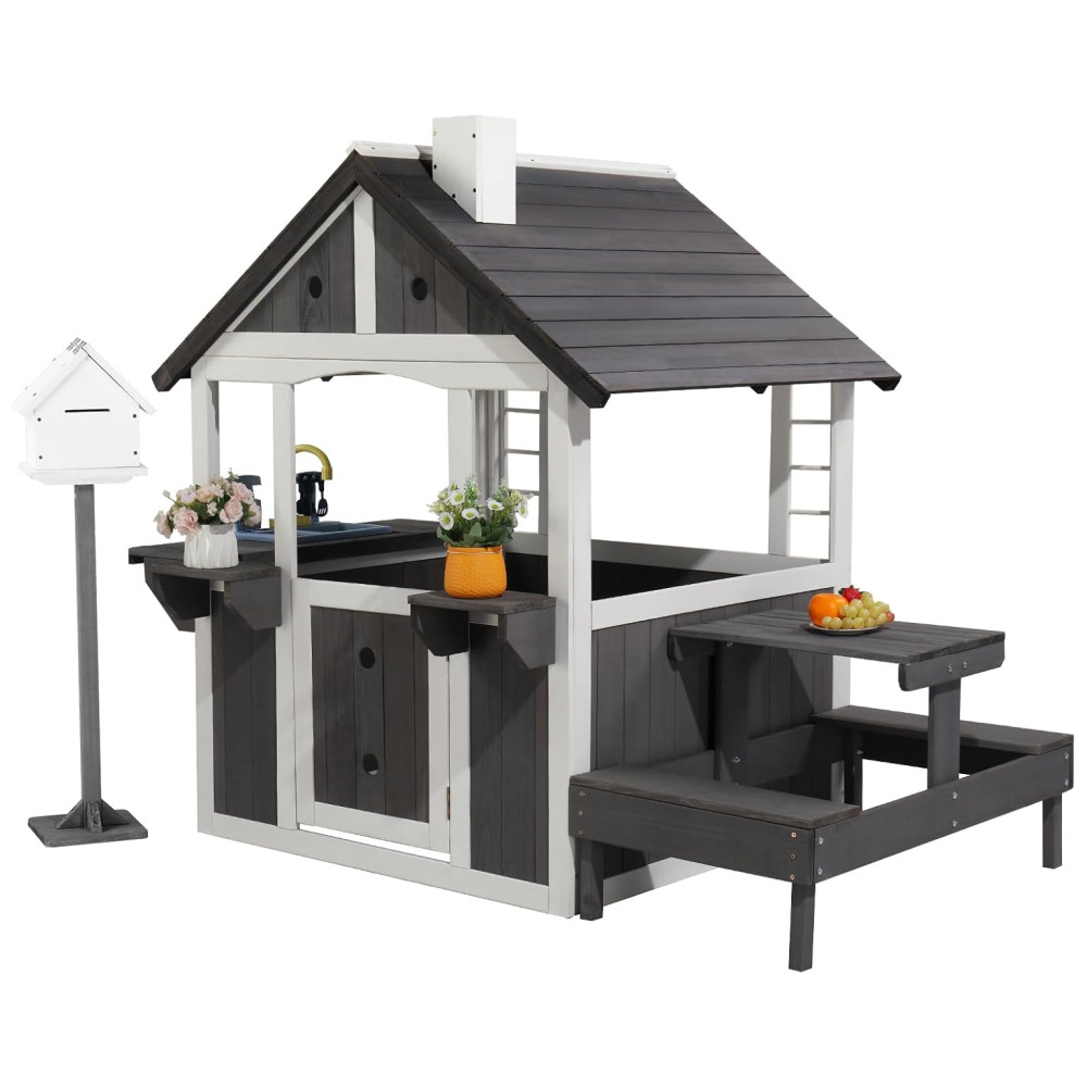 Casinha de Madeira JOYMOR para Crianças ao Ar Livre com Pia Mesa de Piquenique Caixa de Correio e Suporte para Vasos de Flores – Cinza/Branco