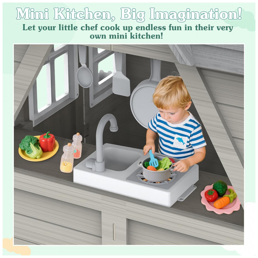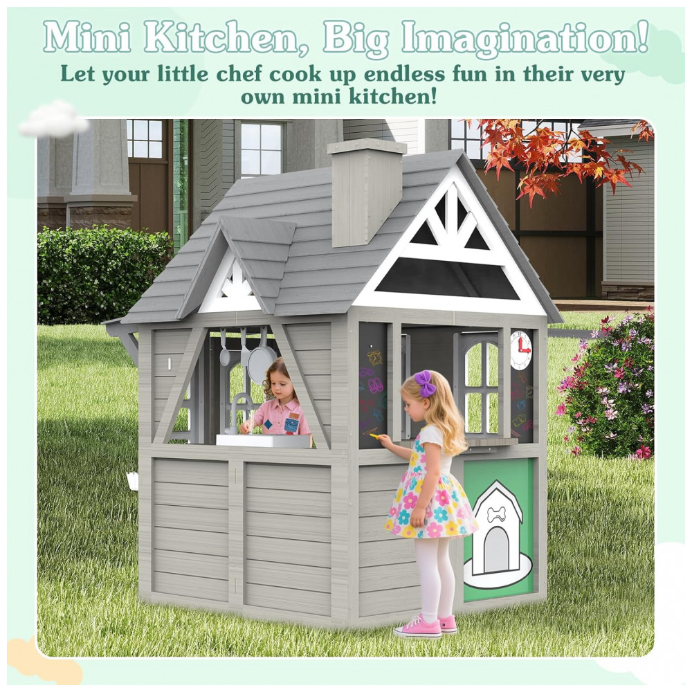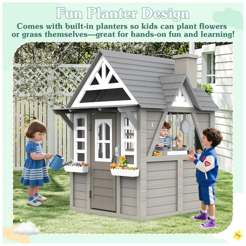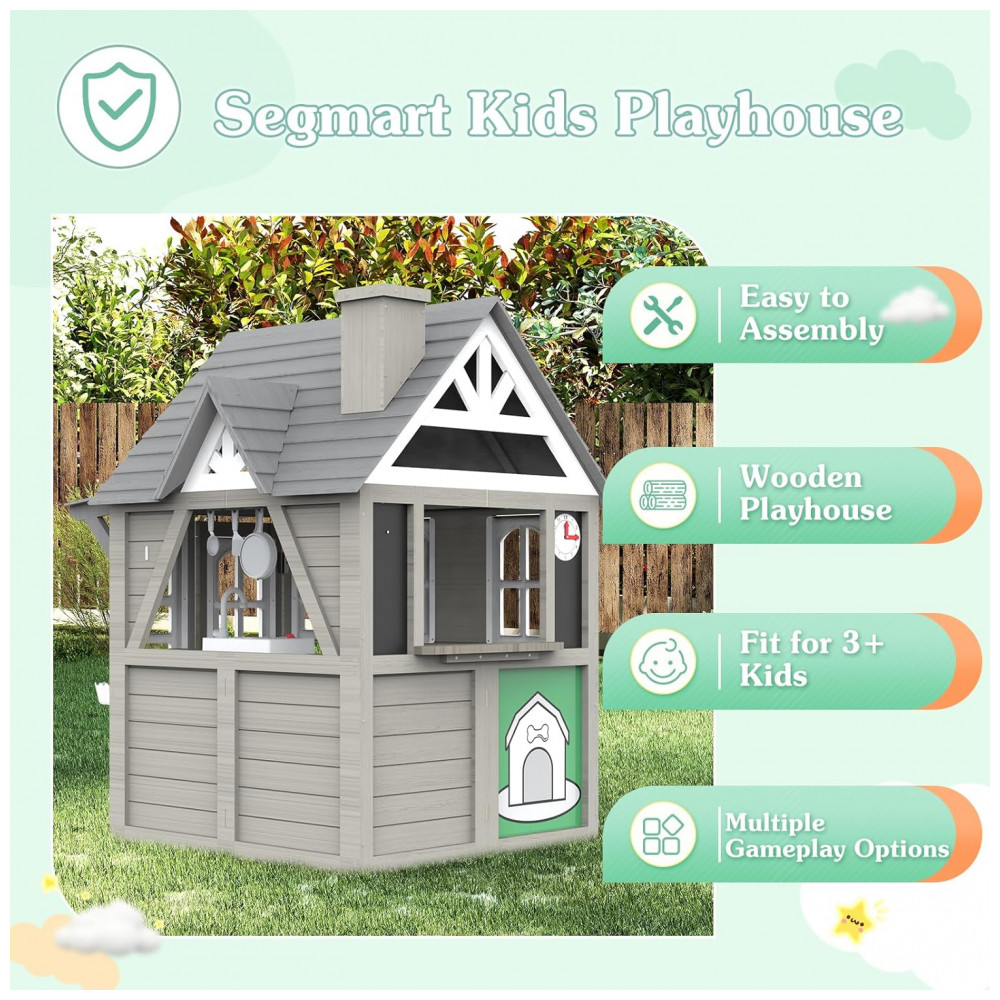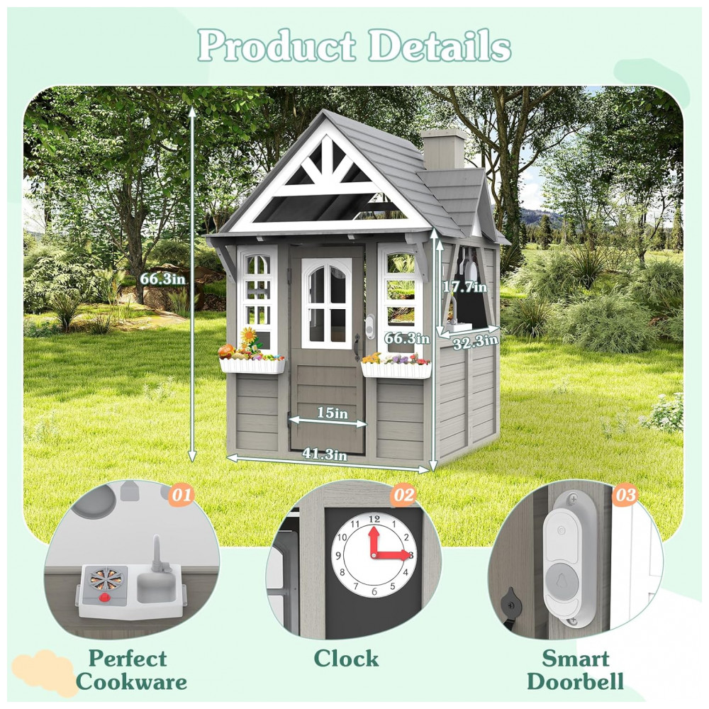 Casinha Infantil de Madeira para Área Externa com Acessórios de Cozinha Suporte para Vasos de Flores e Campainha Funcional Segmart Cinza