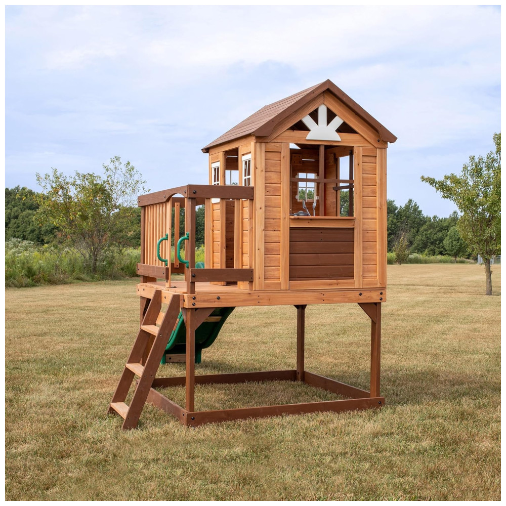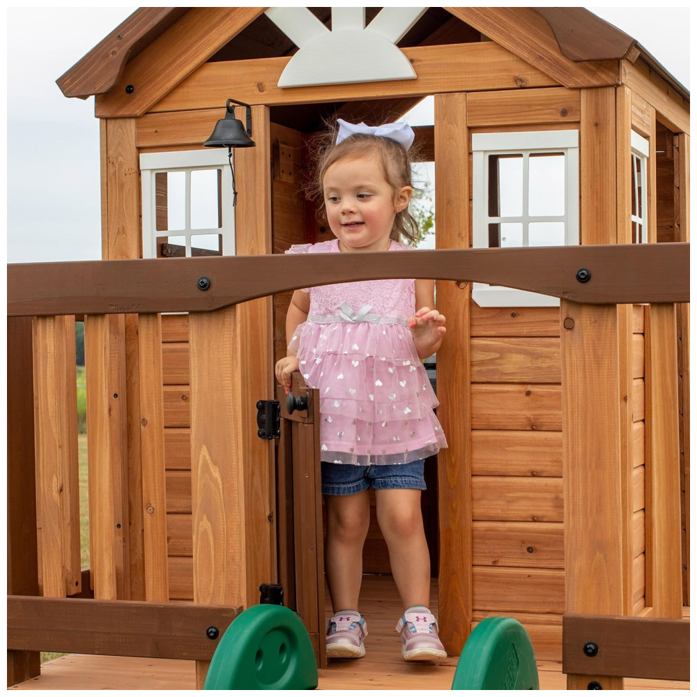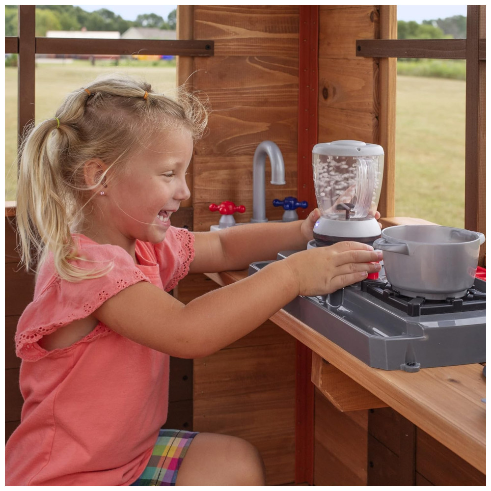 Apresentamos o teatro The Echo Heights da Backyard Discovery, uma casa de jogos elevada que promete diversão em quintais de todos os tamanhos. Este brinquedo encantador inclui uma cozinha de brinquedo completa com liquidificador elétrico, campainha e porta articulada, oferecendo inúmeras possibilidades para brincadeiras imaginativas. A escada de entrada, com degraus largos, facilita o acesso para crianças de todas as idades e habilidades.
