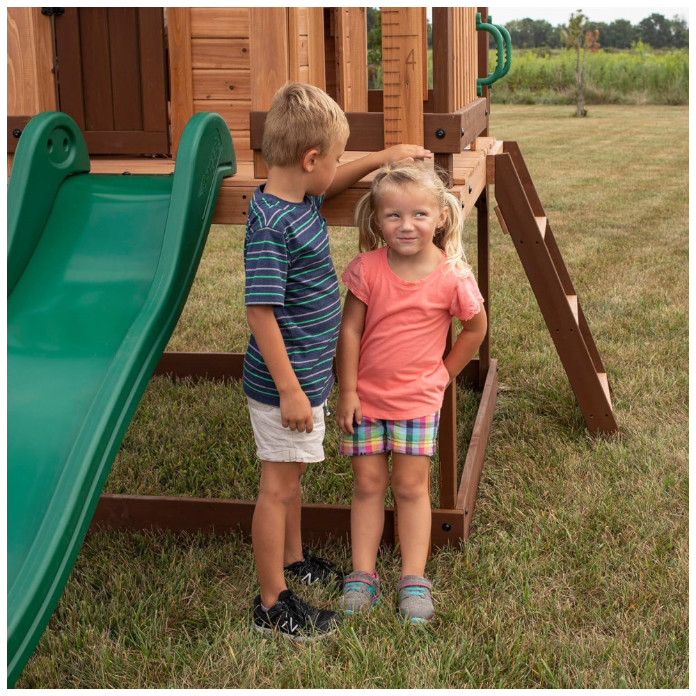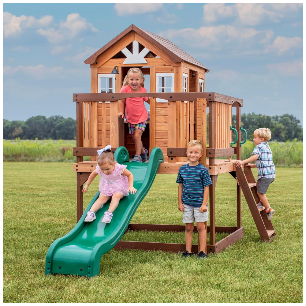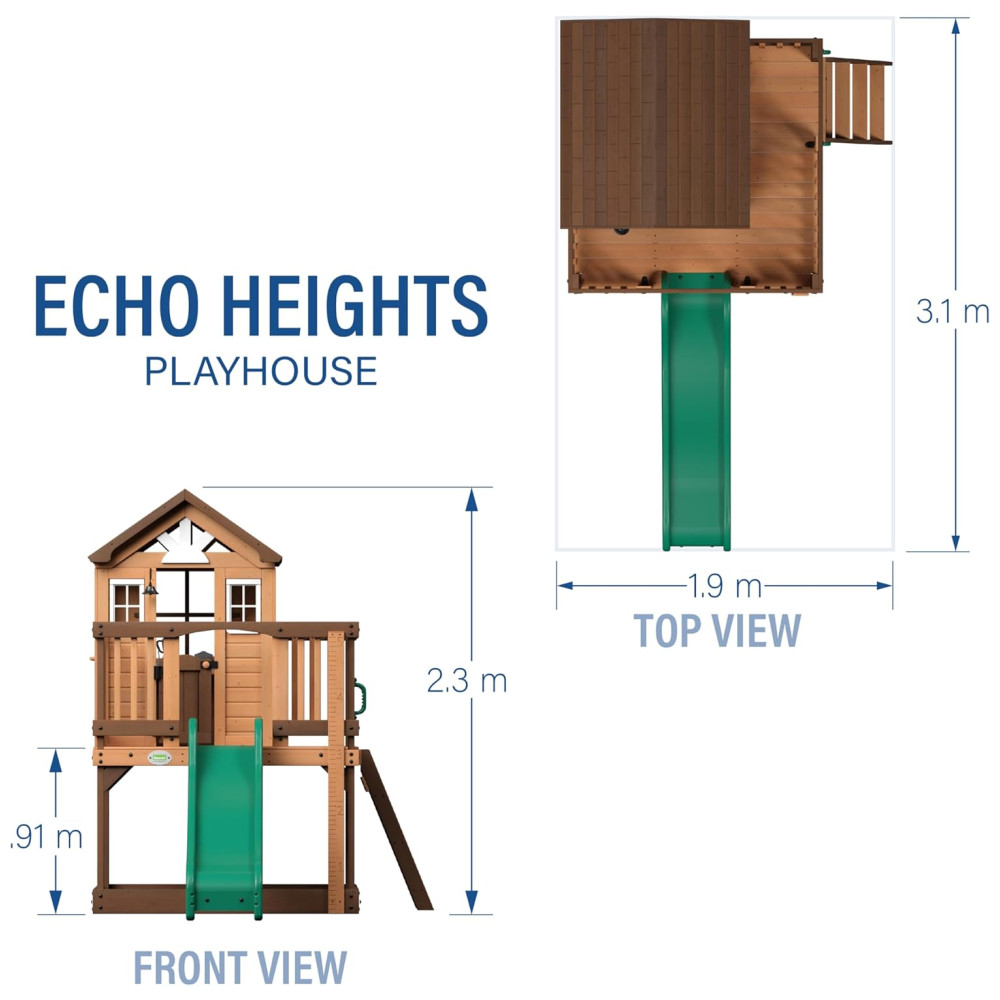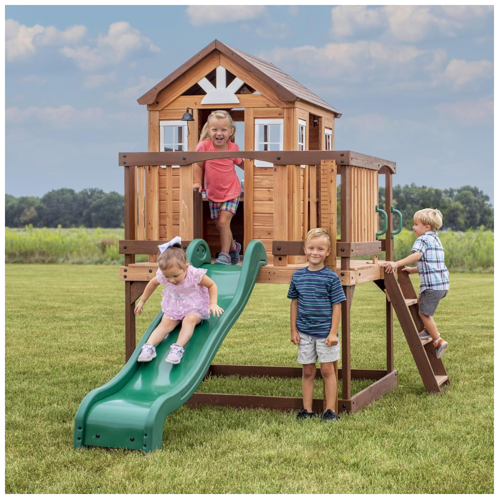 Apresentamos o teatro The Echo Heights da Backyard Discovery, uma casa de jogos elevada que promete diversão em quintais de todos os tamanhos. Este brinquedo encantador inclui uma cozinha de brinquedo completa com liquidificador elétrico, campainha e porta articulada, oferecendo inúmeras possibilidades para brincadeiras imaginativas. A escada de entrada, com degraus largos, facilita o acesso para crianças de todas as idades e habilidades.