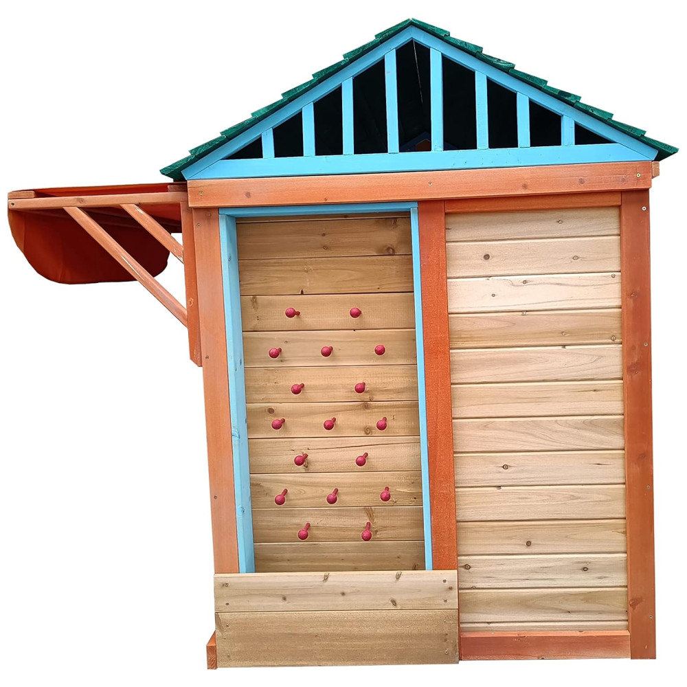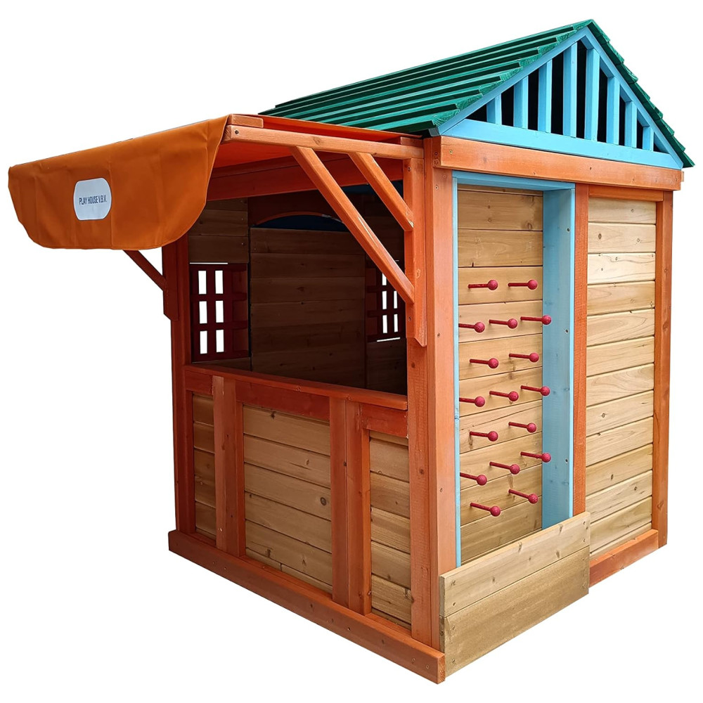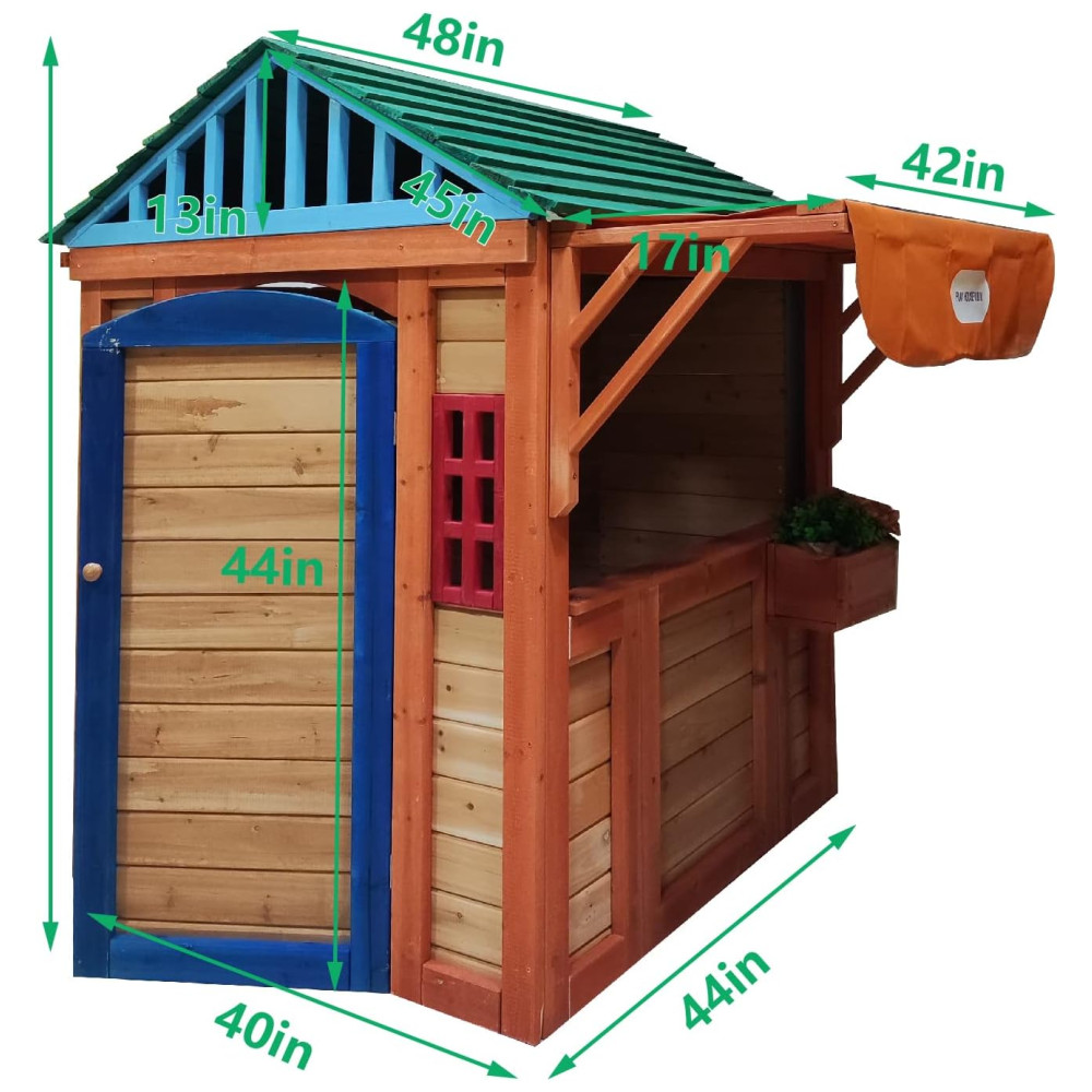 A AOCOROE apresenta a casa de brinquedo de madeira ao ar livre perfeita para crianças. Certificada pelas normas ASTM F963, CPSIA e SOR, esta casa é construída com 100% madeira de abeto de alta qualidade. Com dimensões gerais de 155 cm de comprimento, 116 cm de largura e 162 cm de altura, ela vem equipada com uma porta, duas janelas, uma estação de serviço com toldo, parede de bolas e um jogo de Tetris com lançamento de dardos.