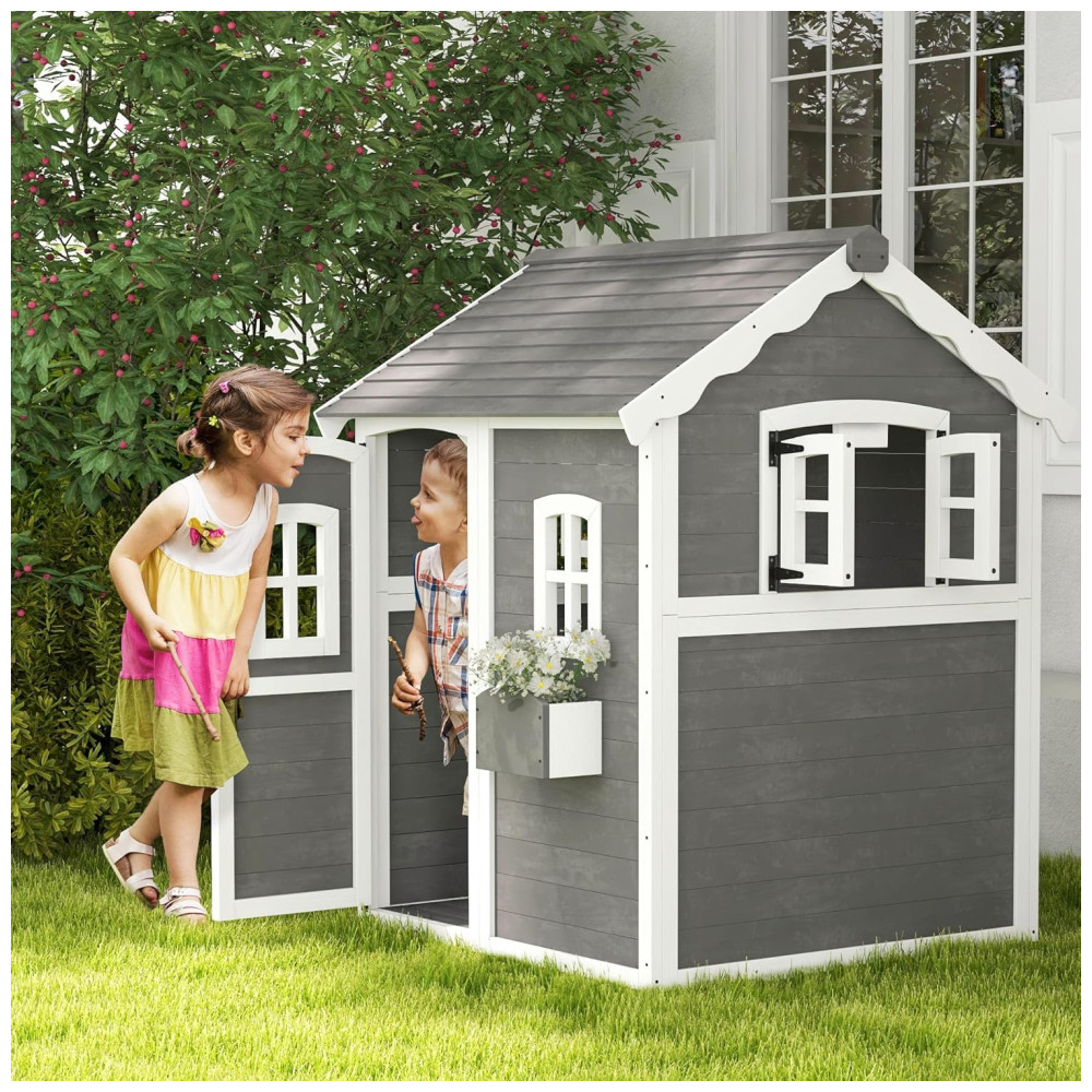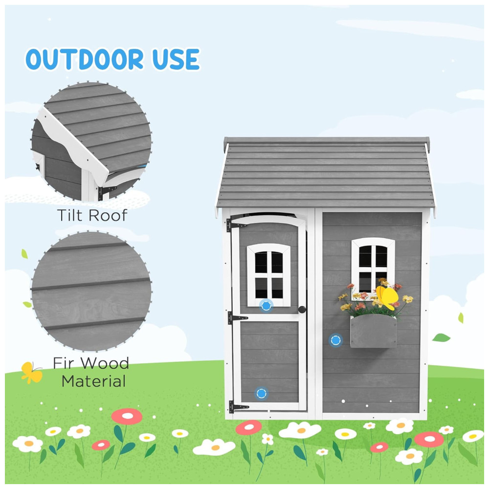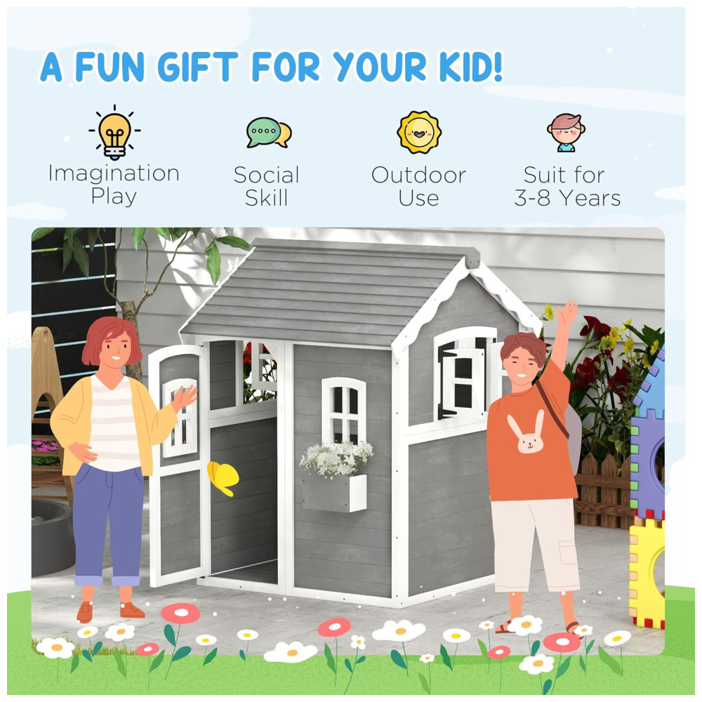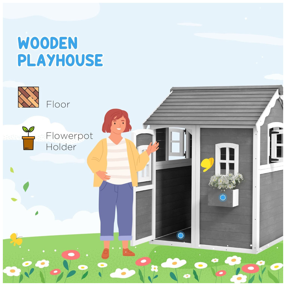 Casinha Infantil de Madeira para Área Externa com Piso Porta Janelas e Suporte para Vaso de Flor para Crianças de 3 a 8 Anos Outsunny Cinza