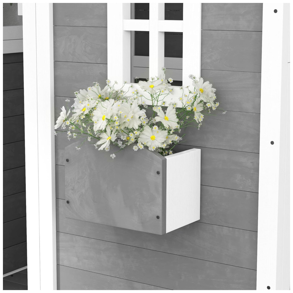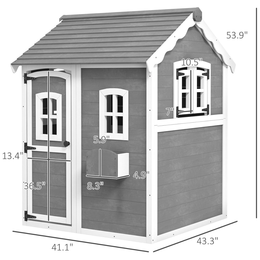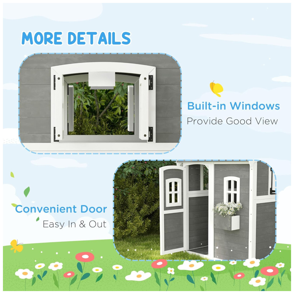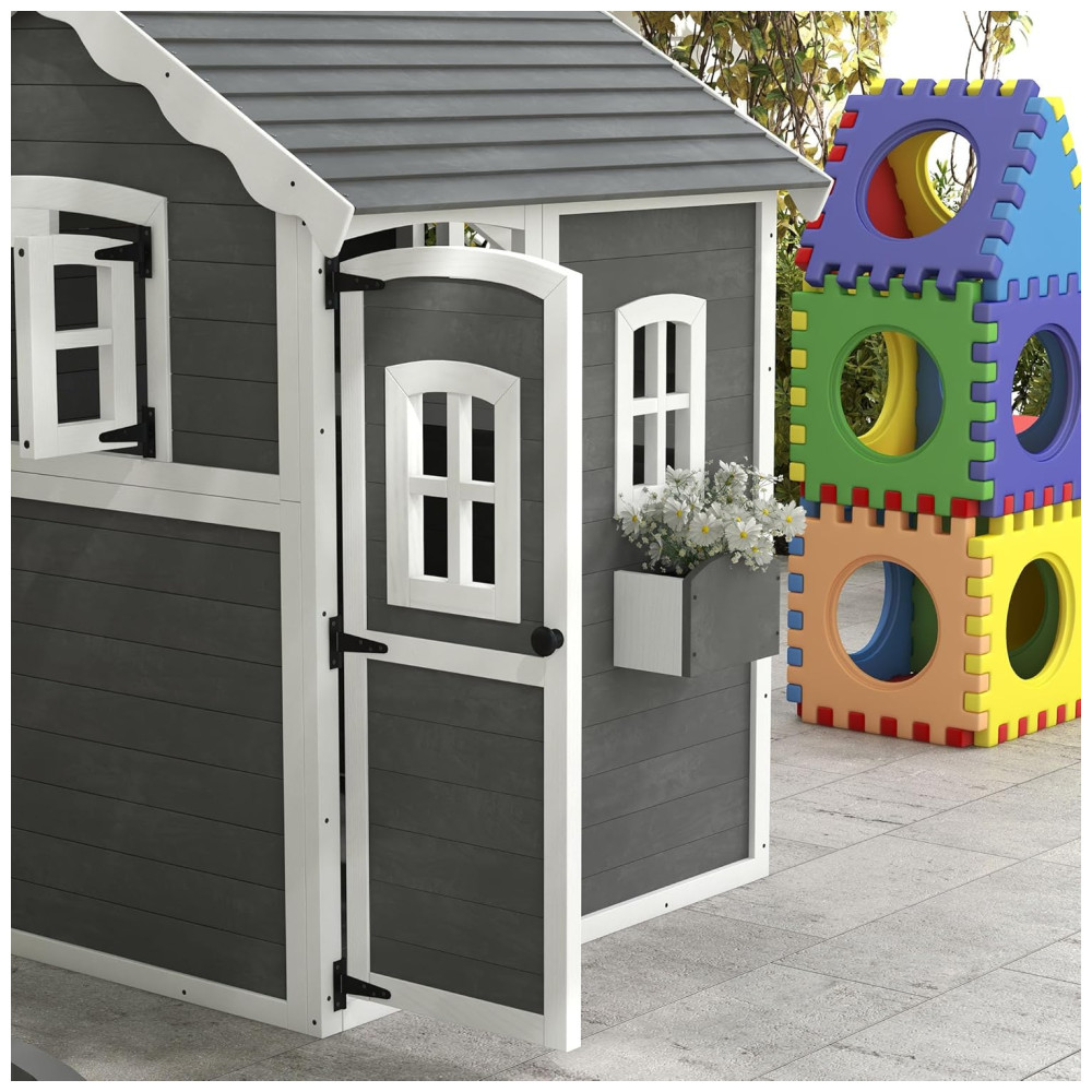 Casinha Infantil de Madeira para Área Externa com Piso Porta Janelas e Suporte para Vaso de Flor para Crianças de 3 a 8 Anos Outsunny Cinza