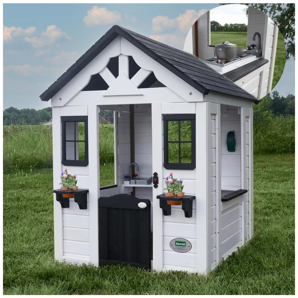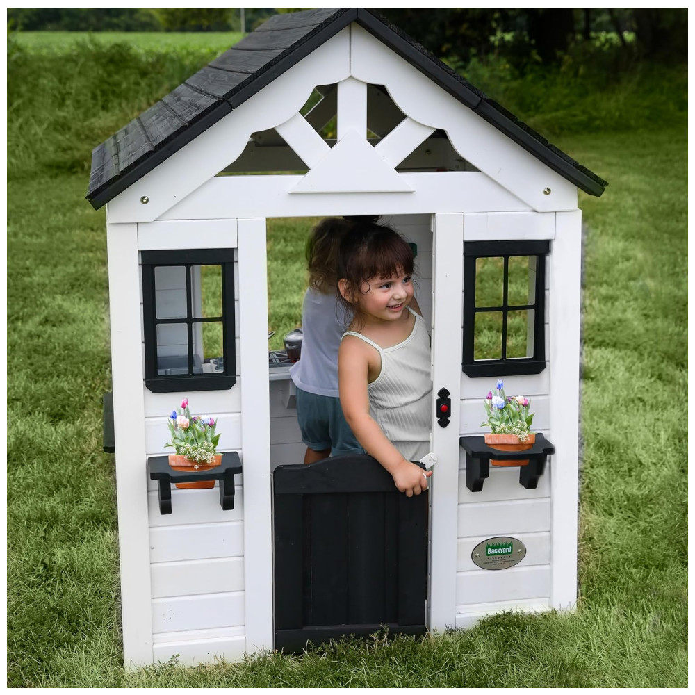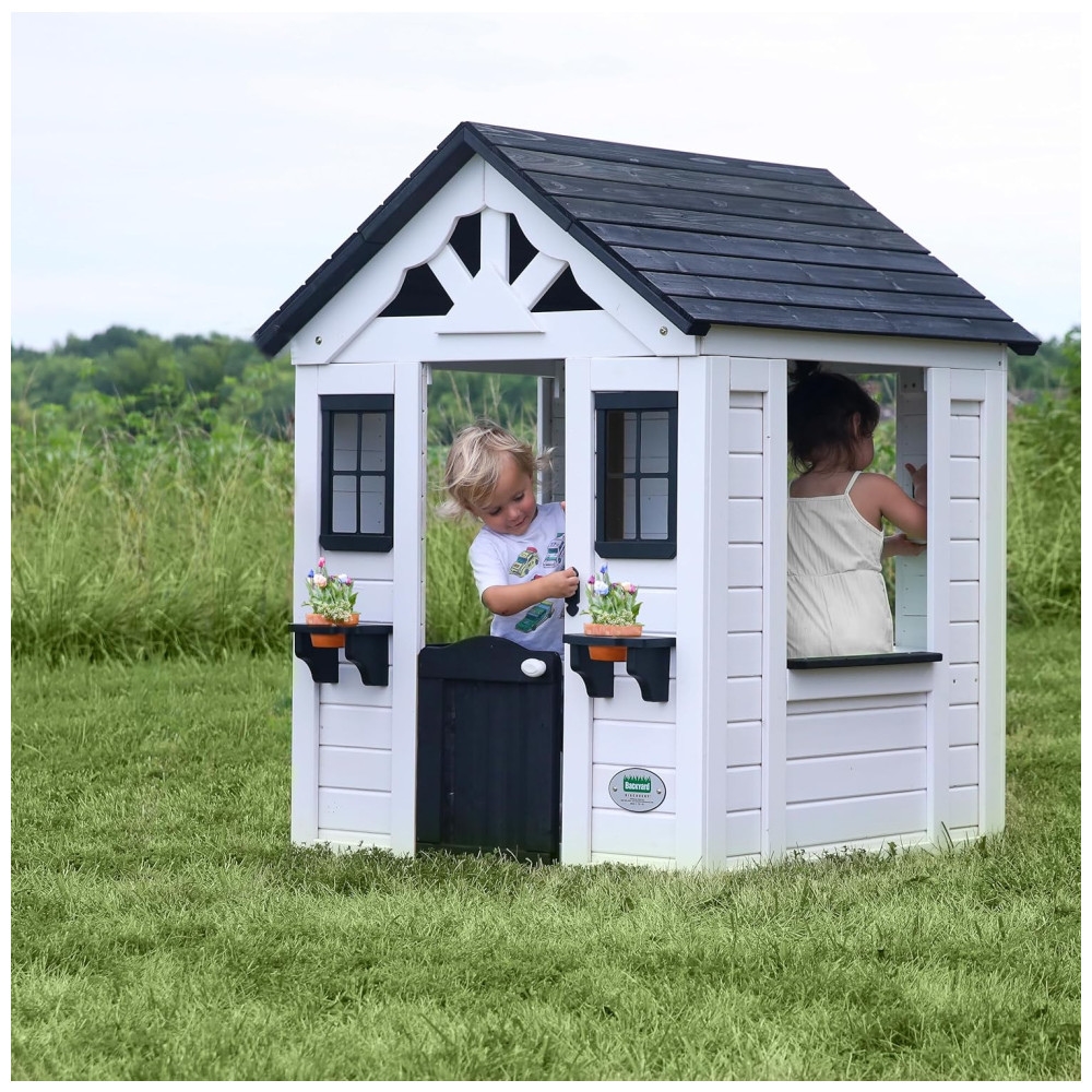 Casinha Infantil de Madeira para Área Externa com Porta Estilo Country Campainha e Suportes para Vasos de Flores Backyard Discovery 2303010 Branco