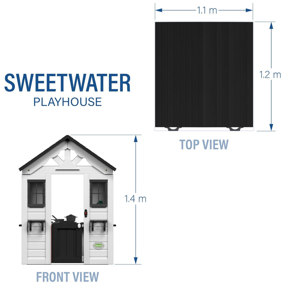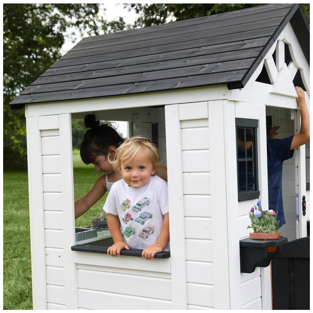Com um design moderno e clean, a Sweetwater se adapta facilmente a qualquer espaço de recreação infantil. Suas janelas amplas com detalhes em preto permitem a entrada de luz natural e uma brisa agradável. A parte da frente é decorada com suportes para vasos de flores, trazendo um toque especial para qualquer estação do ano. A porta de meia porta é prática e estilosa, facilitando o acesso dos pequenos.