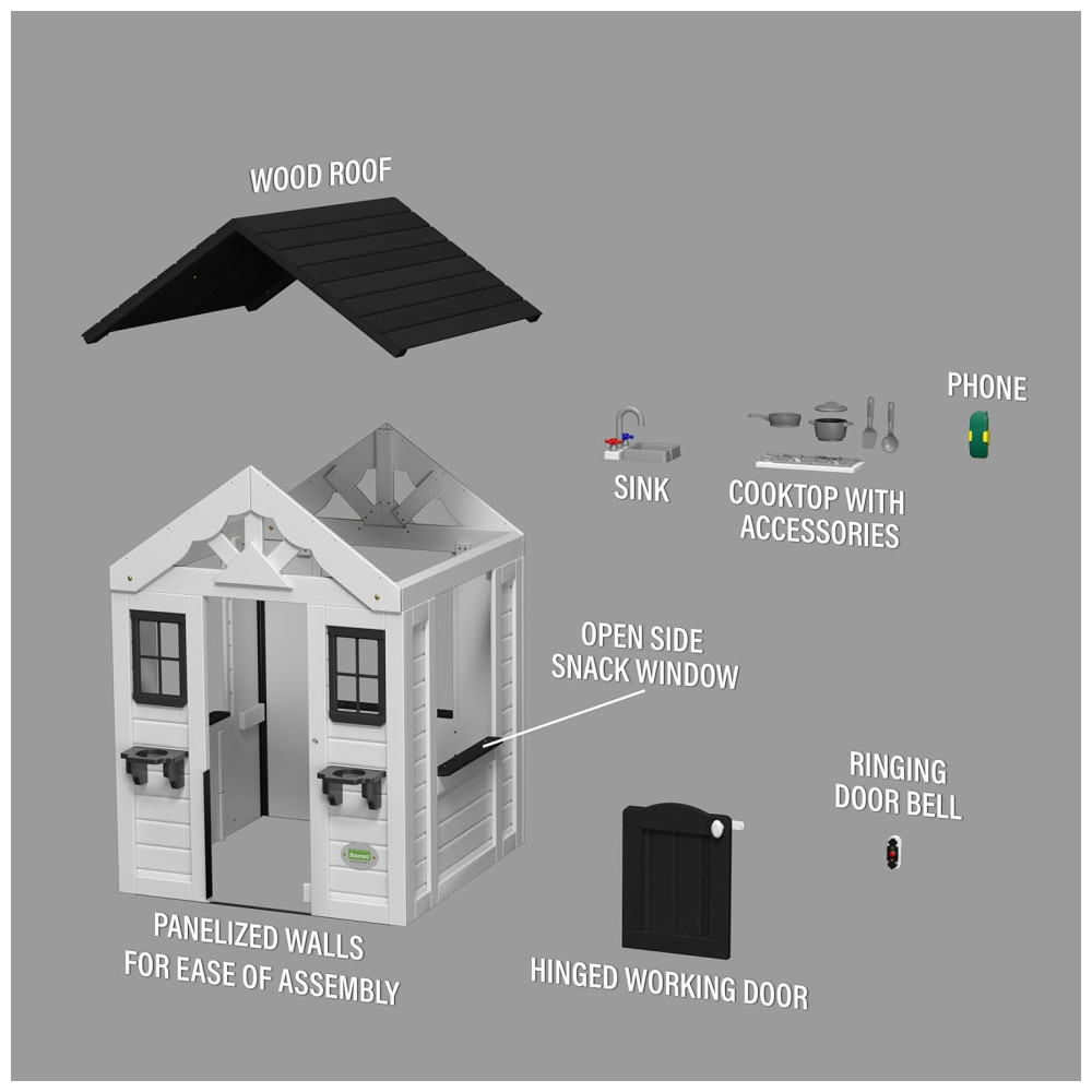 Além disso, a casinha conta com uma janela de lanche, ideal para servir bebidas geladas em dias quentes e para muitas outras brincadeiras criativas. No interior, a diversão continua com uma pia, um fogão e um telefone sem fio, estimulando a imaginação das crianças.