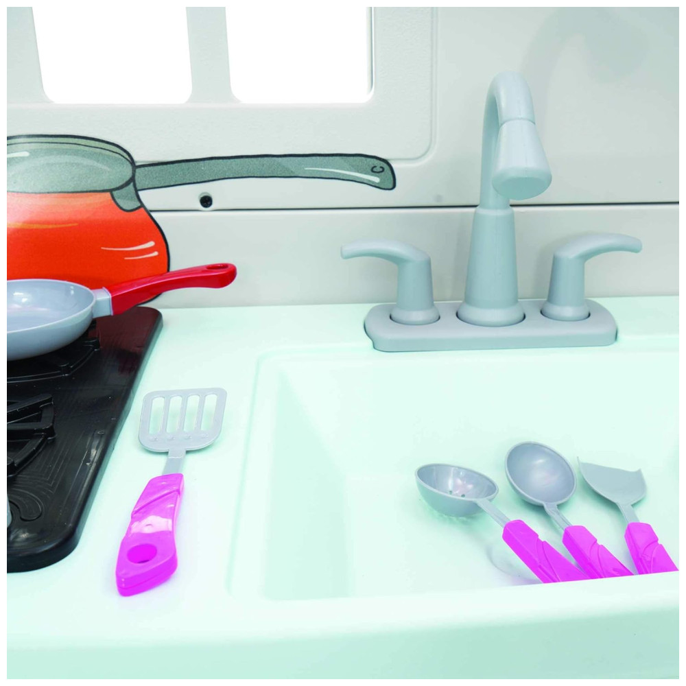 A Playhouse Lifetime é ideal para qualquer superfície do quintal e pode ser facilmente movida conforme necessário. O telhado e as paredes protetoras garantem que a casa de brinquedo seja um refúgio perfeito contra os elementos. Com uma combinação de pia e fogão, comida de brinquedo, panelas e utensílios incluídos no interior, as crianças podem explorar e se divertir de maneira criativa.
