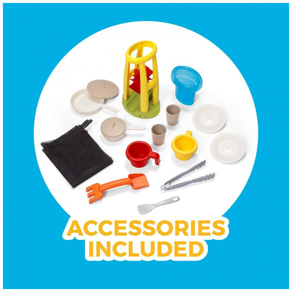 JOGO INTERATIVO DE 360 GRAUS As crianças podem usar o playset da churrasqueira e desfrutar de uma refeição à mesa. Eles podem lavar a louça na pia embutida ou brincar na areia e no lençol freático embutidos. Um kit de acessórios de 16 peças incluído para brincadeiras de faz de conta aprimoradas.