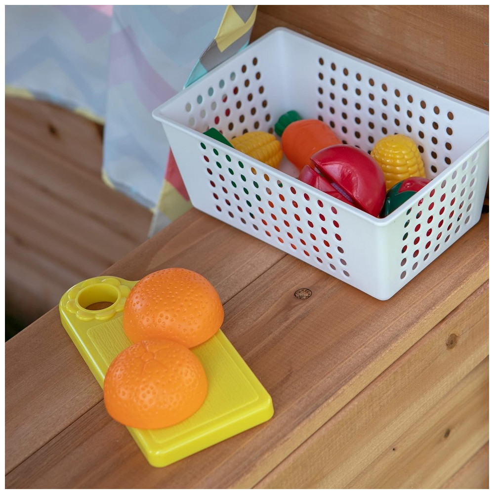 Kitchenette, com frutas fatiáveis e cesto de legumes completo com faca de plástico e tábua de cortar