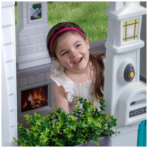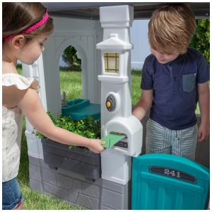 CARACTERÍSTICAS INTERATIVAS De persianas a uma campainha eletrônica a uma caixa de correio de passagem, esta casa de brincar infantil tem muitos recursos realistas para aprimorar a brincadeira de faz de conta. As crianças podem se revezar cozinhando, lavando pratos, sentando na mesa moldada, fazendo ligações e regando flores.