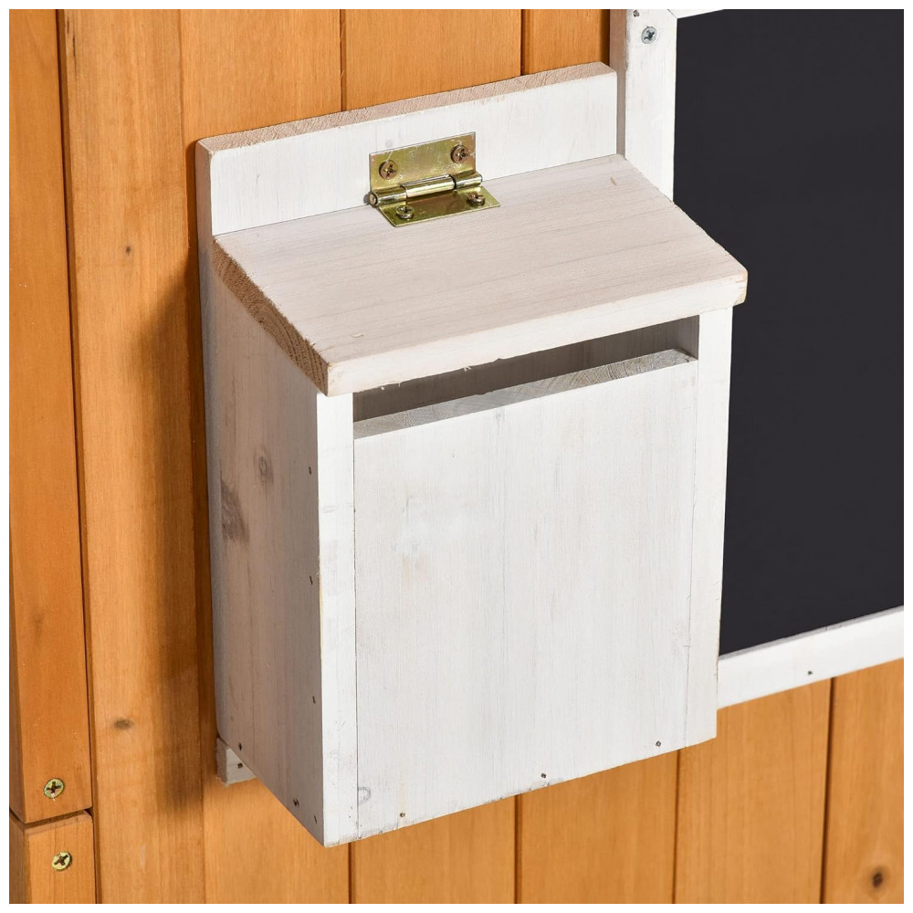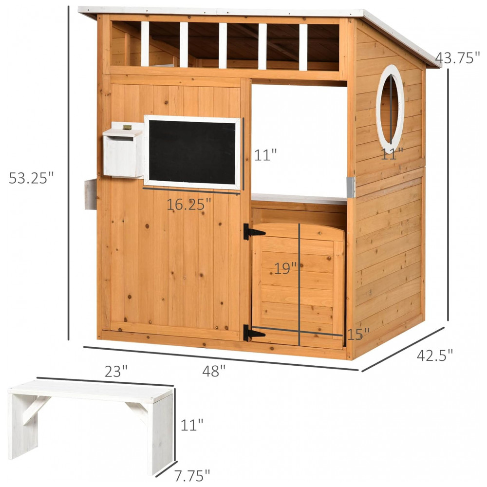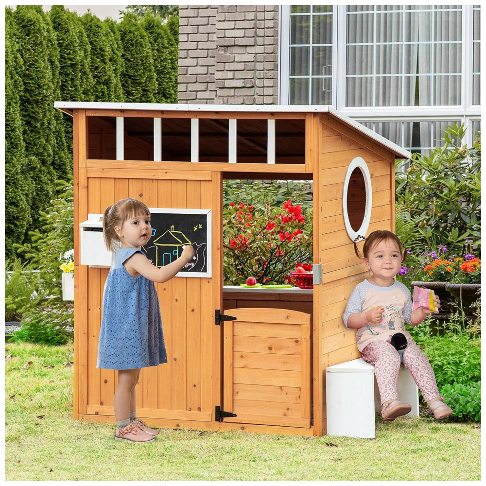 BRINQUEDO DE MADEIRA PARA CRIANÇAS Dê aos seus filhos um lugar para brincar ao ar livre com este teatro de quintal. Este teatro ao ar livre inclui uma porta, janelas, caixa de correio, quadro negro, banco, estação de serviço e suporte para vaso de flores.