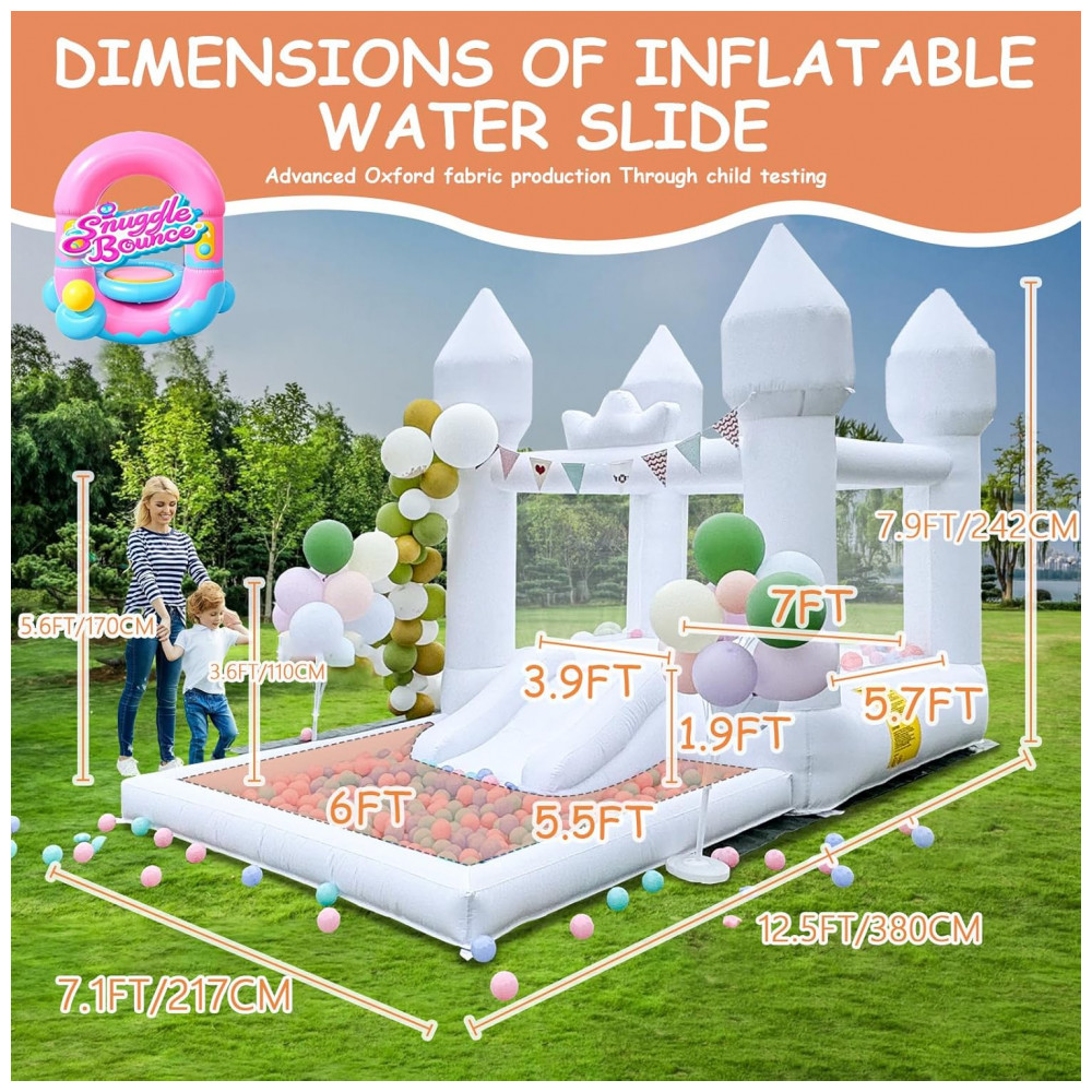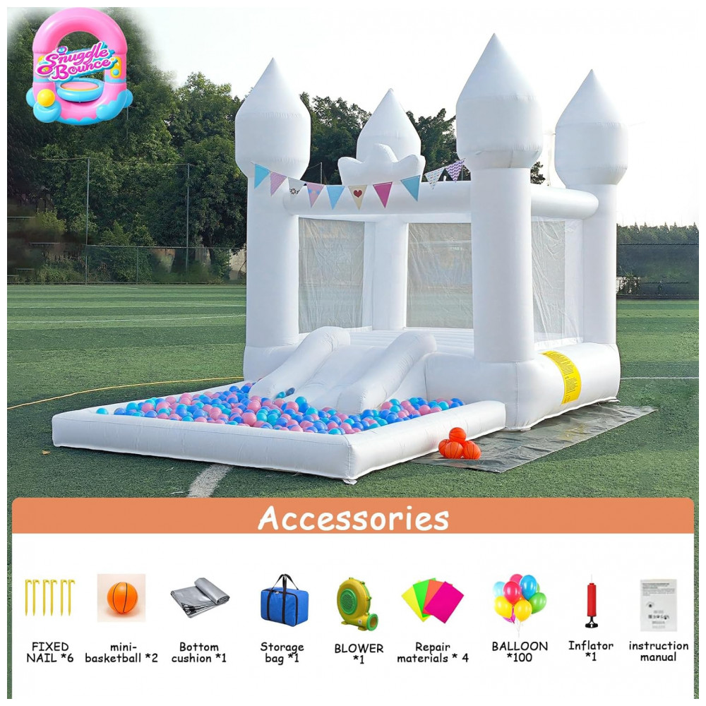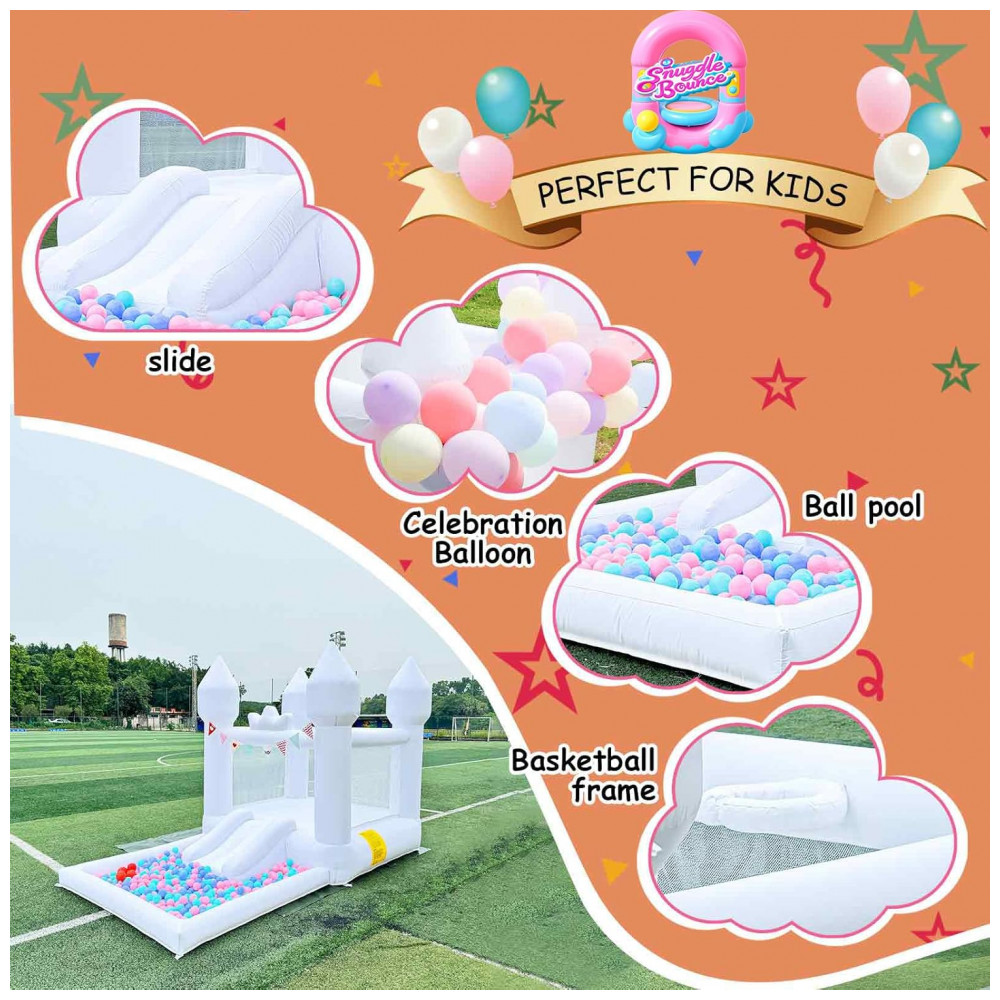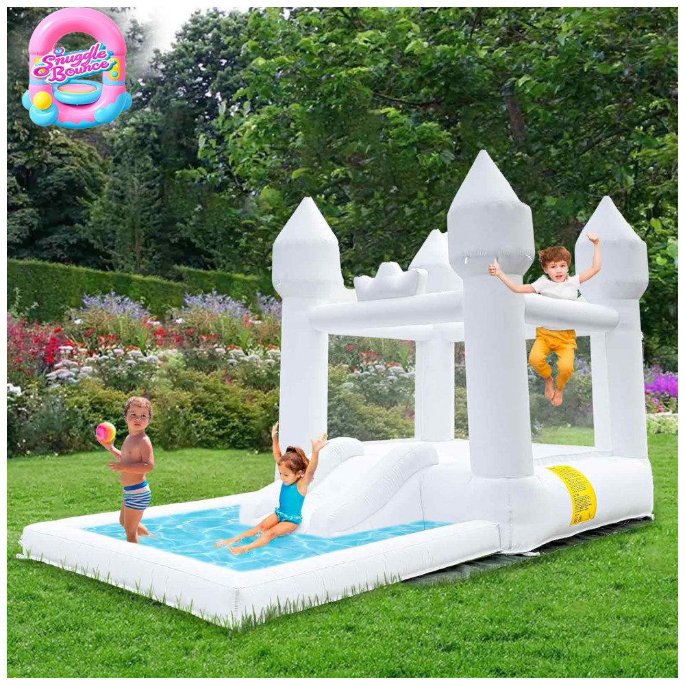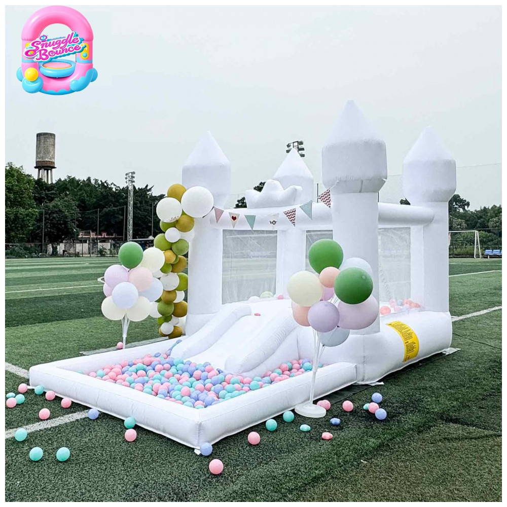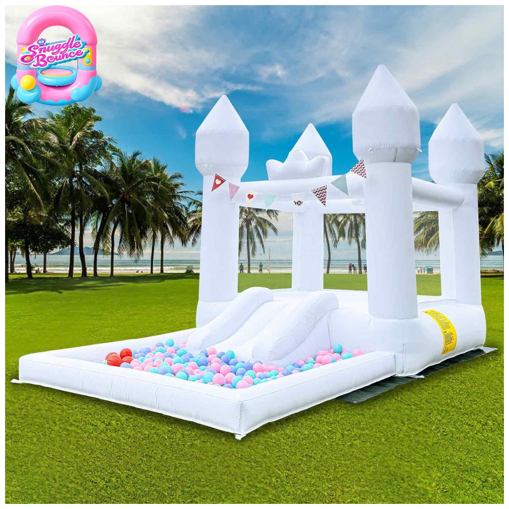Castelo Inflável Branco com Escorregador Inflável e Piscina – Decoração de Casamento para Crianças e Adultos em Festas de AniversárioSnuggleBounce