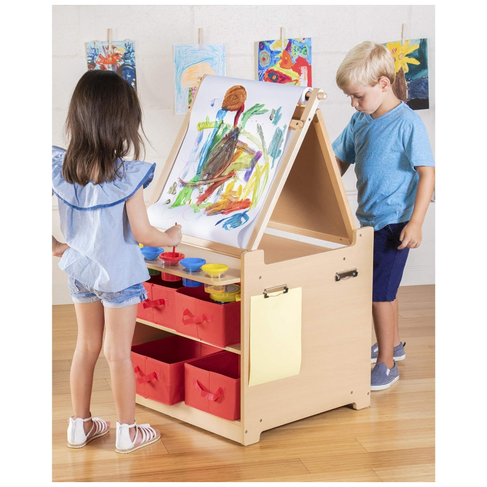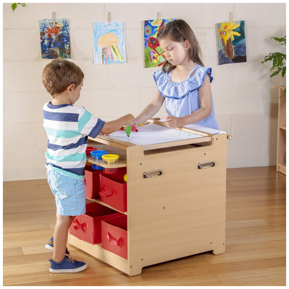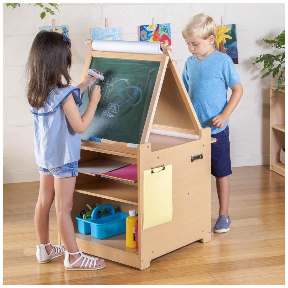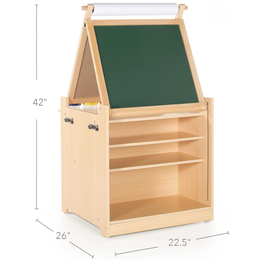 Cavalete infantil 2 em 1 Guidecraft Natural com mesa de arte lousa branca lousa de giz e carrinho com nichos