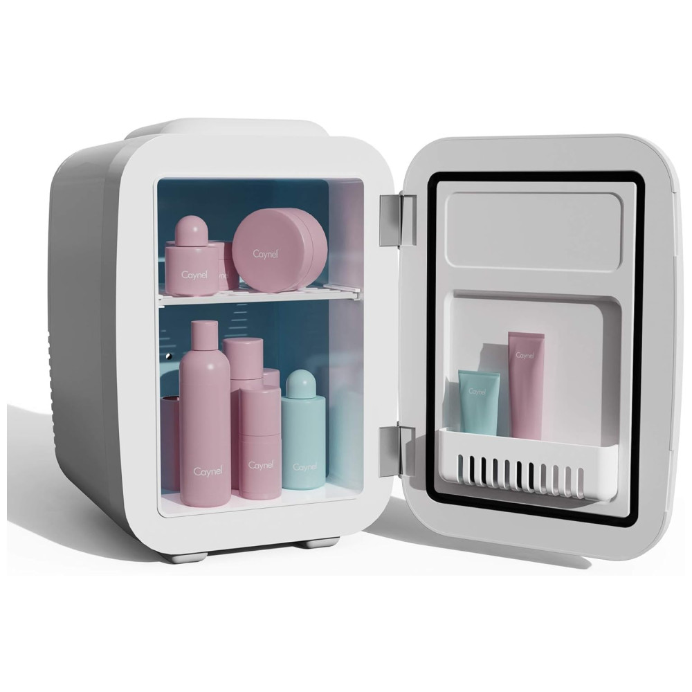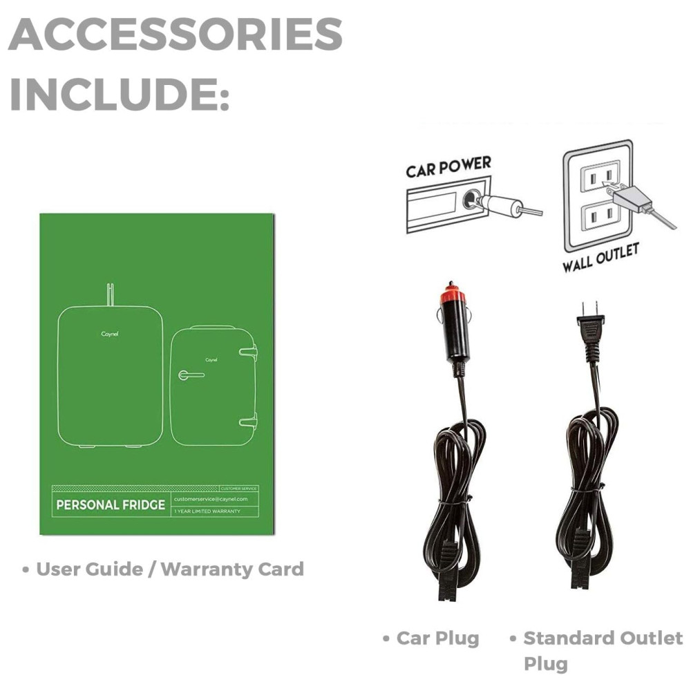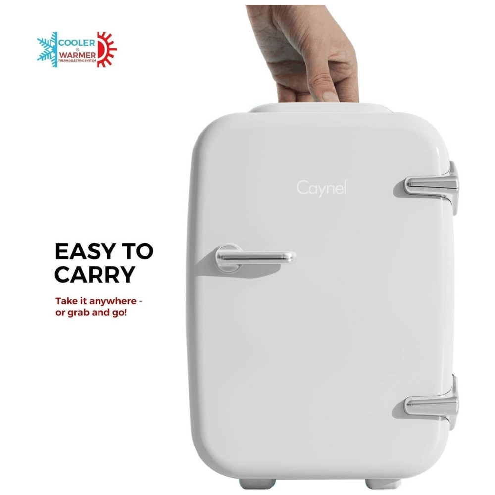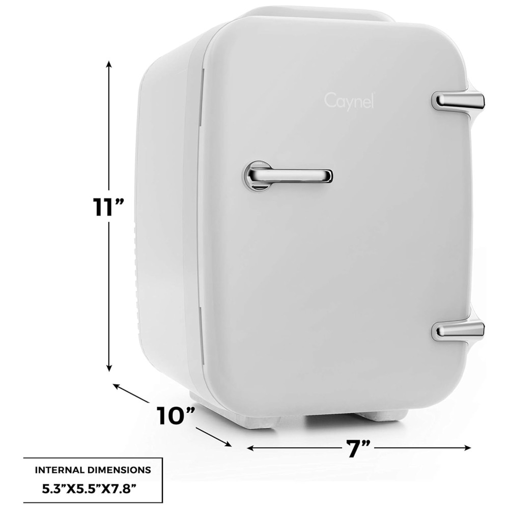 COMPACT PORTABLE Caynel cooler, warmer mini fridge chills 6 12oz. cans and is perfectly portable for personal use. Its small size, sleek design and convenient carry handle, makes it easy to take the mini fridge with you on the go COOLING WARMING the Thermoelectric System in the Caynel mini fridge allows for easy switching from beverage cooler to food warmer Easily choose to chill up to 45F or warm up to 140F with the flip of a switch. Well insulated interior holds temperature even after unplugged. GO GREEN the unique semiconductor operation is energy efficient, ultra quiet and 100 environmentally friendly. 100 Freon Free and ETL approved with advanced safety technology for long lasting durability. Includes plugs for both 110V AC standard home outlets and 12V car chargers. Use at home or on the road MULTIFUNCTIONAL its portable profile sports a generous 4 liter capacity. Great for personal spaces, road trips, camping and more Includes removable shelf so you can store small items such as food, drinks and snacks. Efficient cooling temperature is perfect for skincare and beauty essentials. Store your skincare, personal care beauty product faves SPECIFICATION WARRANTY unit measures 7.2 W x 9.95 D x 10.83 H and weighs 4 lbs. The Inner dimensions 5.3 L x 5.5 D x 8.3 H, Cooling Capacity 40F 45F below ambient temperature, Warming Capacity 122F 144F. ETL approved with advanced safety technology for long lasting durability, 1 year hassle free warranty provided by Caynel. For information on how to use your product, scroll down for a PDF user guide.