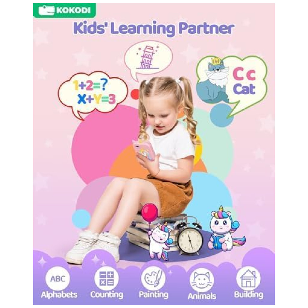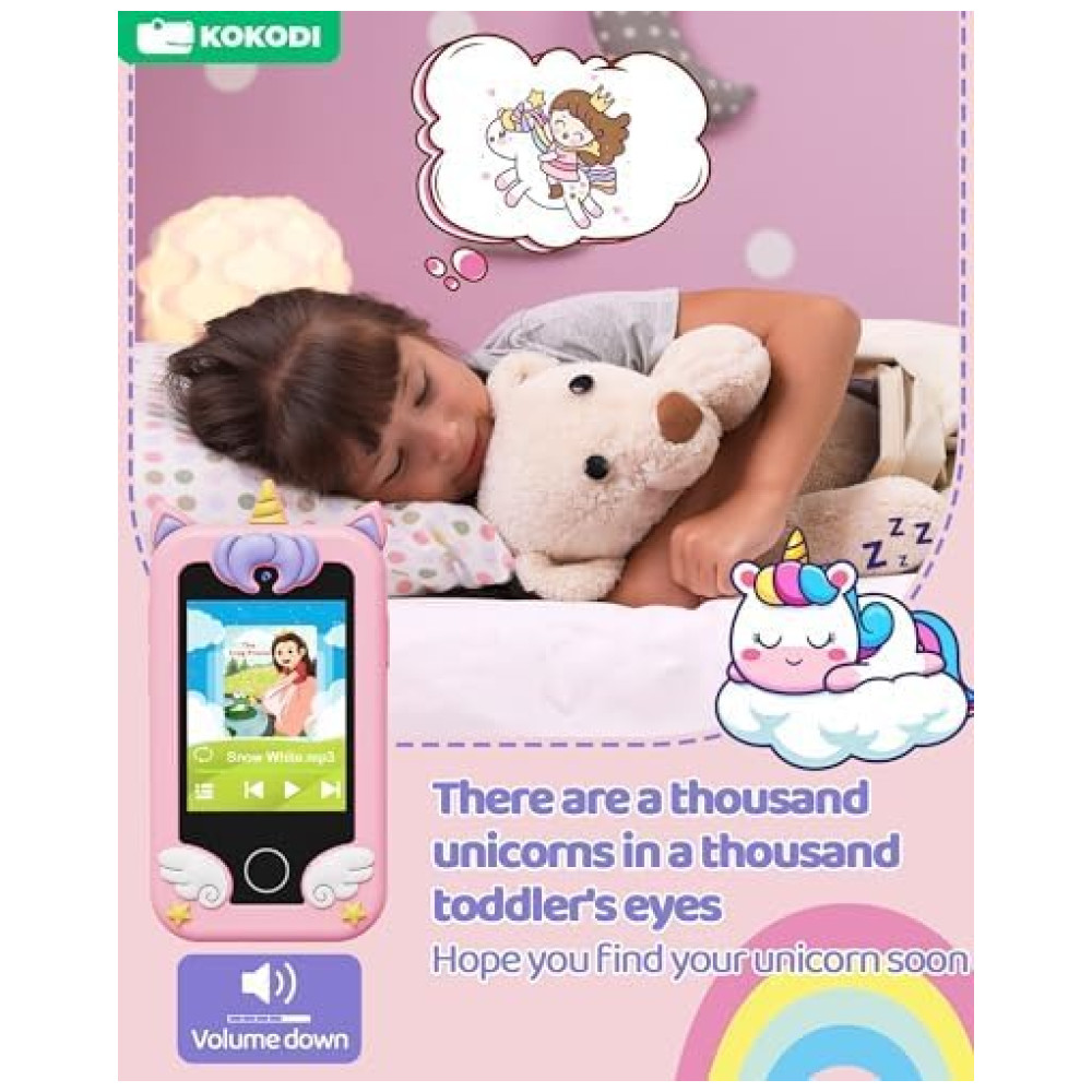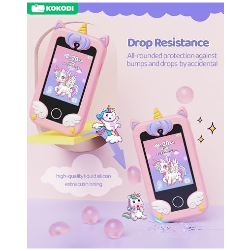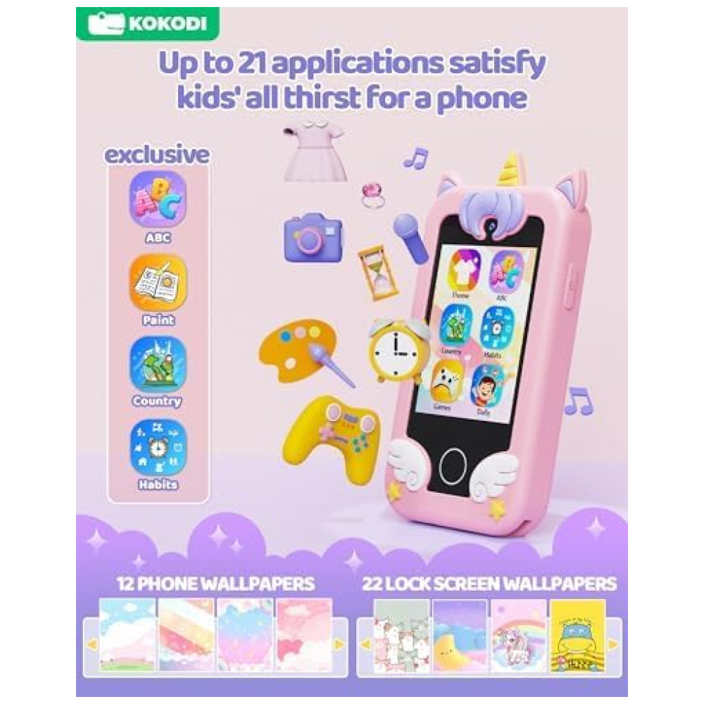 Celular Brinquedo KOKODI Unicorn com tela sensível ao toque câmera dupla HD ideal para meninas de 3 a 10 anos presente educativo e divertido.