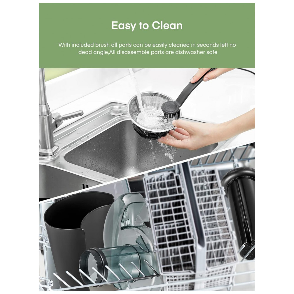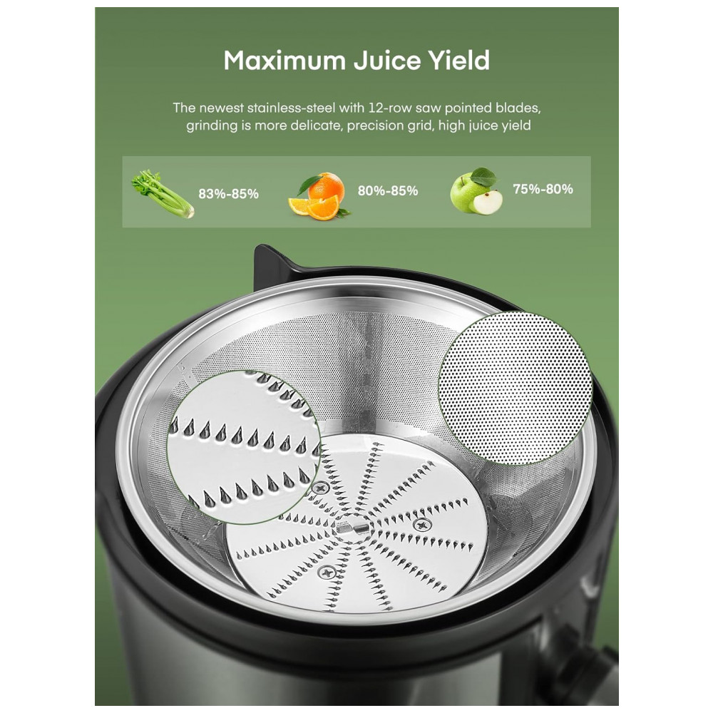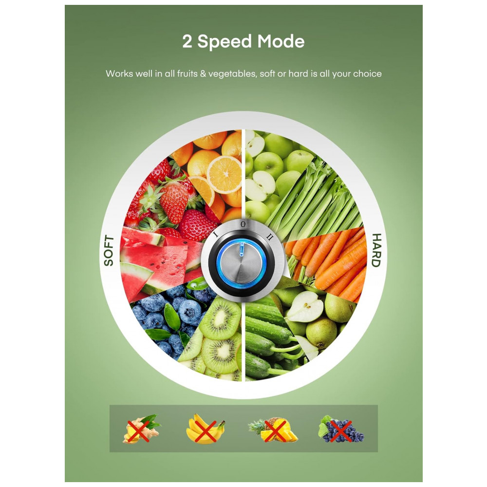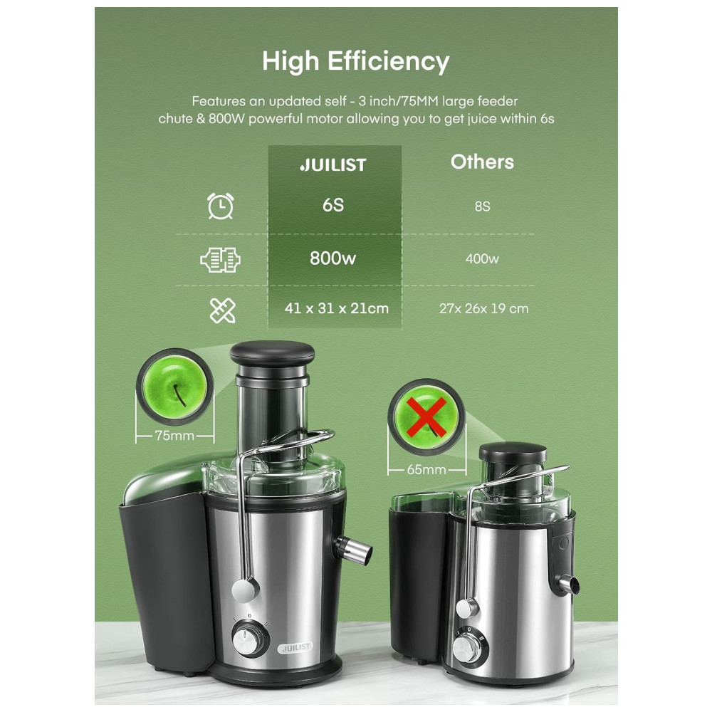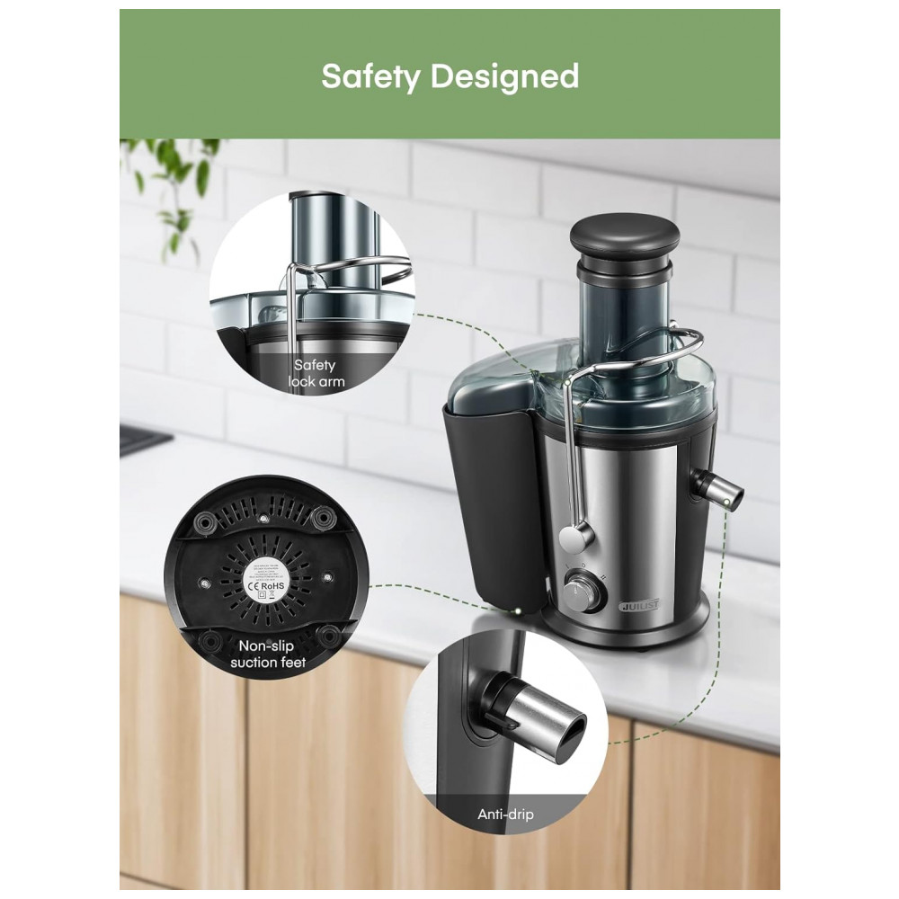 Este Juilist Juicer é a escolha perfeita para quem busca praticidade e eficiência ao fazer sucos frescos. Com um motor potente de 800 W, este espremedor centrífugo pode fazer suco em apenas 6 segundos, tornando o mais rápido e potente que outros modelos concorrentes. Sua lâmina de aço inoxidável 304, resistente à corrosão, foi recentemente atualizada e é larga o suficiente para capturar todos os pedaços de frutas, garantindo altos rendimentos de suco. Com um filtro de malha de três camadas, o suco feito é puro e saudável. A grande calha de alimentação de 3 polegadas de largura permite que frutas e vegetais sejam processados rapidamente, sem a necessidade de muito tempo de preparação. Este espremedor possui duas velocidades diferentes, funcionando bem com frutas macias e vegetais duros. A velocidade certa melhora o rendimento e o desempenho do suco. Sua montagem, remoção, operação e limpeza são fáceis de manusear, graças ao design anti gotejamento e à escova de limpeza inclusa. O Juilist Juicer é equipado com um braço de travamento de segurança e um sistema de proteção contra sobrecarga, garantindo a segurança do usuário.